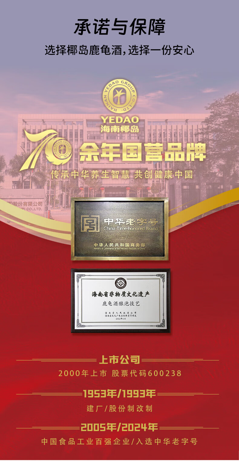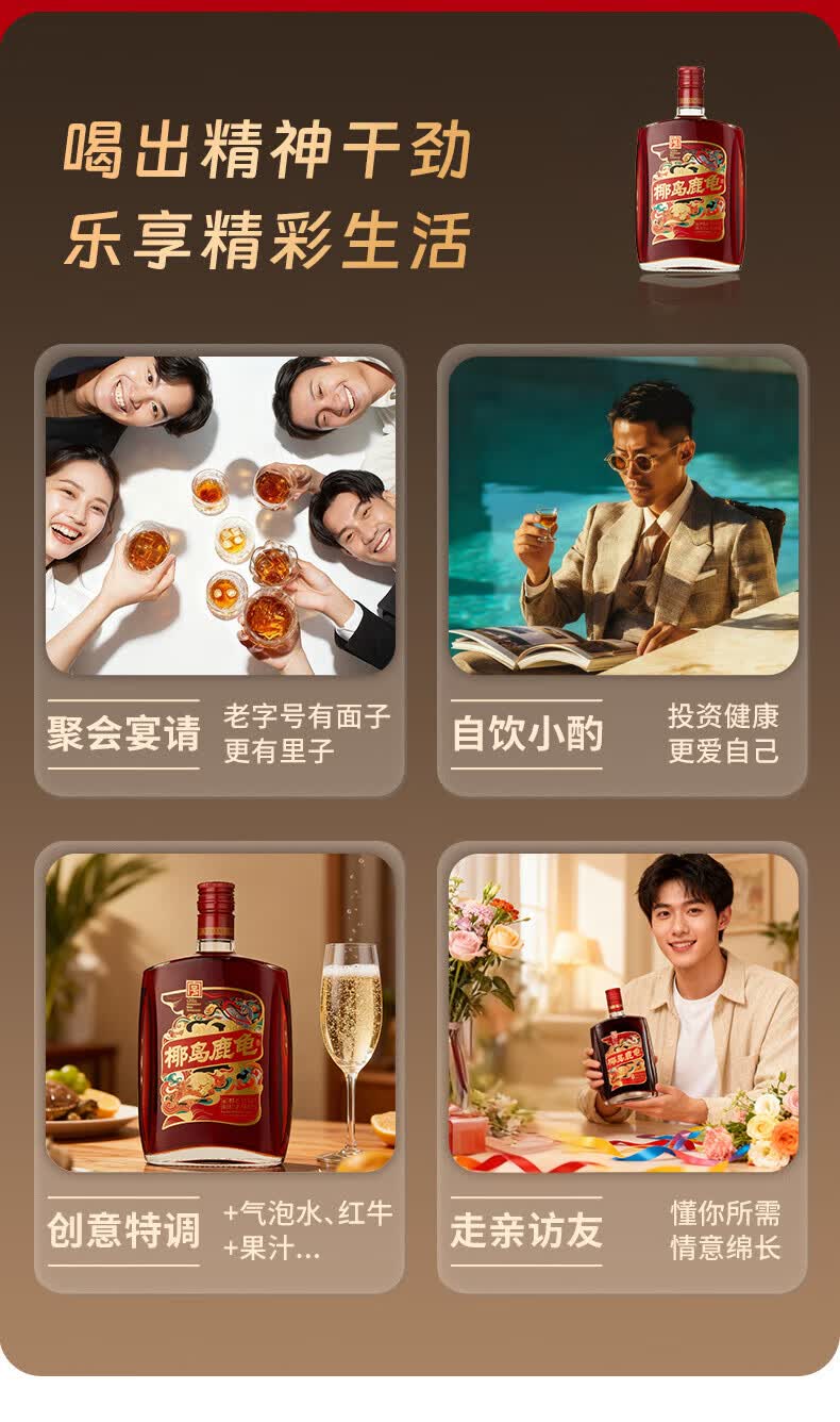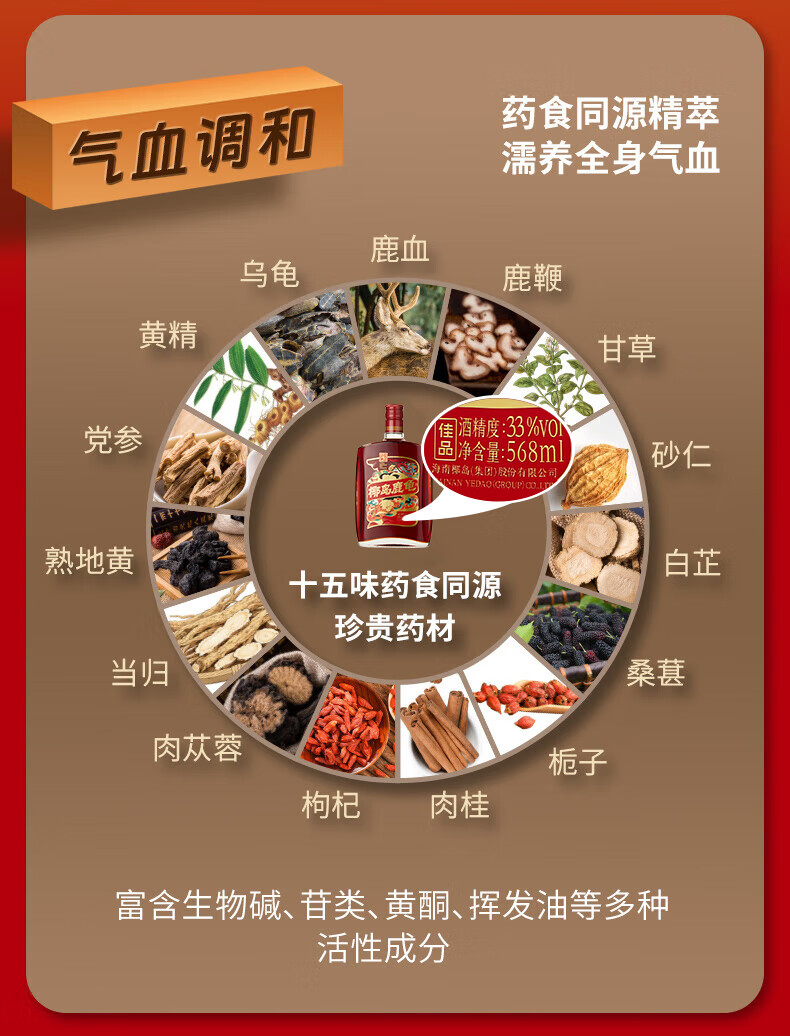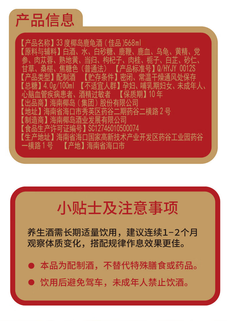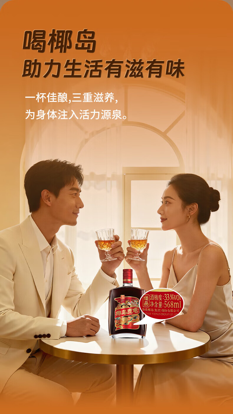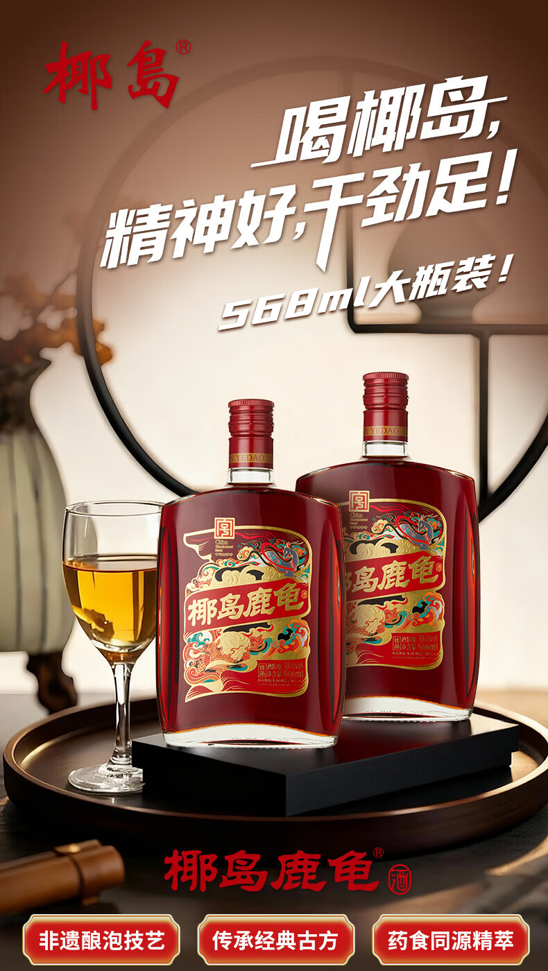 椰岛(YEDAO)鹿龟酒33度养生酒实惠装单只装568ml过节送礼自用