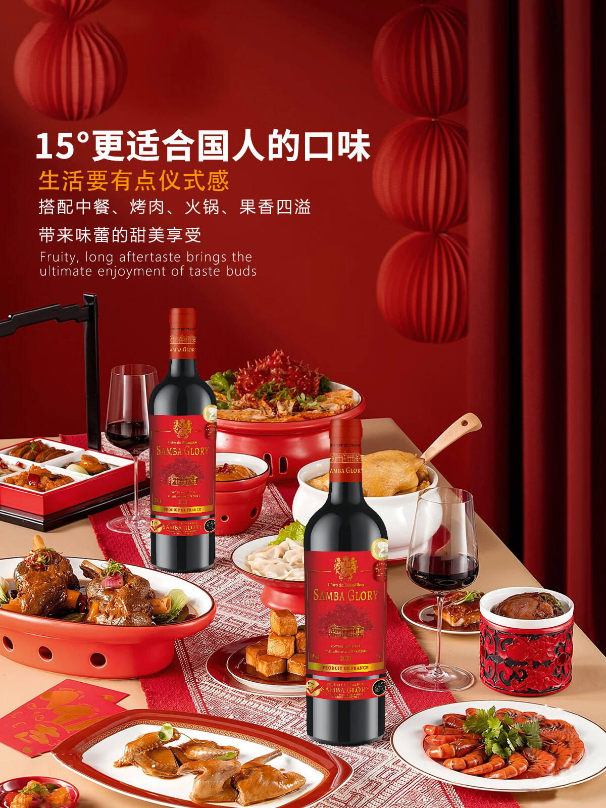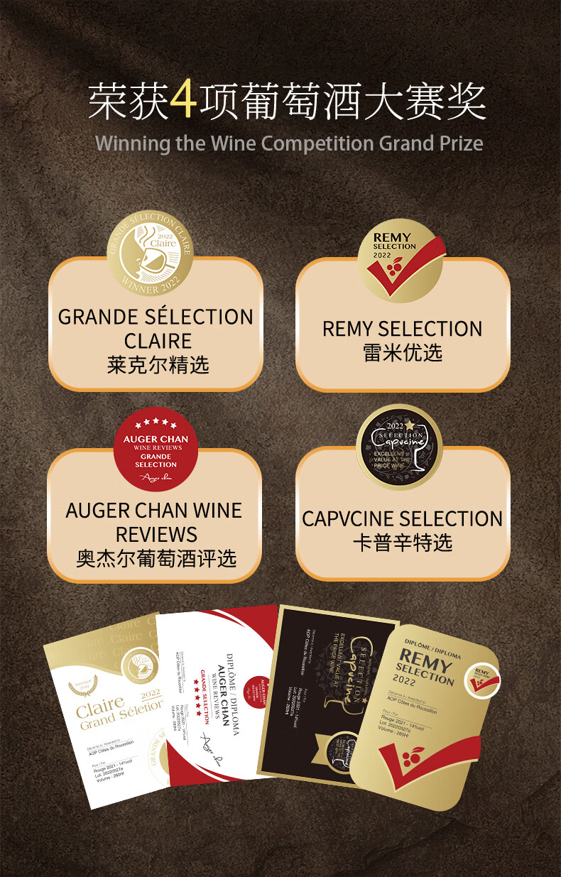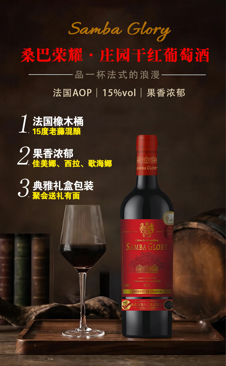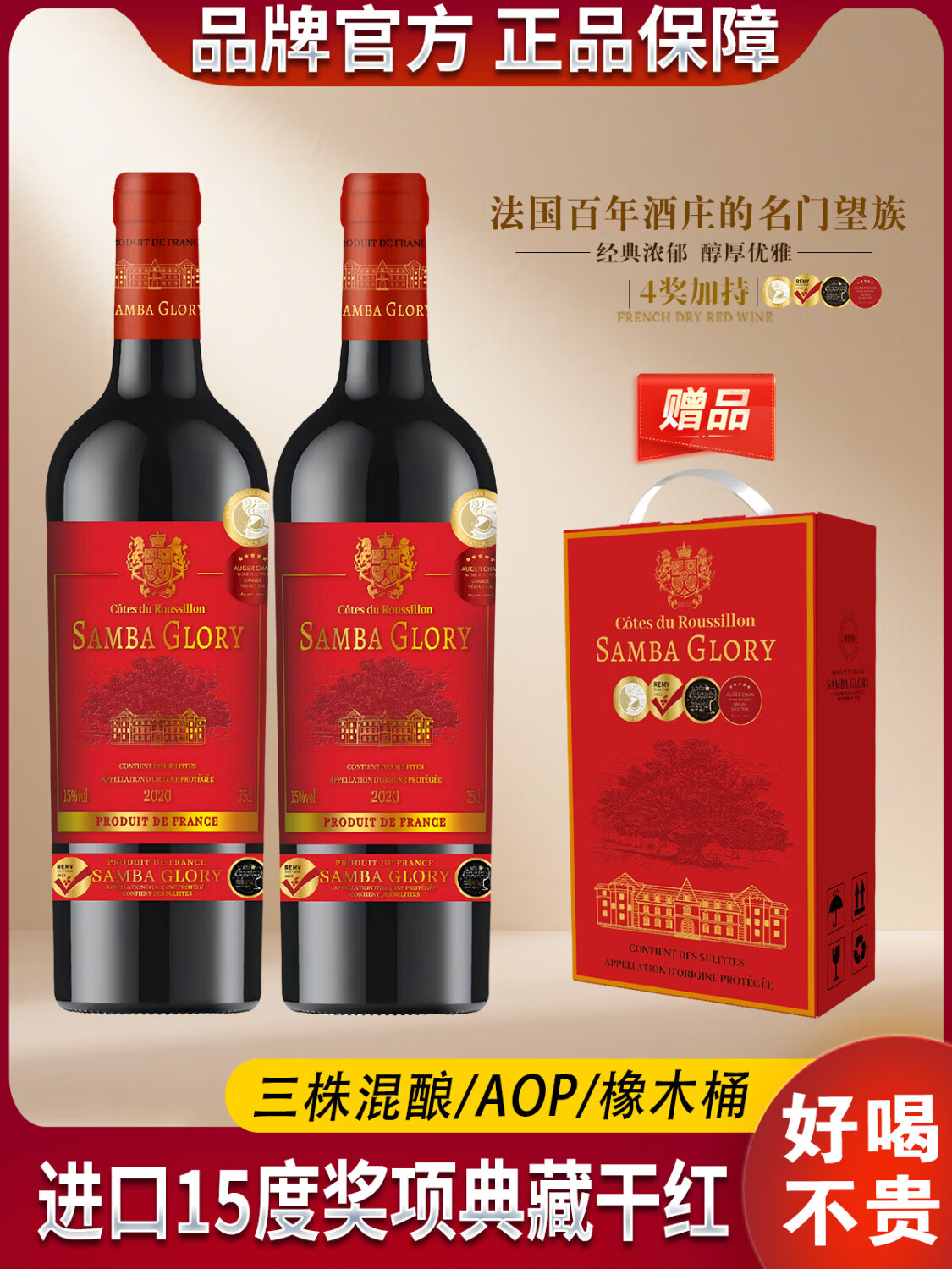 桑巴荣耀【法国红酒礼盒装】15度AOP原装进口干红葡萄酒洋酒750ml*2送礼酒 【性价比之选/4奖15度】4瓶酒+2个礼盒