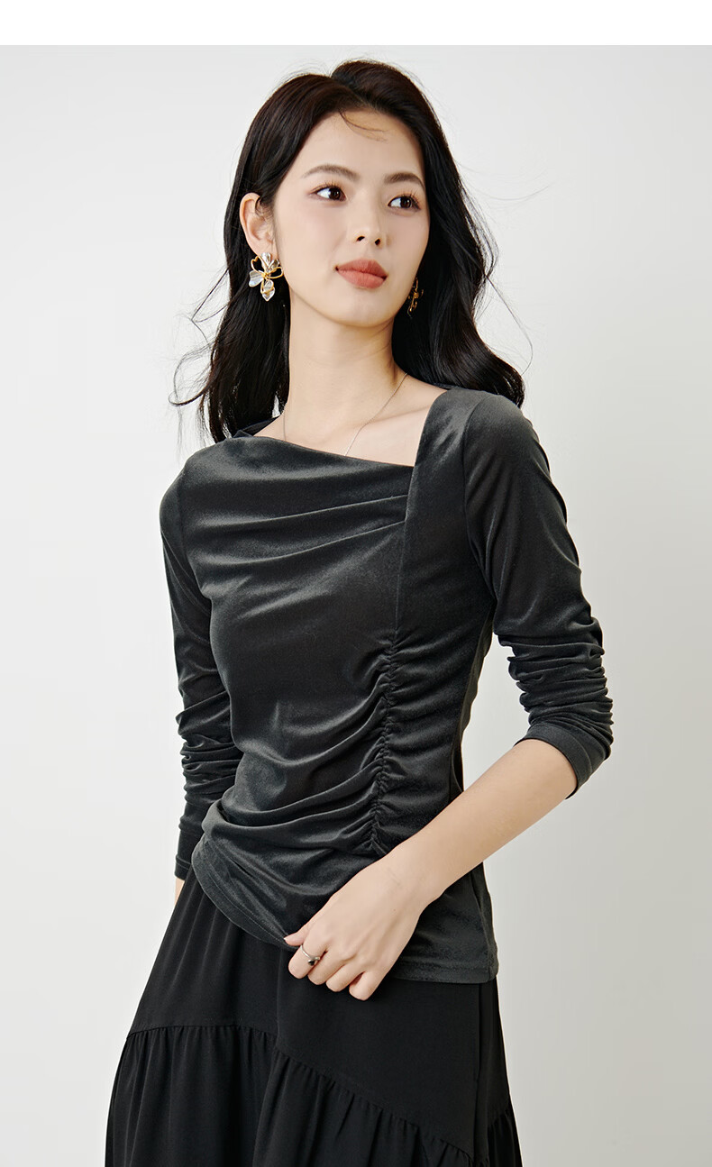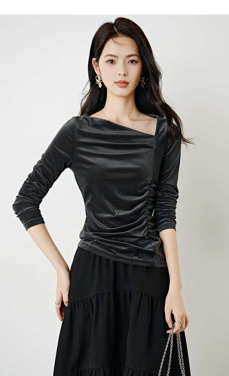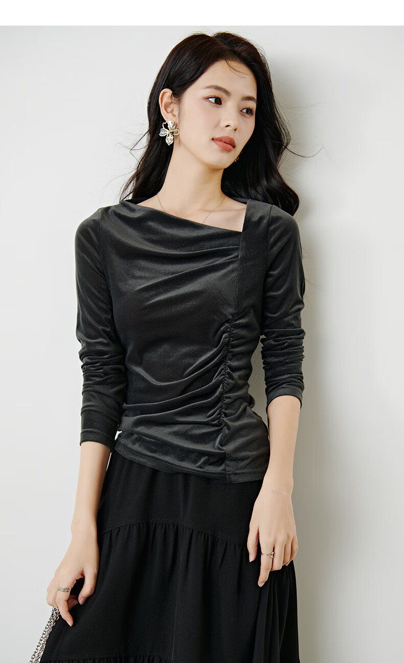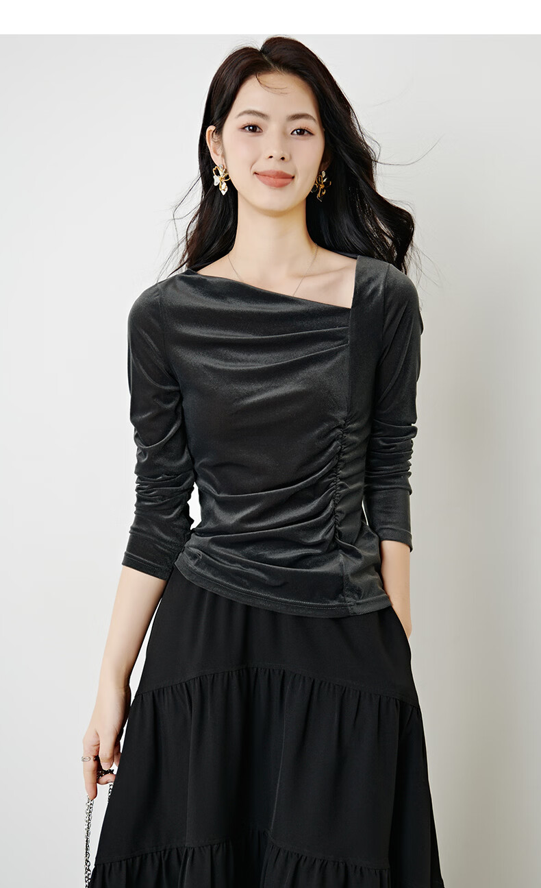晚白【新品】2026年春款时尚优雅丝绒上衣弹力抽褶修身亲肤打底衫女 深灰色 M