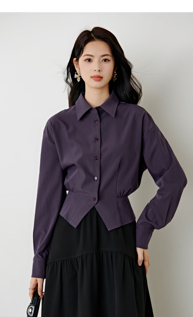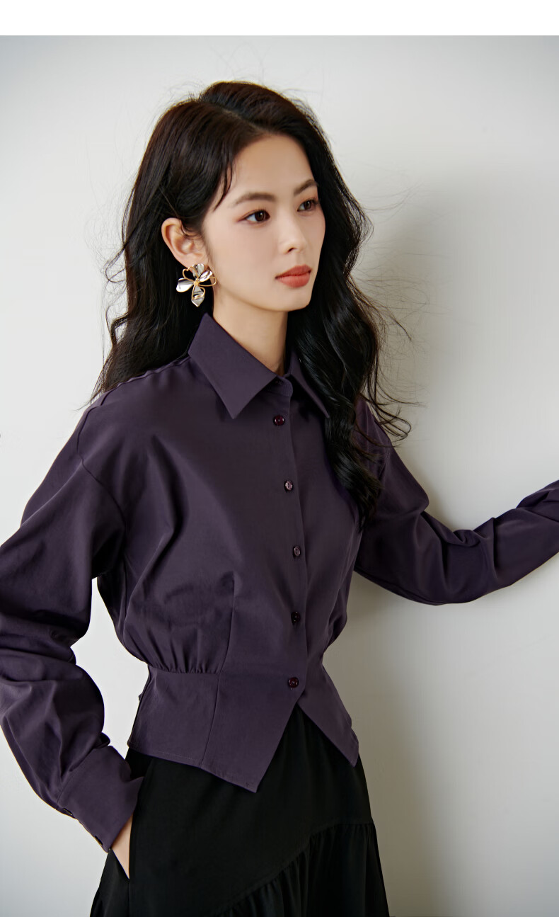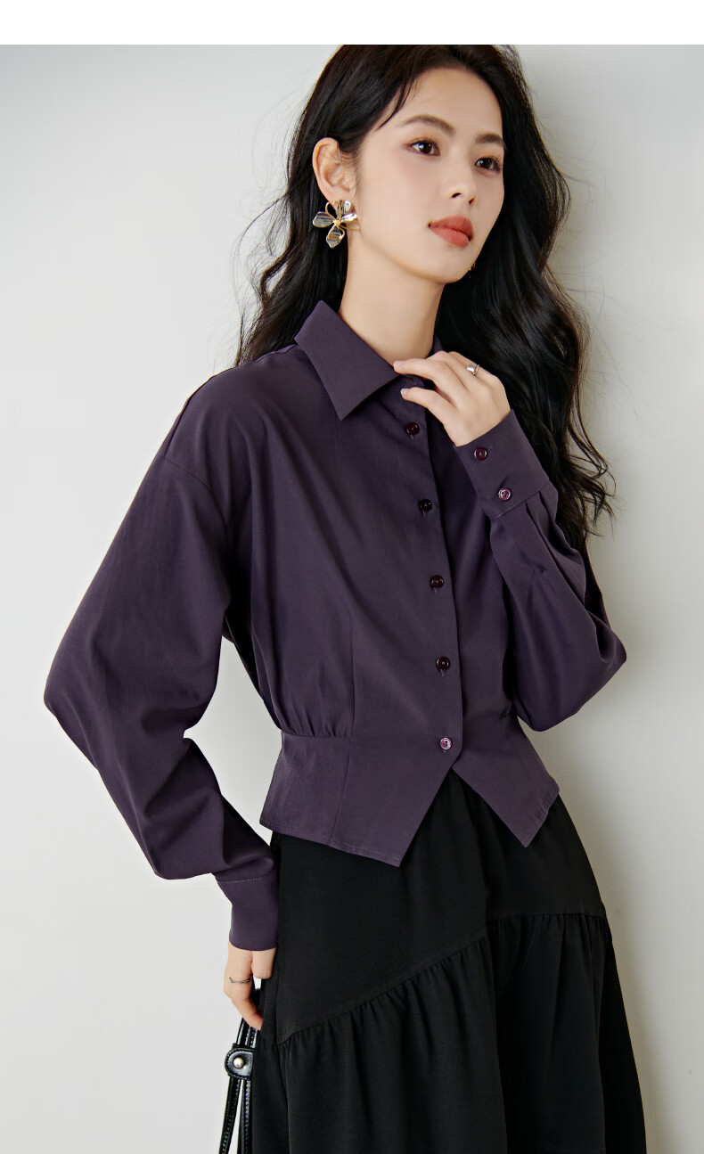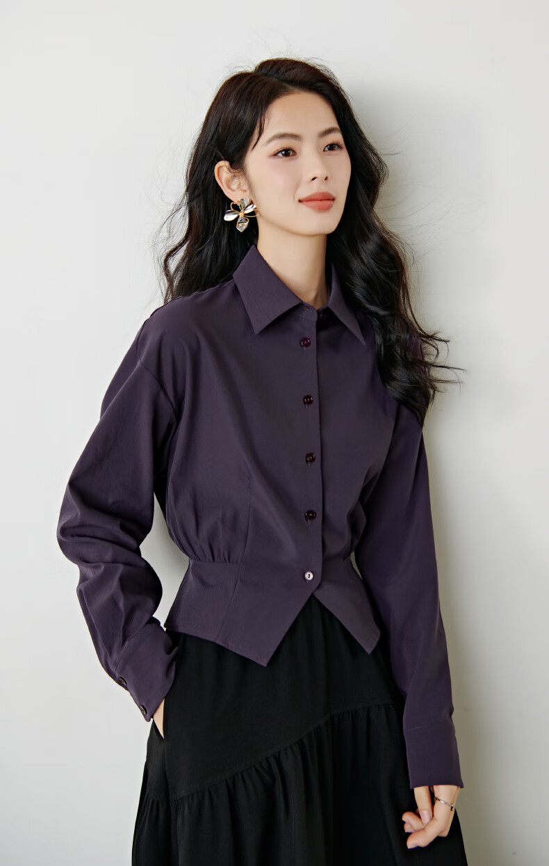 晚白【新品】2026春款翻领法式短款小个子上衣褶皱设计感收腰气质衬衫 紫色 M