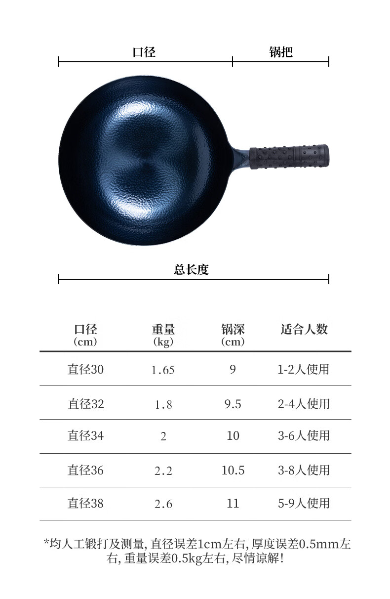 谭铁匠正宗章丘手工铁锅炒菜锅家用炒锅无涂层不易粘锅熟铁锅燃气灶用锅 木柄宗师黑锅款1-2人用【古法十万锤】 30cm