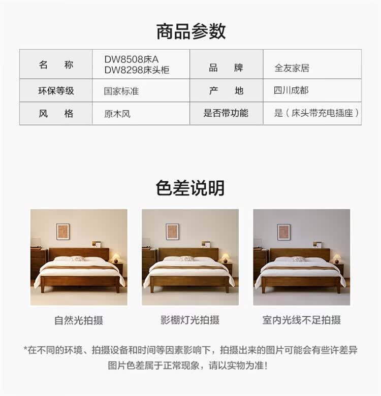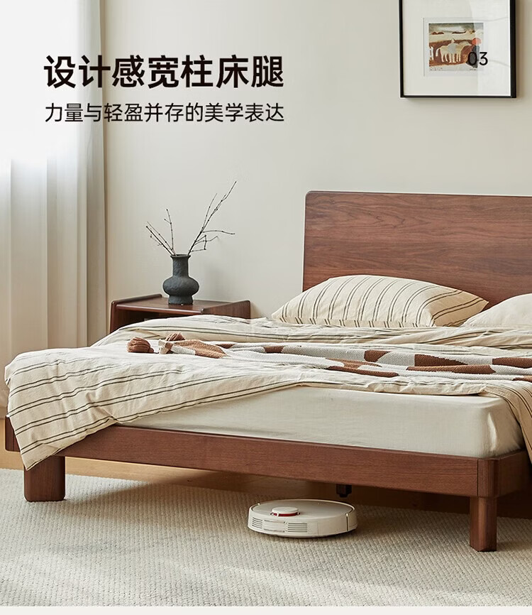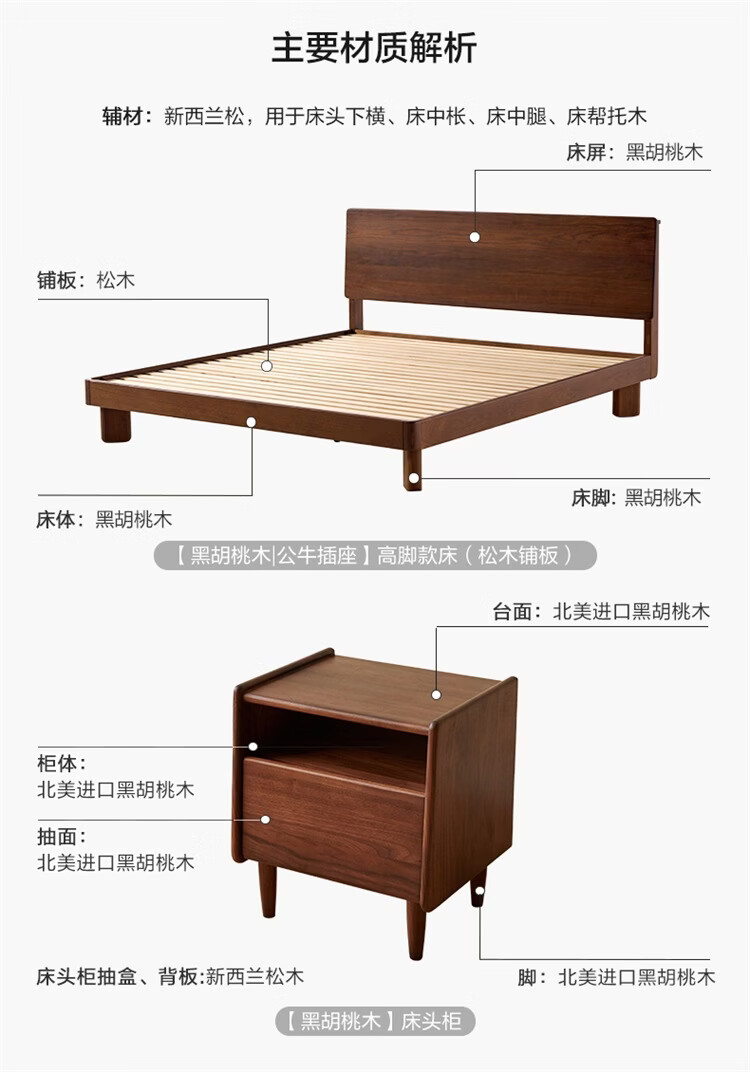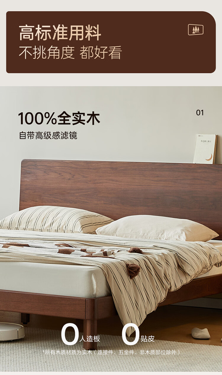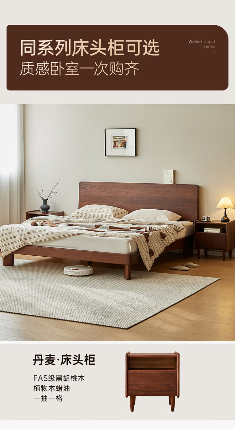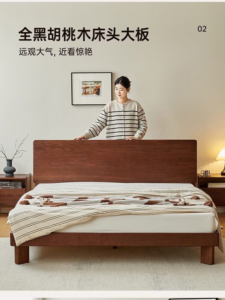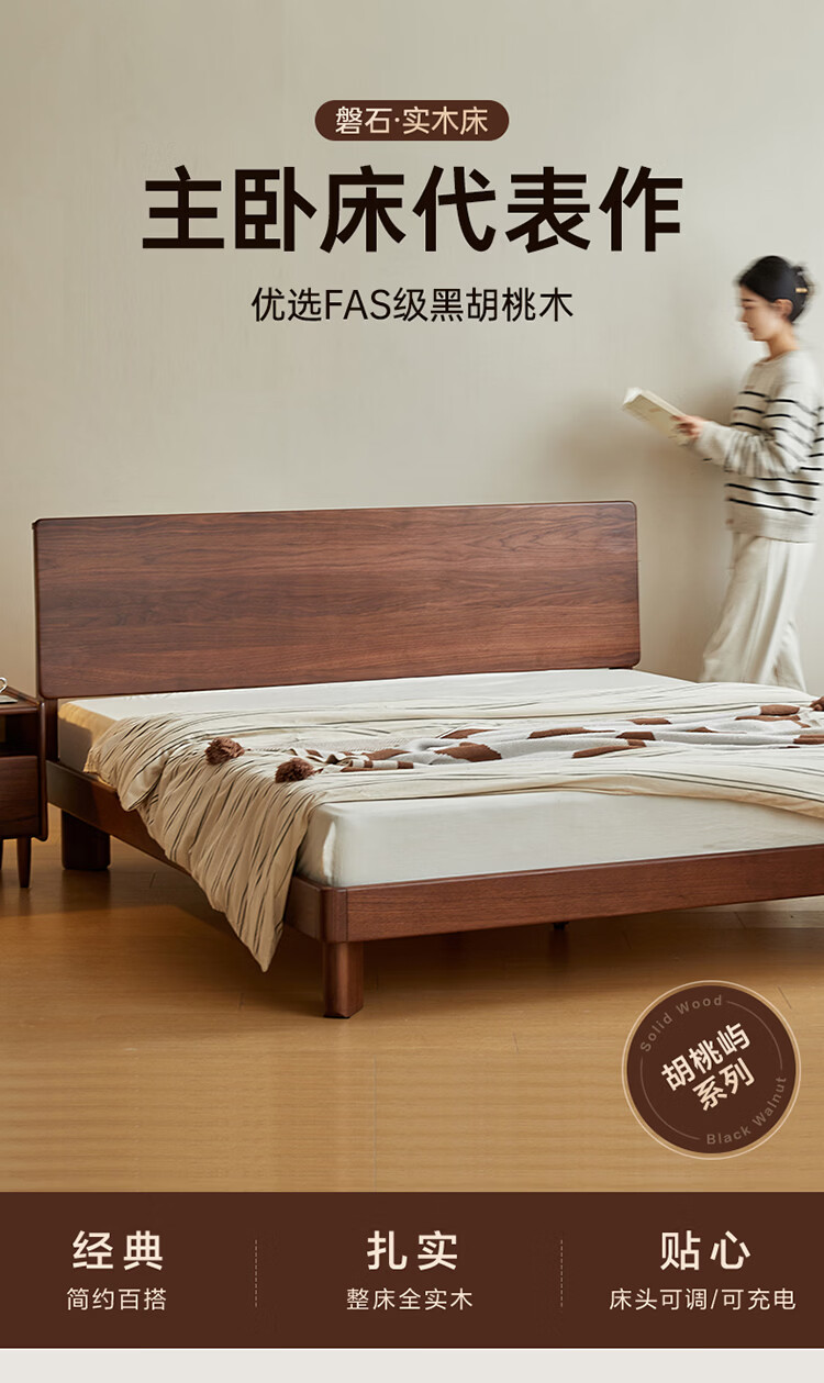 全友家居新中式全实木床家用主卧室多功能床头储物黑胡桃木双人高脚床 松木铺板【黑胡桃木 | 公牛插座】 1.8米x2米 单床