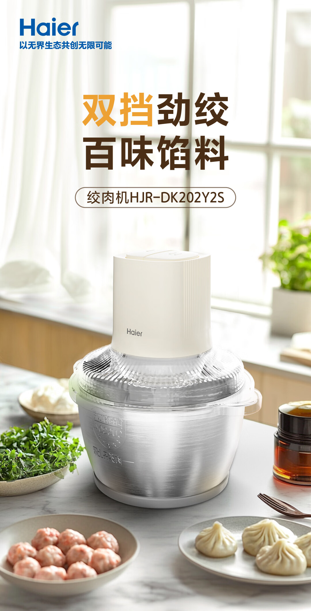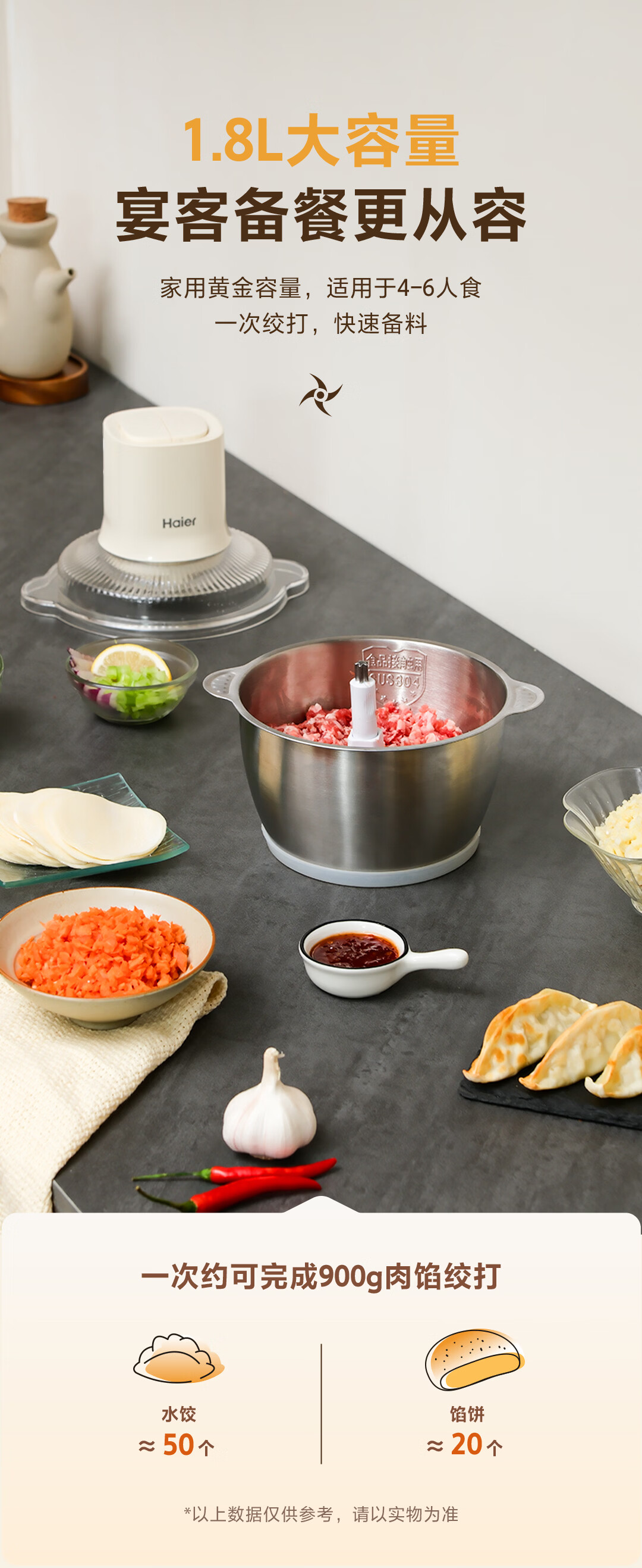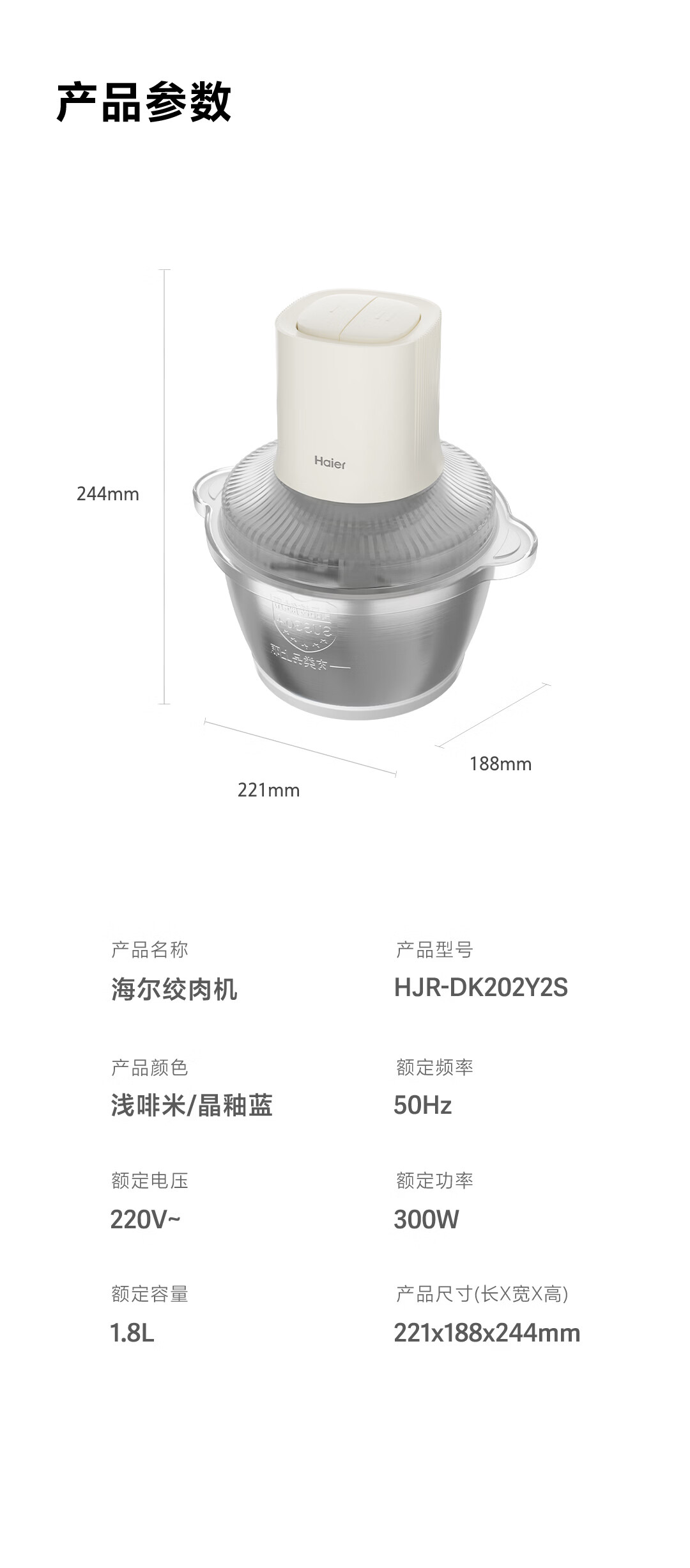 海尔绞肉机 绞馅机 碎肉机 小型电动多功能料理搅拌打肉饺子肉馅 蒜蓉机 1.8L 双刀不锈钢碗HJR-DK202Y2S