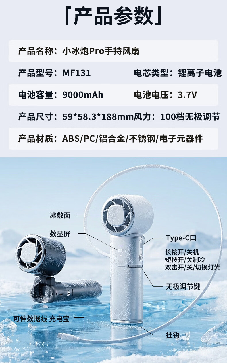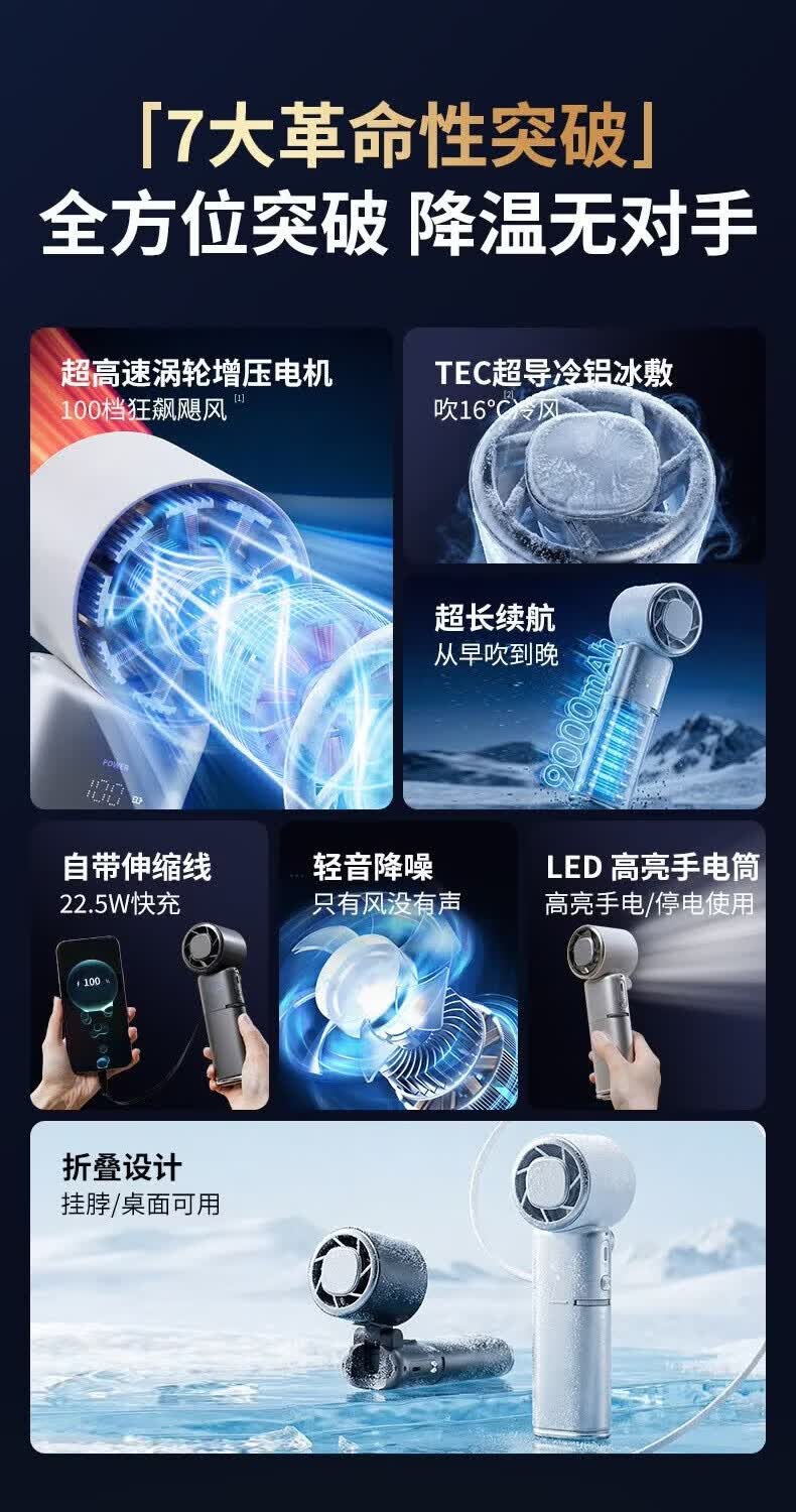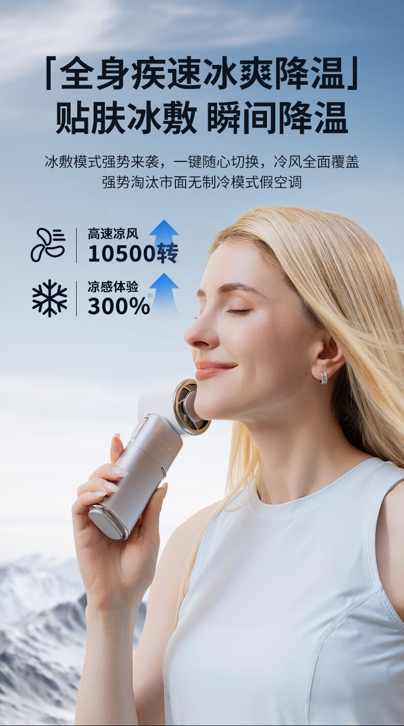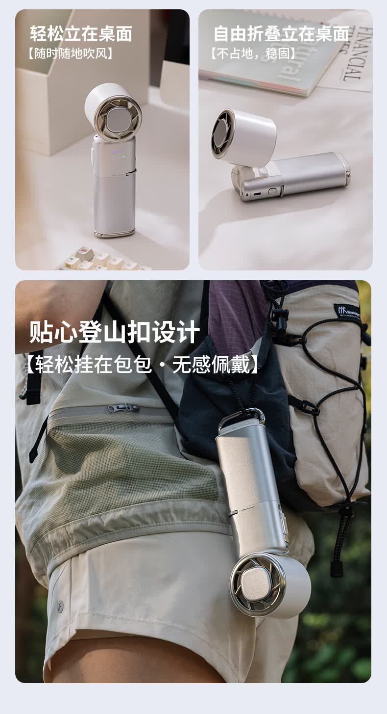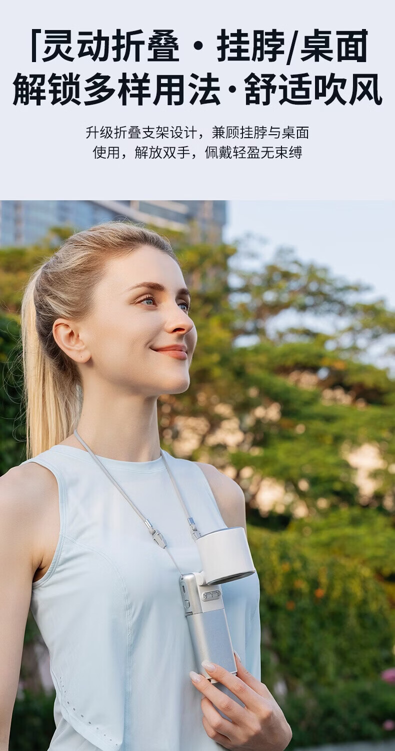 New For2026新款手持小风扇半导体制冷冰敷便携式usb风扇折叠挂脖挂绳户外长续航充电宝小风扇小型电风扇 银白色 9000mAh