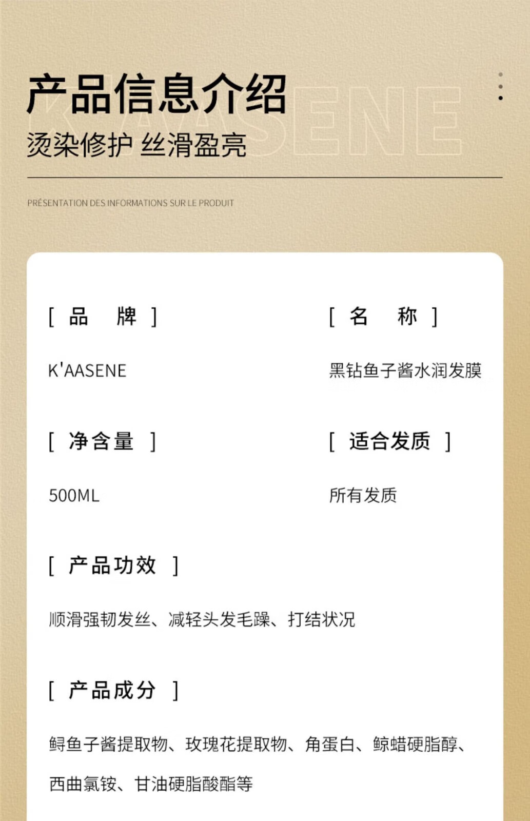 佳诗尼(K'AASENE)法国鱼子酱护发素发膜修复干枯改善毛躁修护烫染损伤多肽角蛋白 5瓶装[超值囤货] 500ml