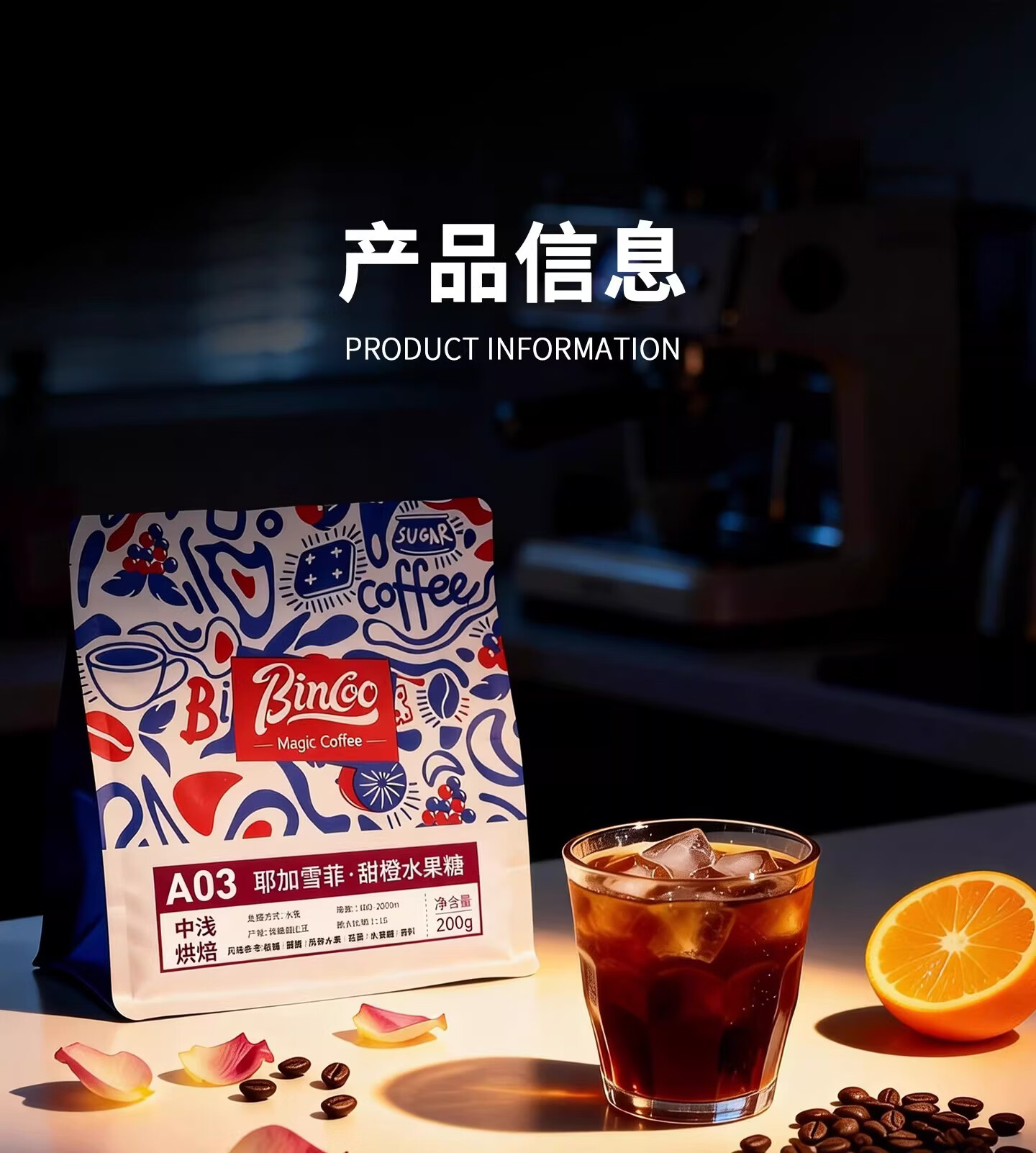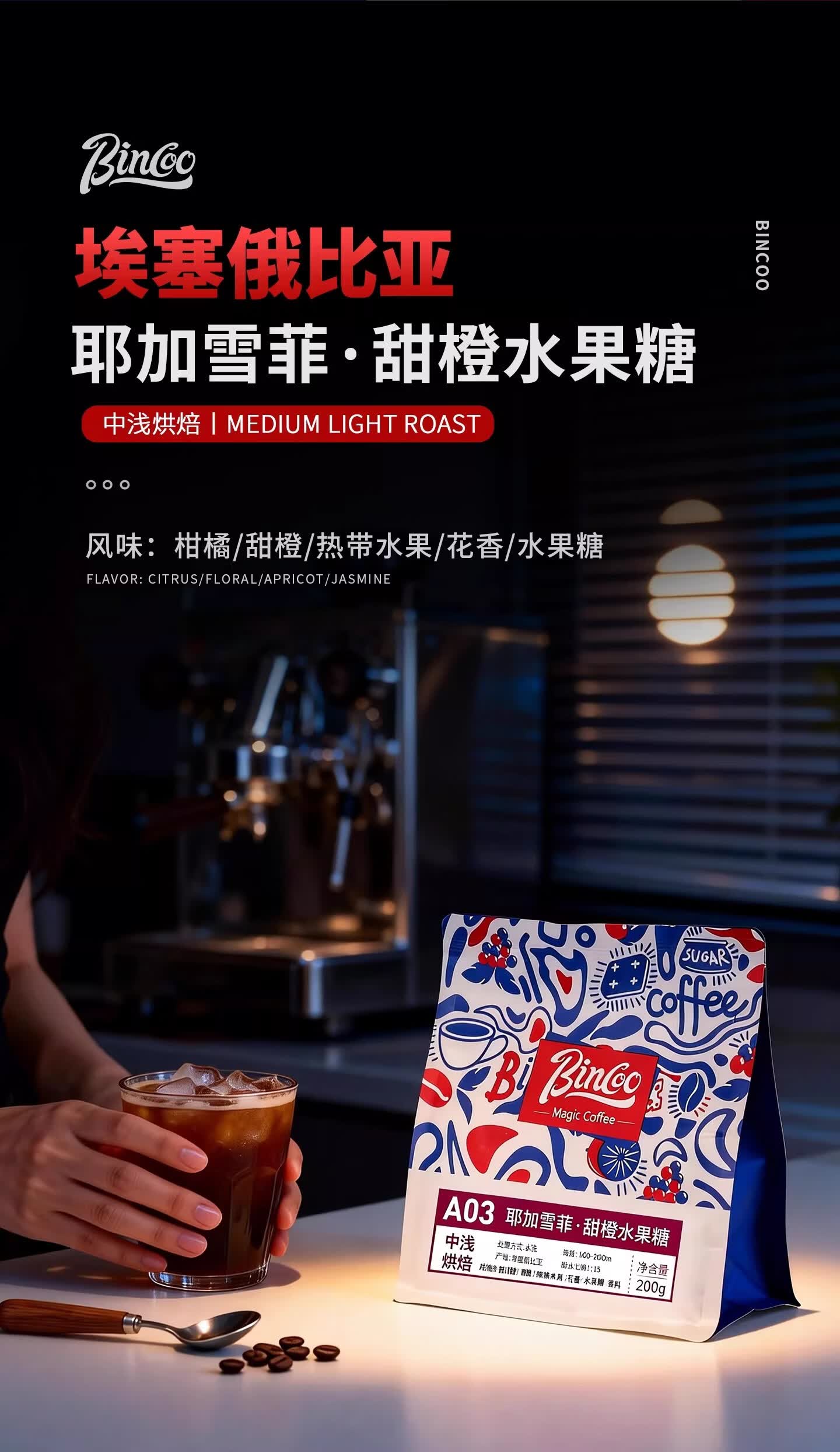 Bincoo耶加雪菲花田甜柠茶意式拼配咖啡豆中深烘焙咖啡机摩卡壶用 227g袋装