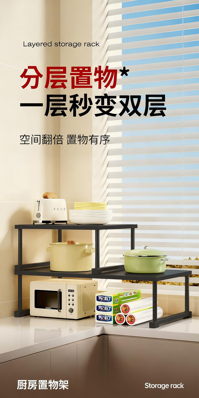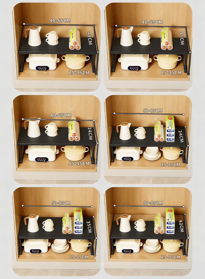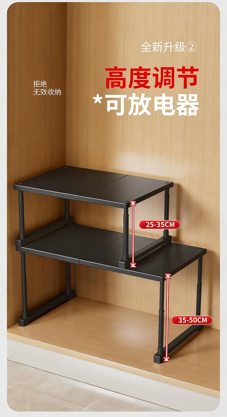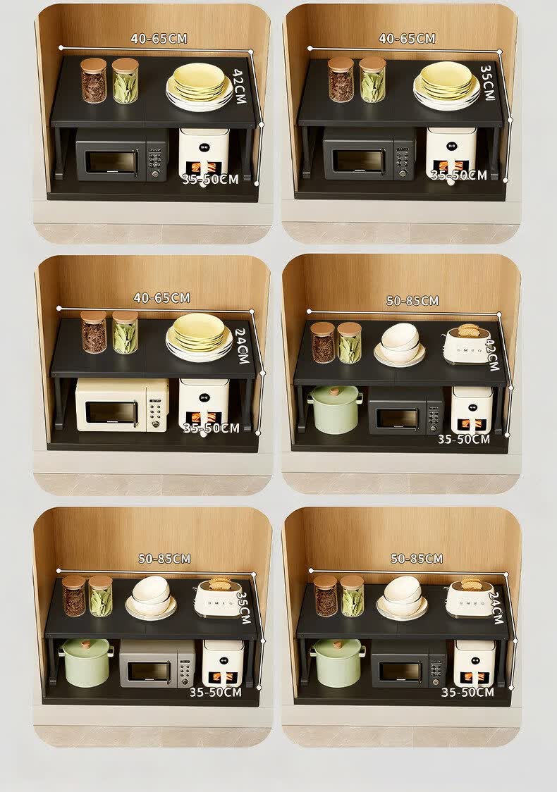 艾仕可(ASCOR)厨房微波炉置物架多功能下水槽橱柜内伸缩分层隔板台面多层收纳架 磨砂黑/长27-42/宽24高25-35cm【加厚碳钢-稳固不晃】