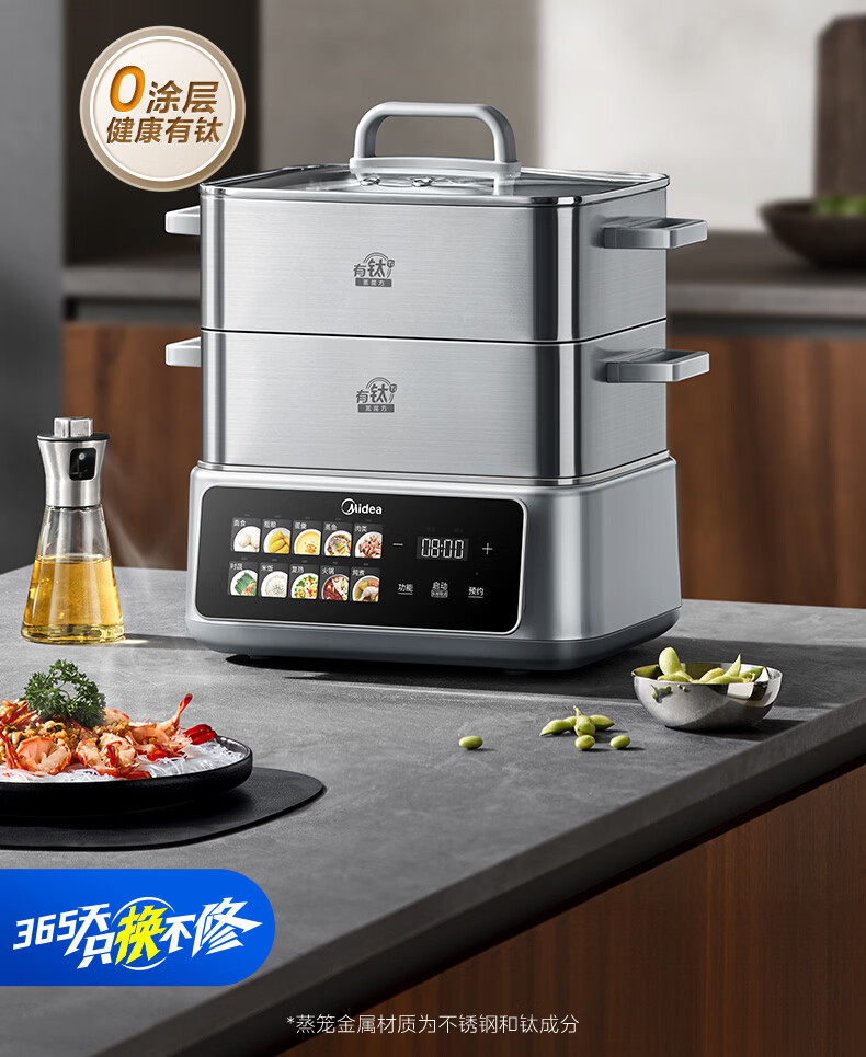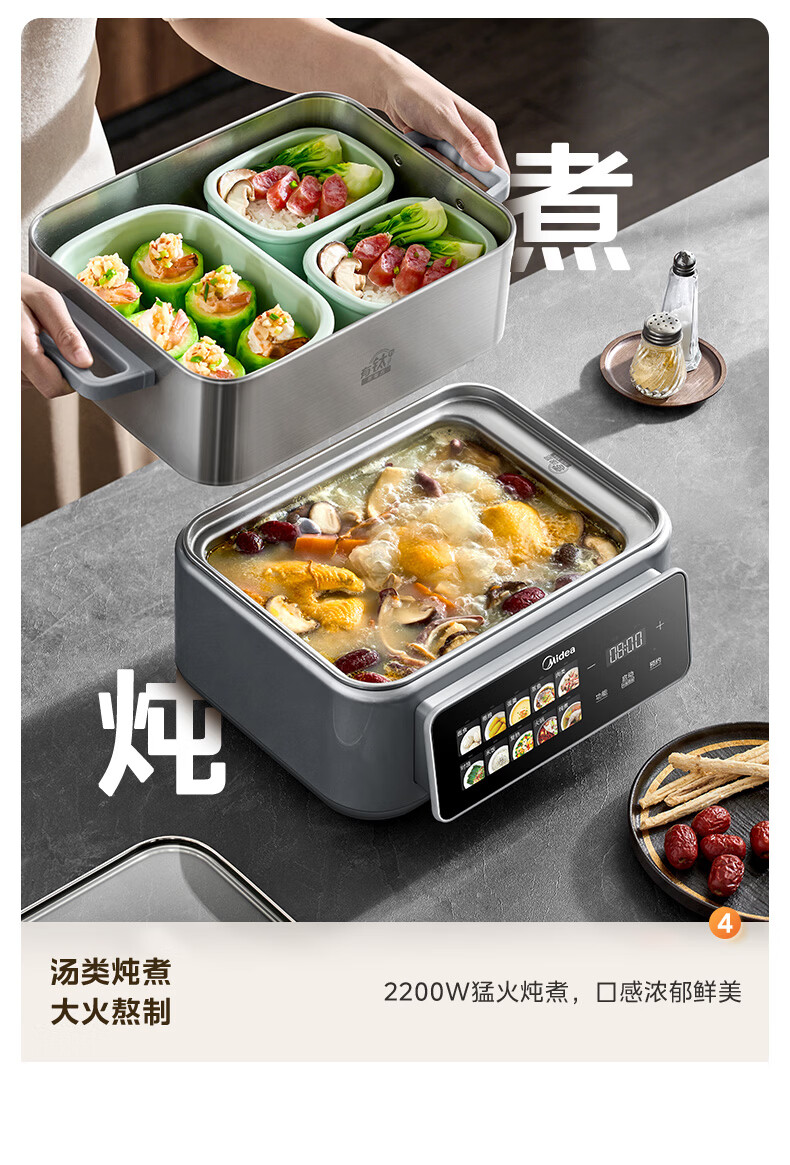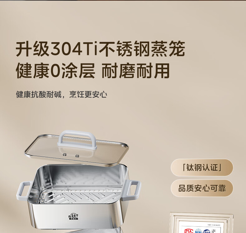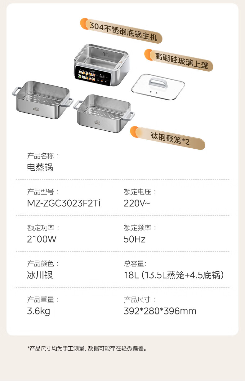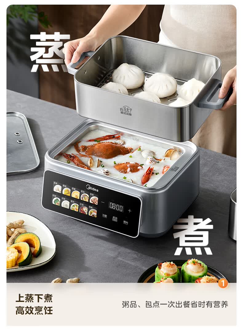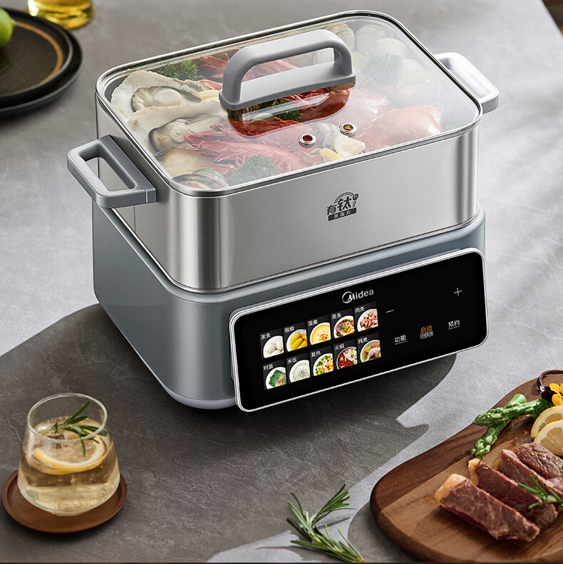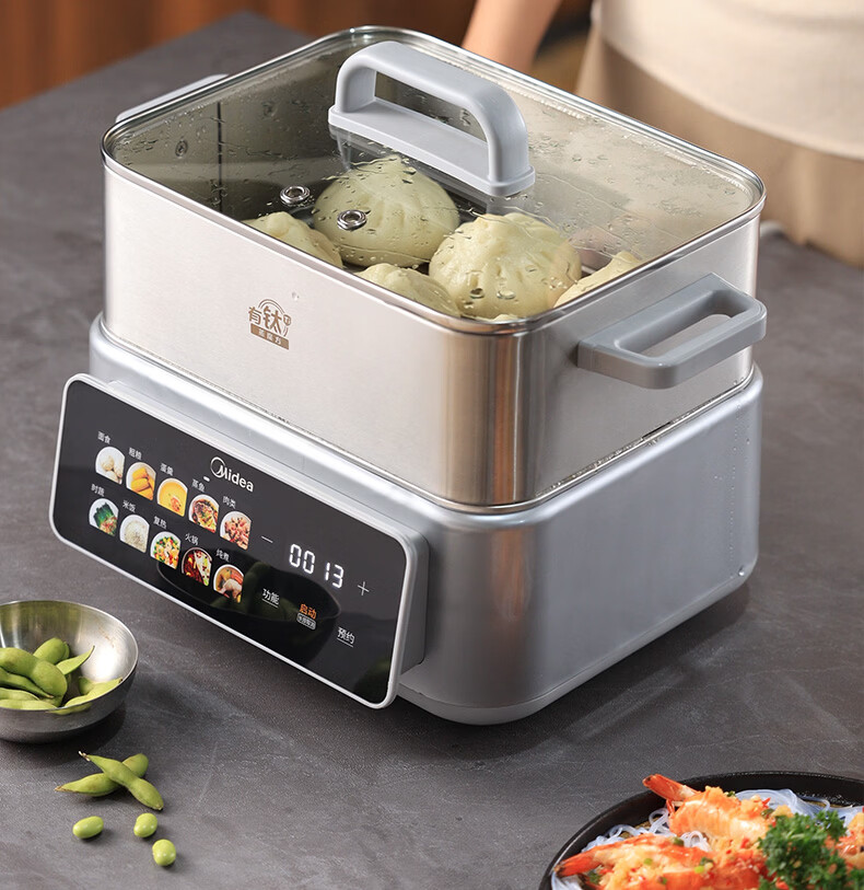 美的(Midea)钛钢蒸魔方电蒸锅炖蒸涮煮一体多功能电热锅家用18L三层大容量0涂层有钛不锈钢煮锅ZGC3023F2Ti