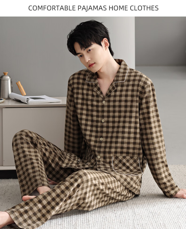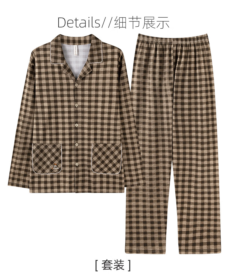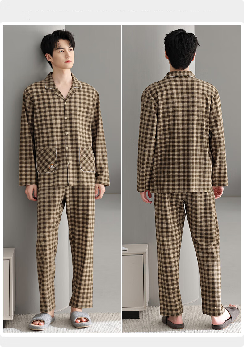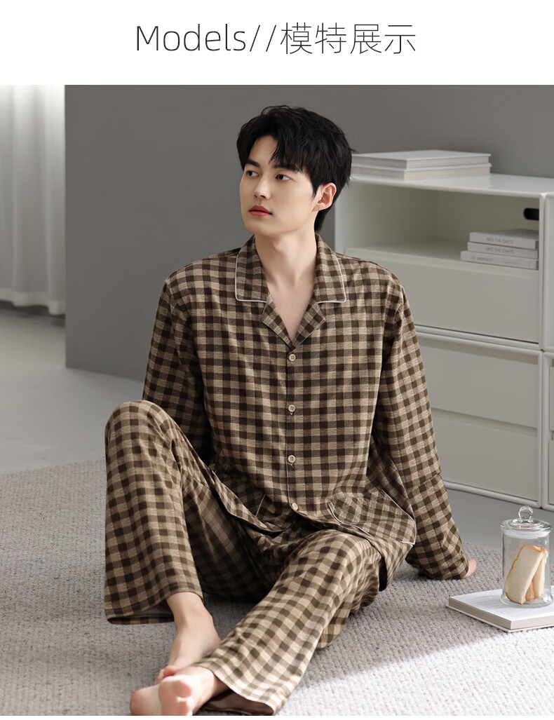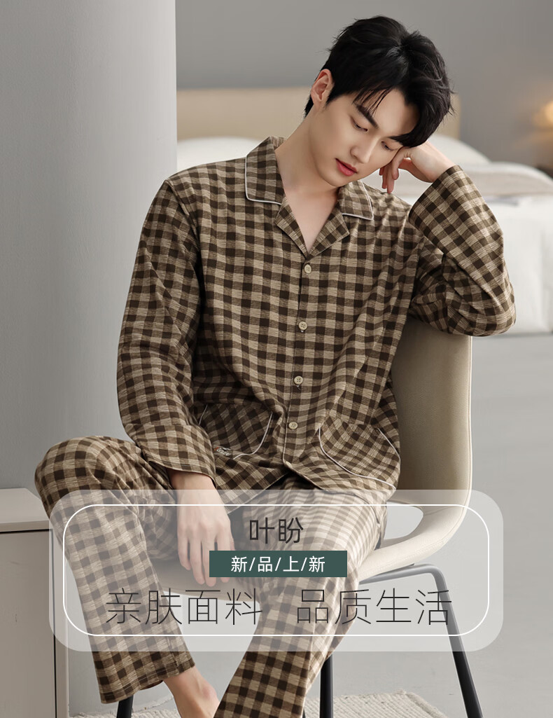 叶盼(yepan)【柔软】睡衣男春秋季纯棉宽松长袖开衫男款高级感男士家居服套装 91113-暖茶咖 M (165) :建议100-120斤穿着
