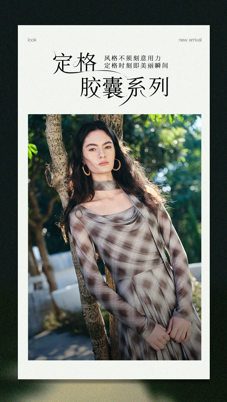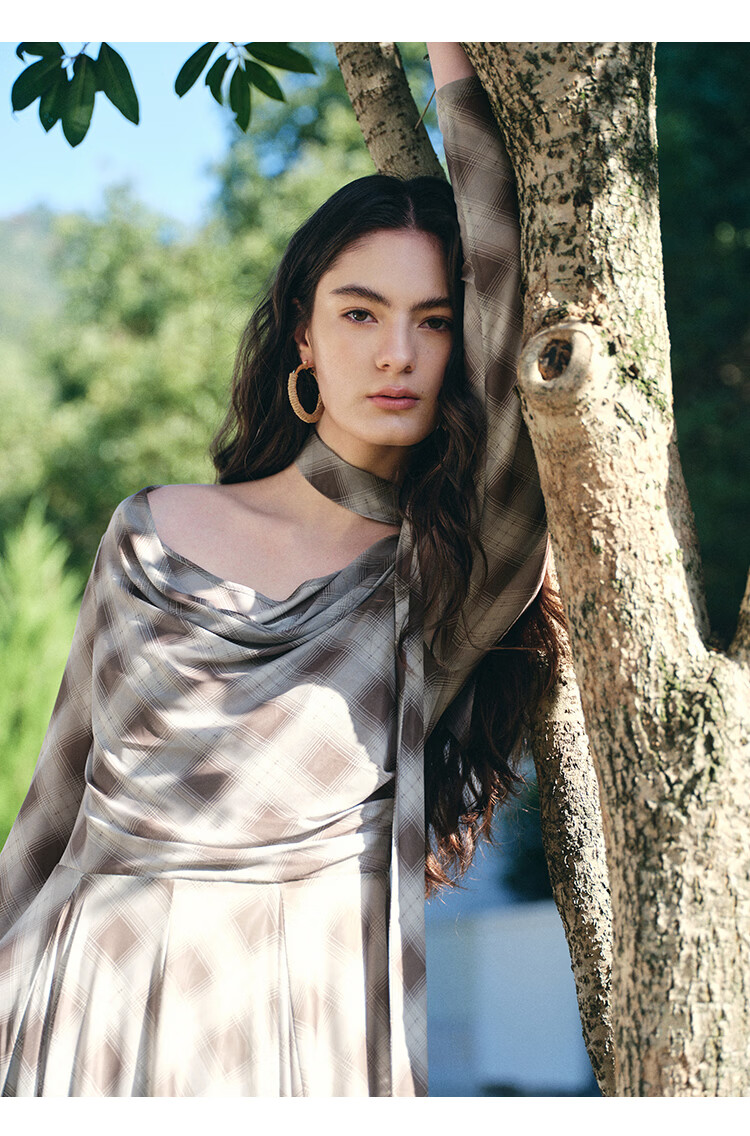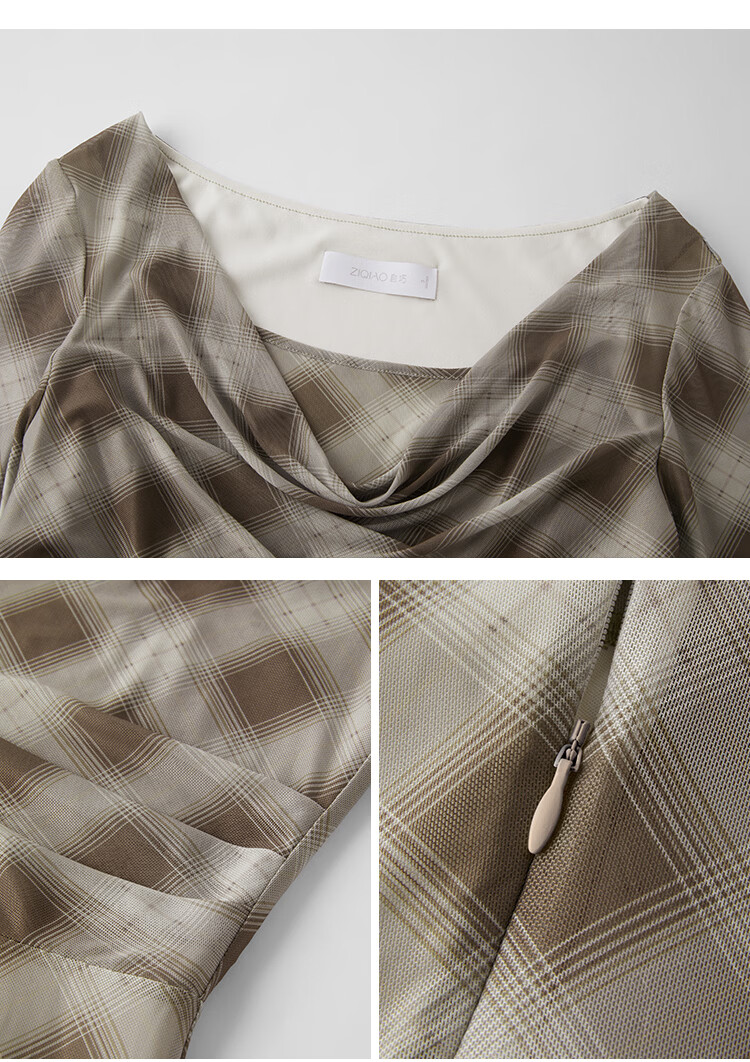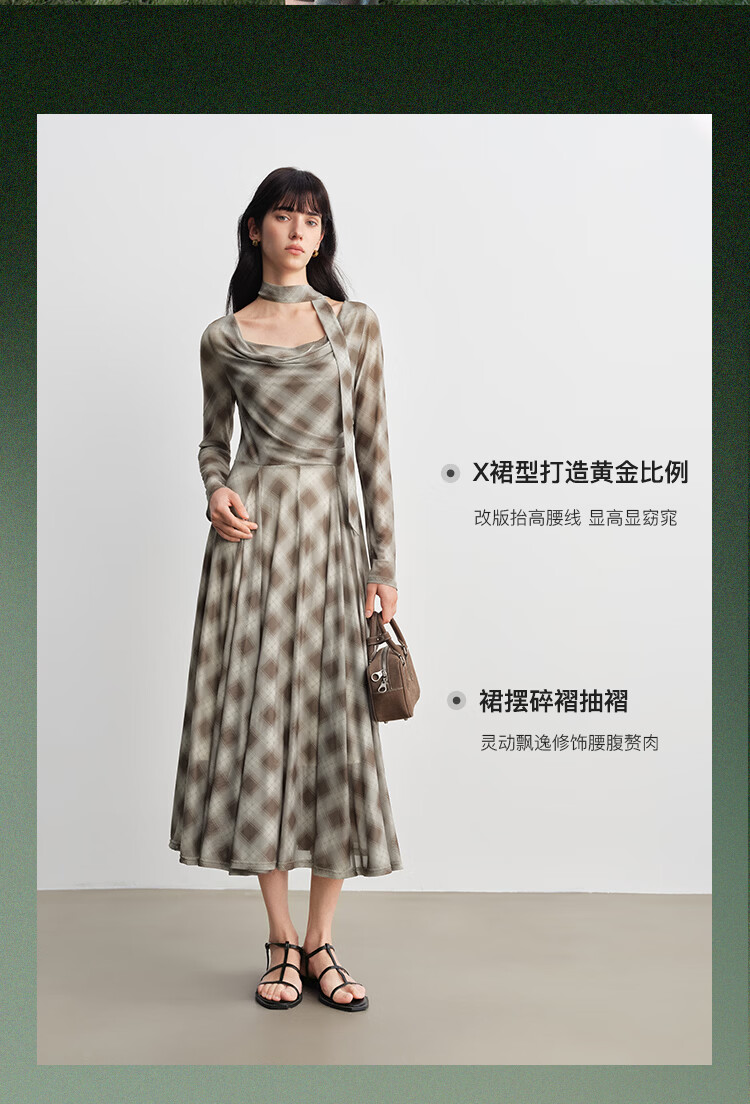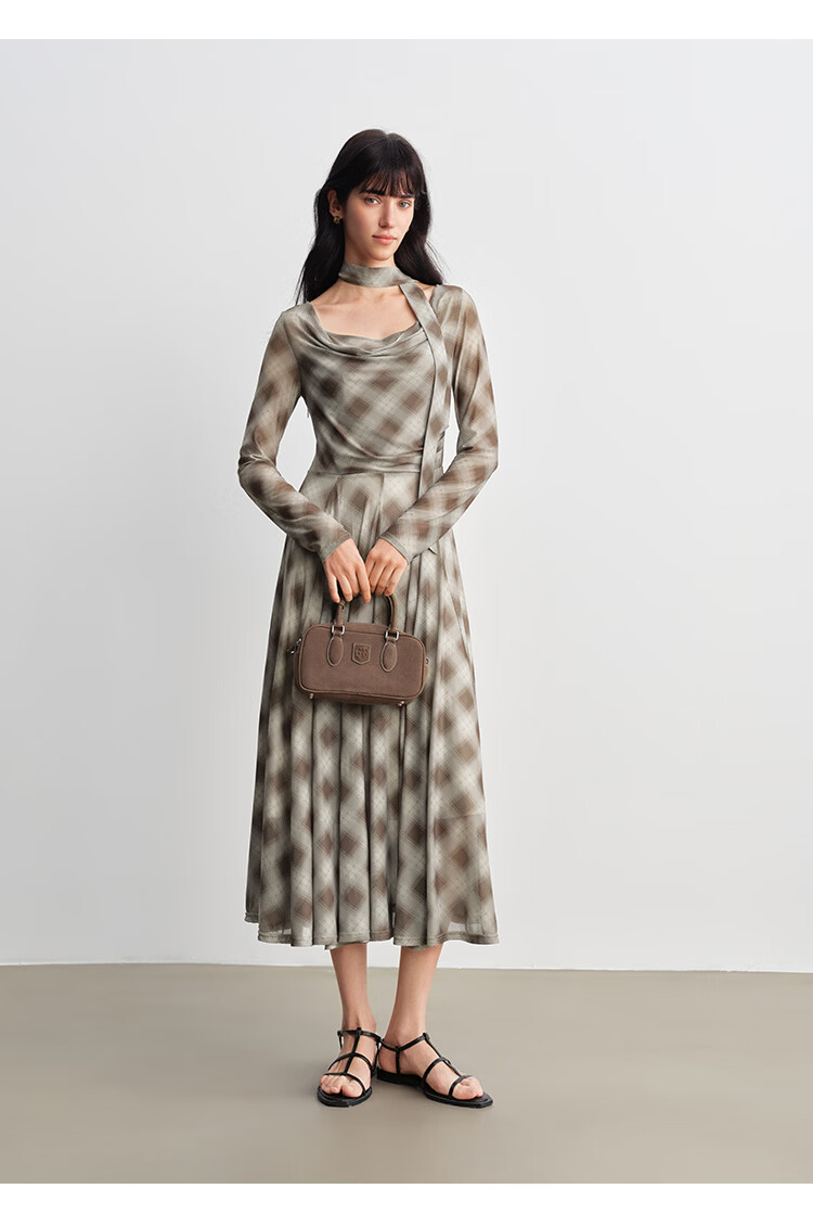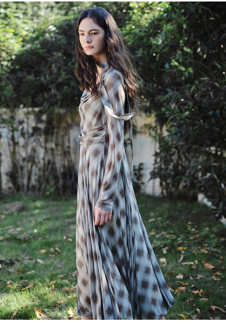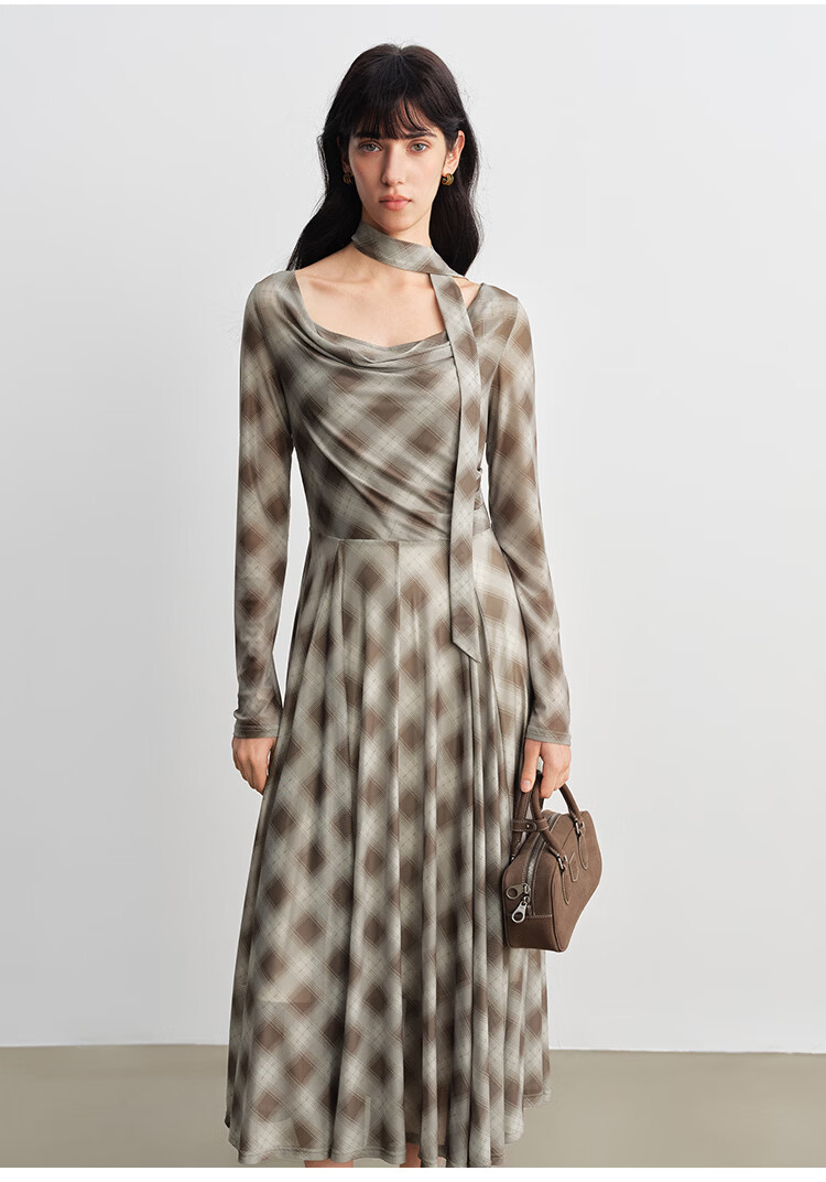 自巧【定格时刻】小个子格纹荡领连衣裙女压褶收腰长裙2026春新品 棕色格 XXS (尺码:1)