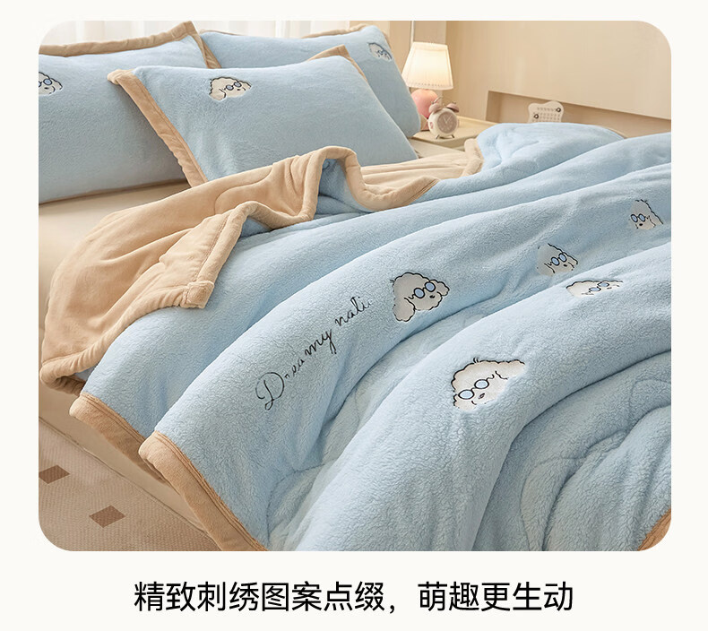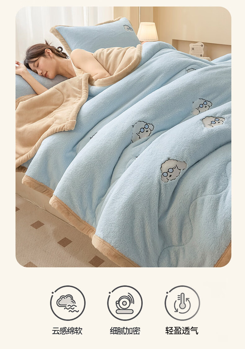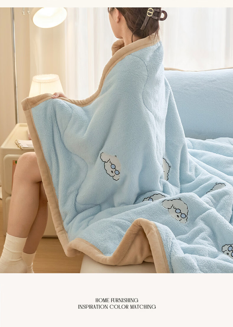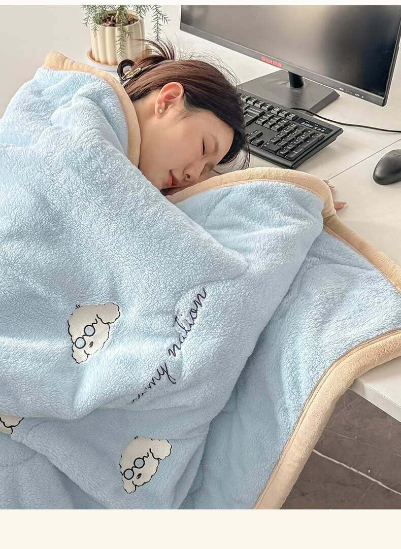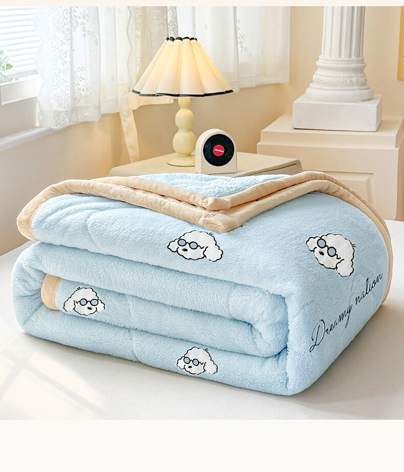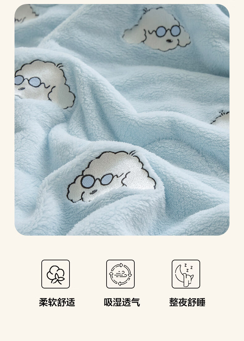 阿尔皮纳袋鼠牛奶绒毛毯冬季加厚加绒拉舍尔珊瑚绒办公室单人午睡空调小毯子被 眼镜狗-天空蓝+香槟【加厚牛奶绒毯可铺可盖】 120*200cm【儿童毯】