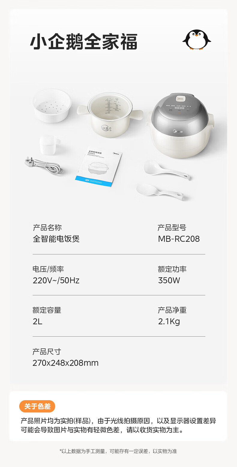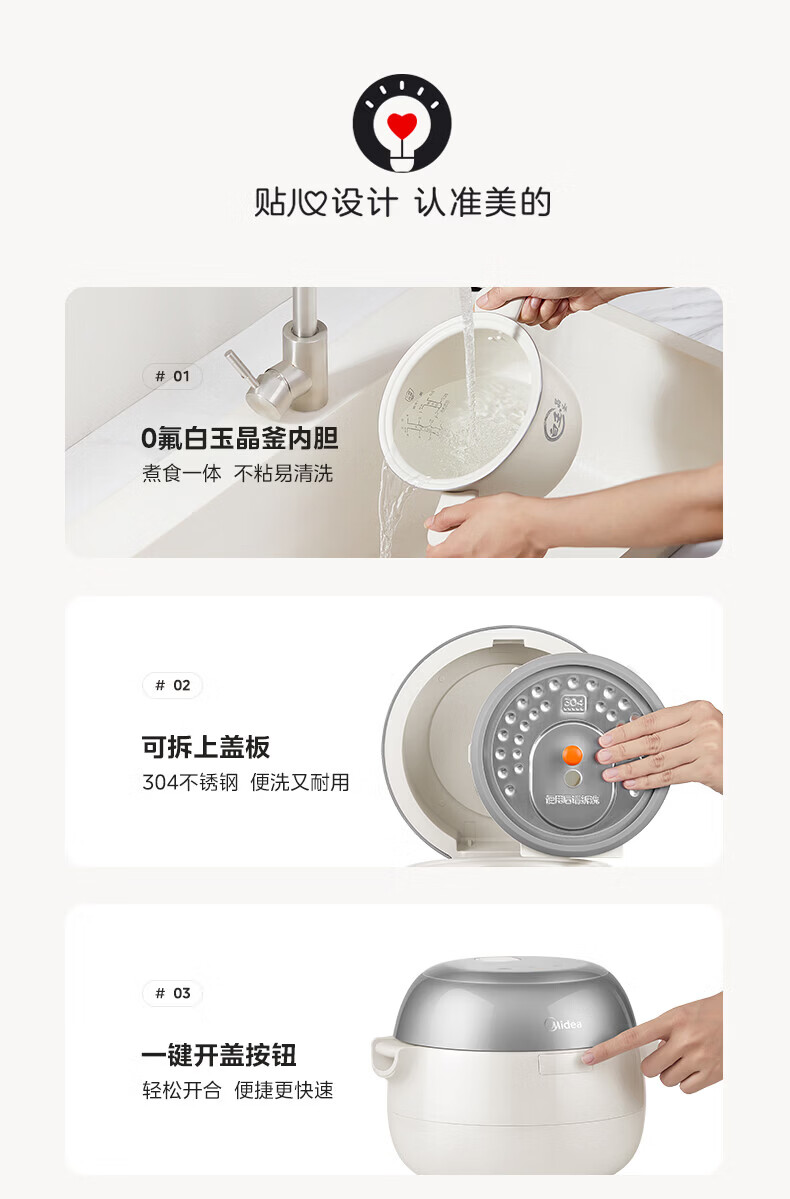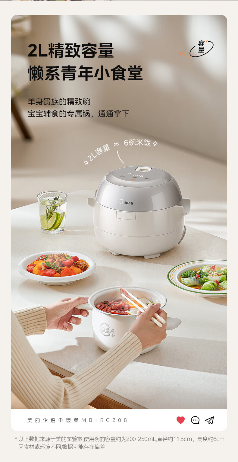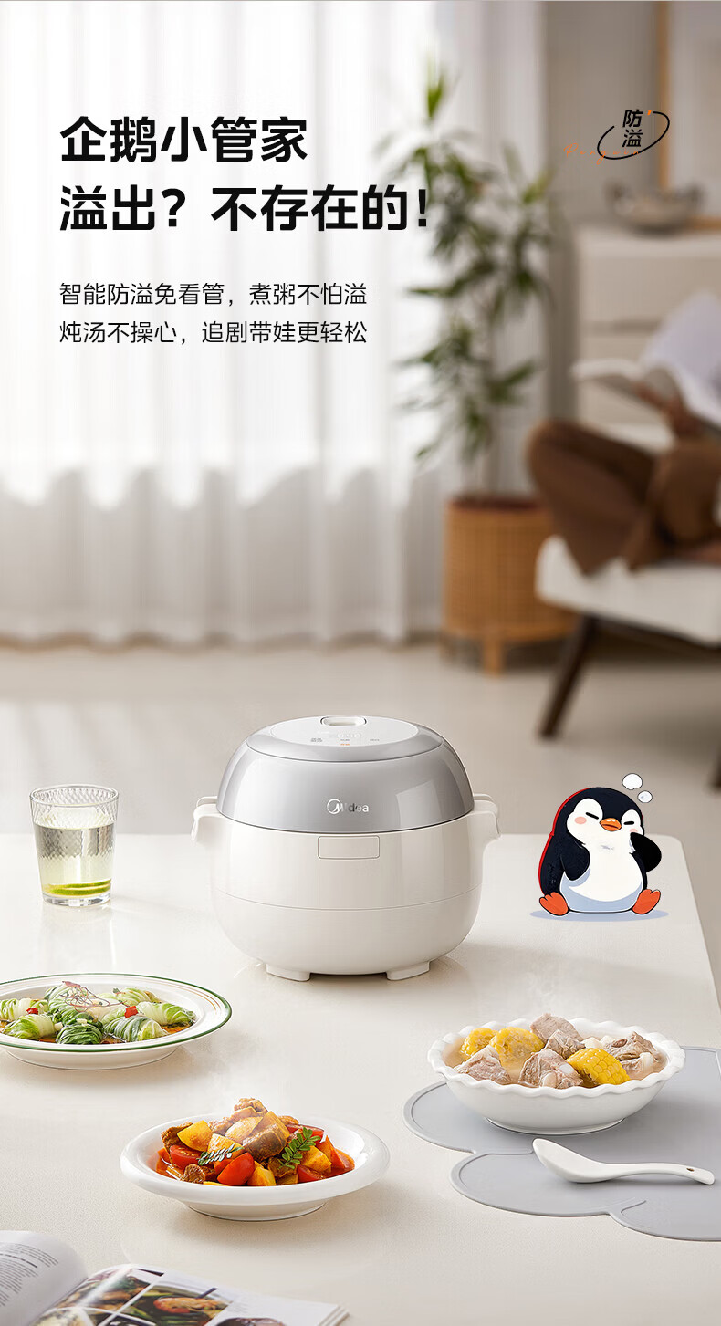 美的(Midea)小企鹅电饭煲小型家用1-2人0氟抗菌内胆 2L精致容量 多功能小功率智能保温 宝宝粥香甜饭蒸炖 0氟抗菌内胆 精致容量 2L
