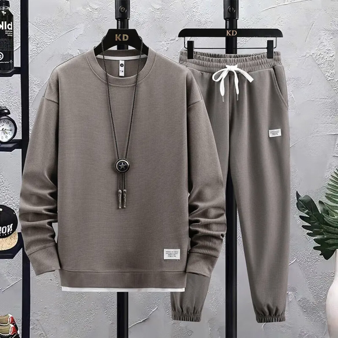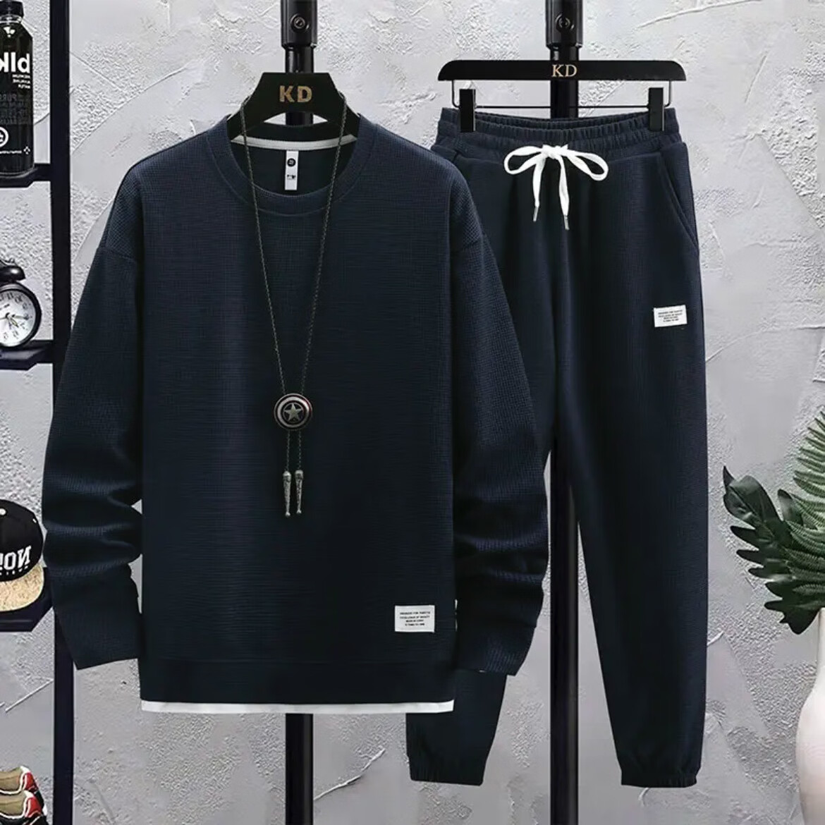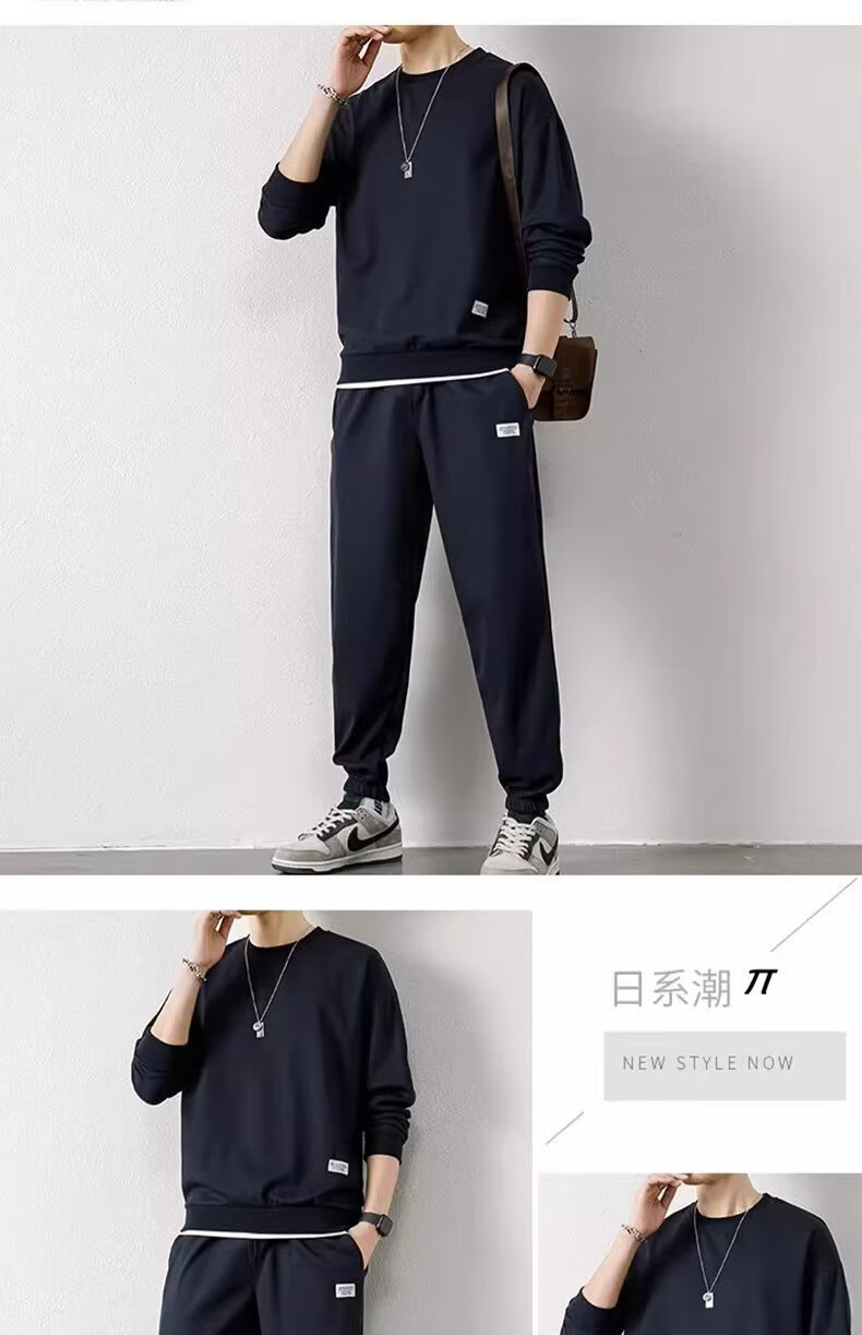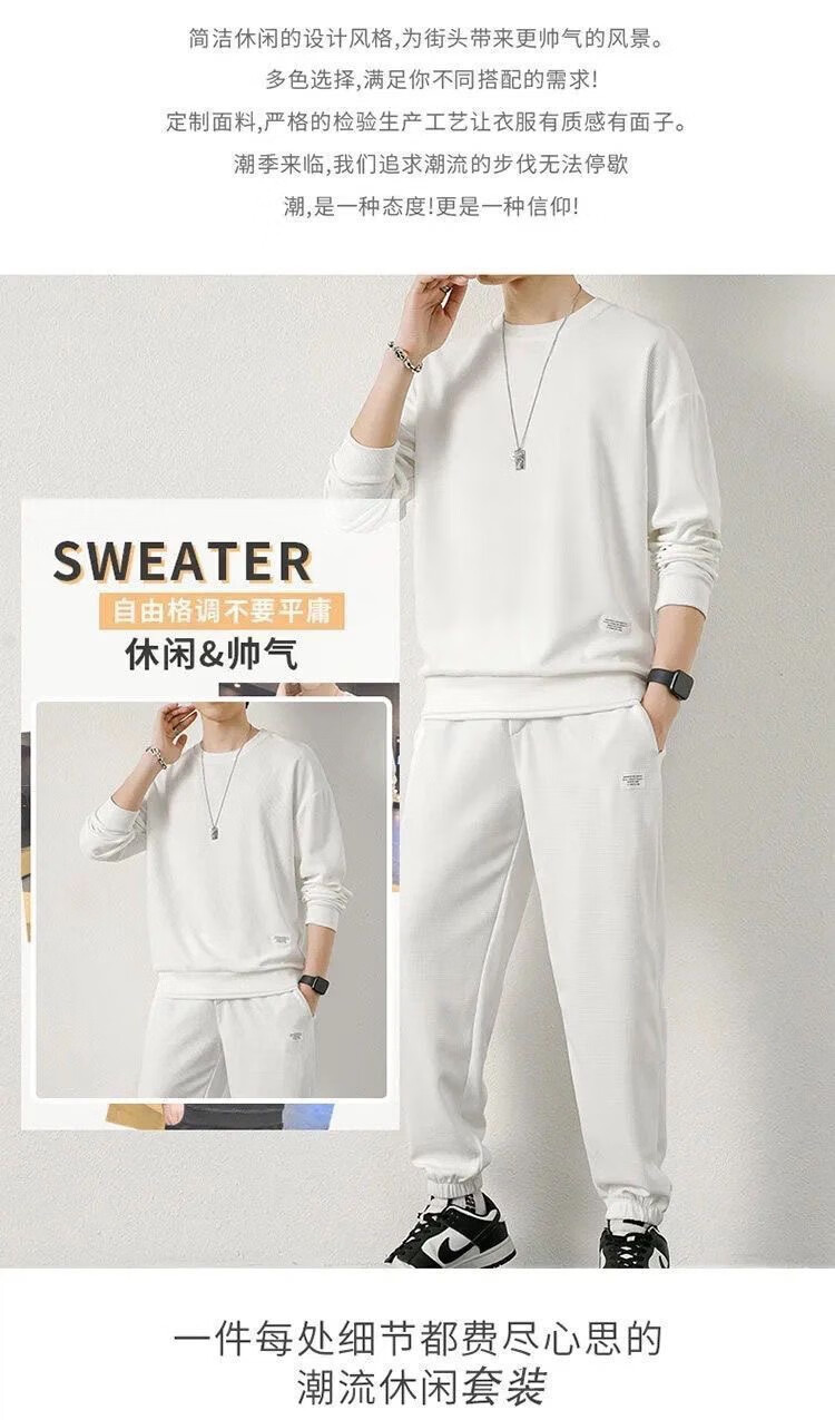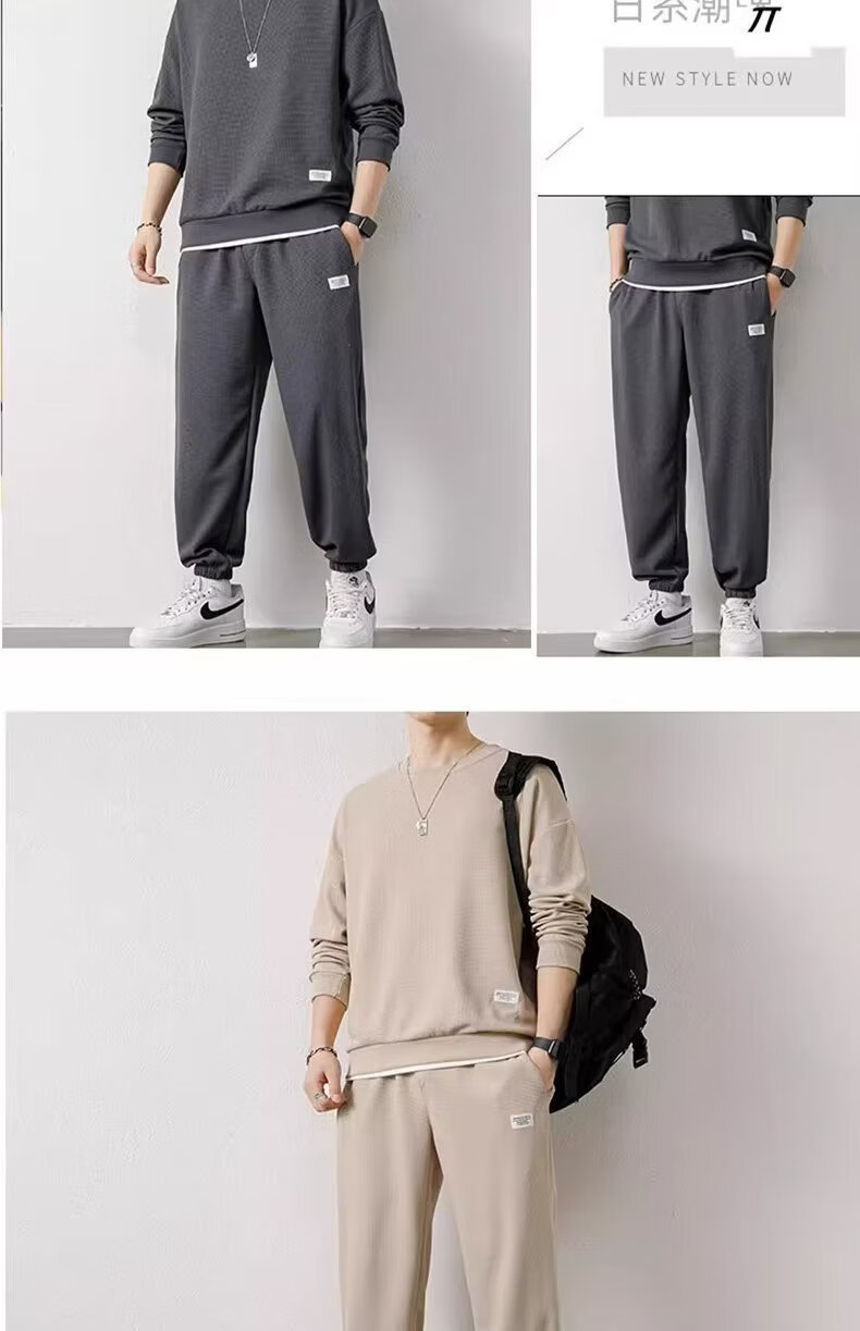 锐图森春秋季男士华夫格卫衣套装宽松休闲秋冬新款圆领男装长袖长裤套装 【套装】黑色 XL (建议110-130斤)