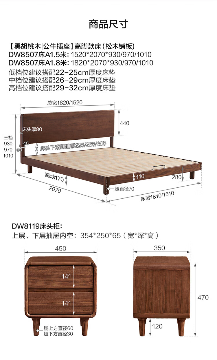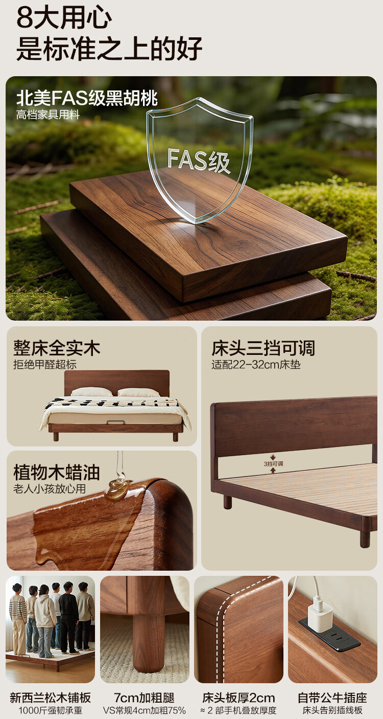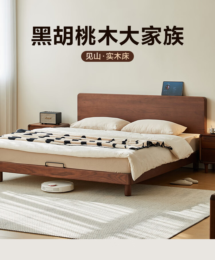 全友家居原木风见山实木床北美黑胡桃2026新款小户型床主卧室双人大床 【黑胡桃木 | 公牛插座 | 松木铺板】高脚款 1.8米x2米 床