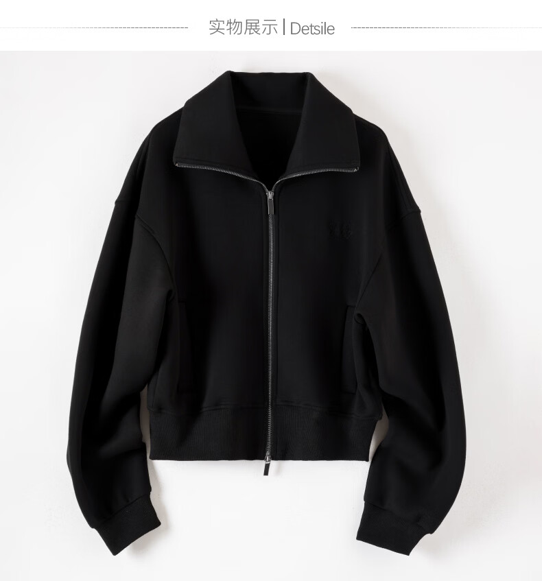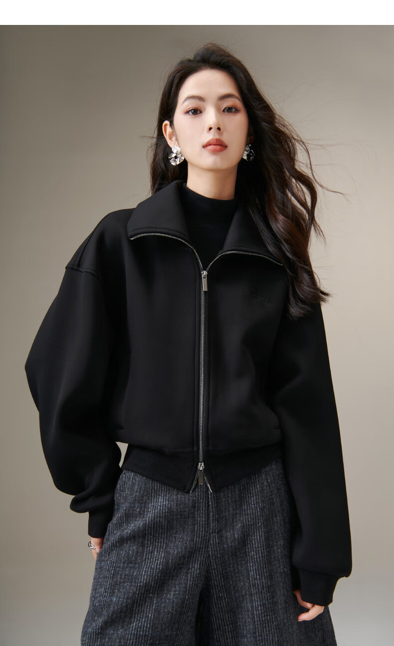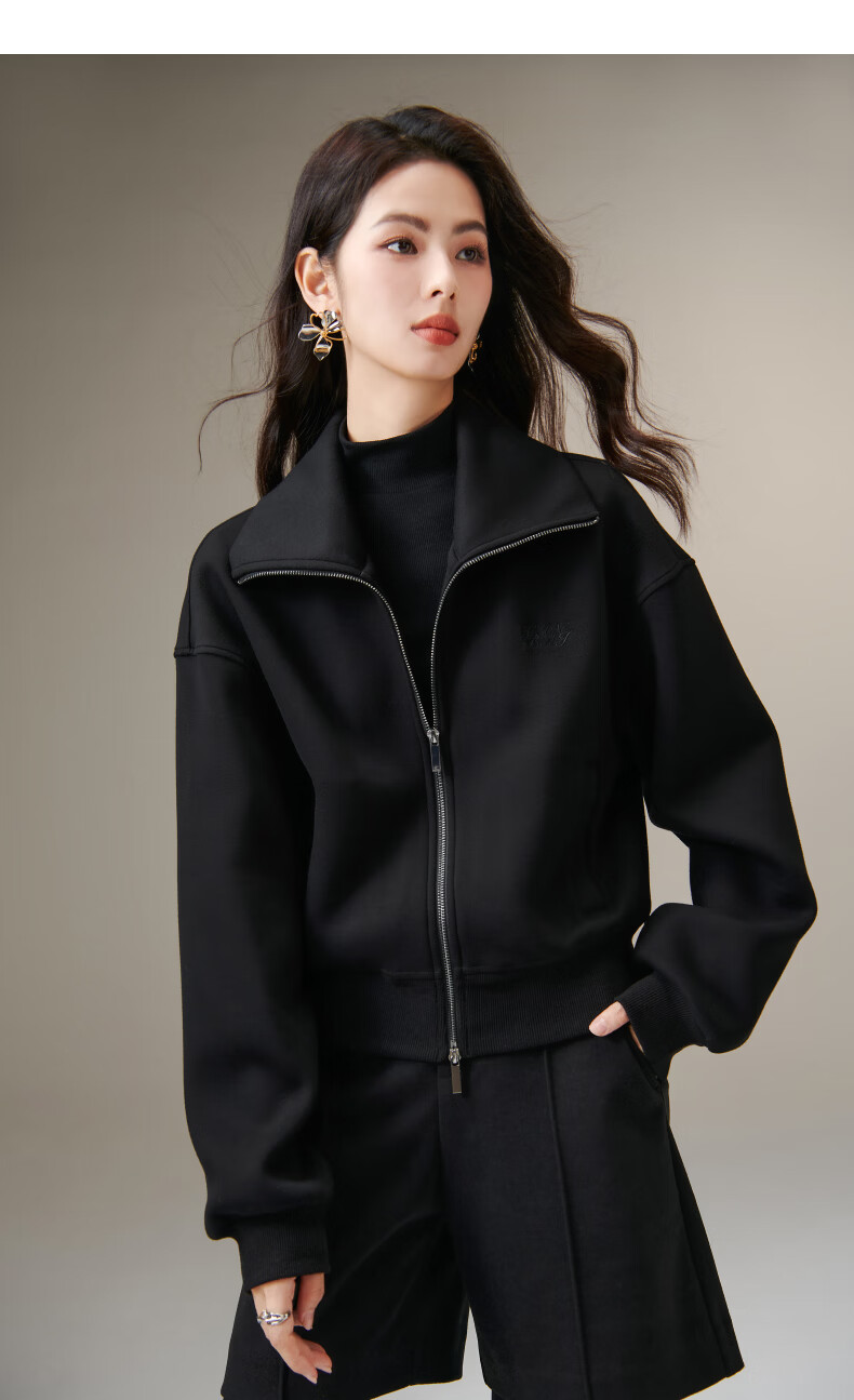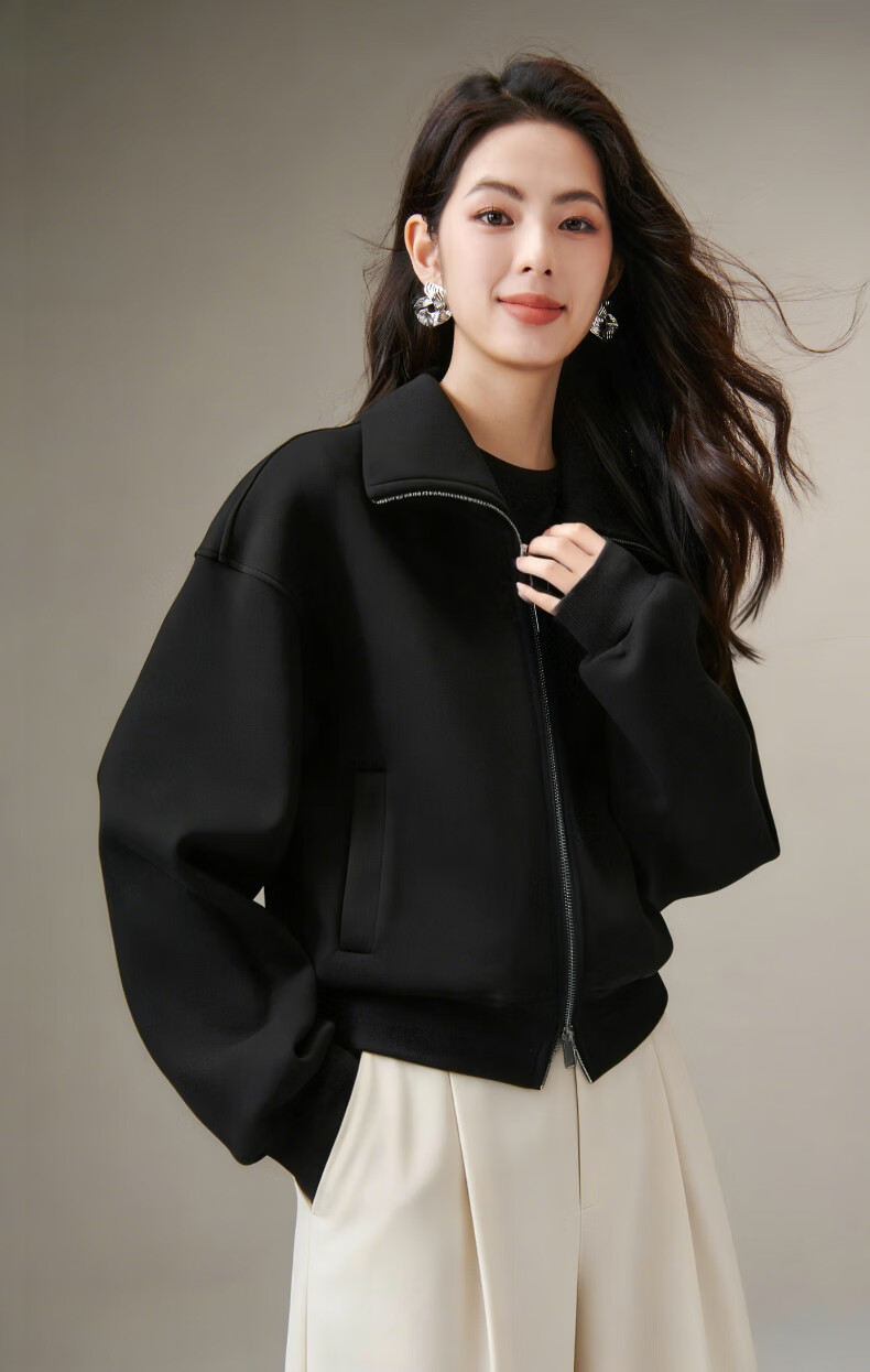 晚白【新品】2026春季翻领气质拉链上衣宽松大码气质百搭卫衣外套女 黑色 L