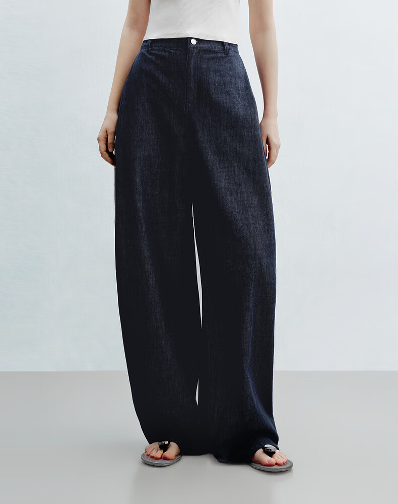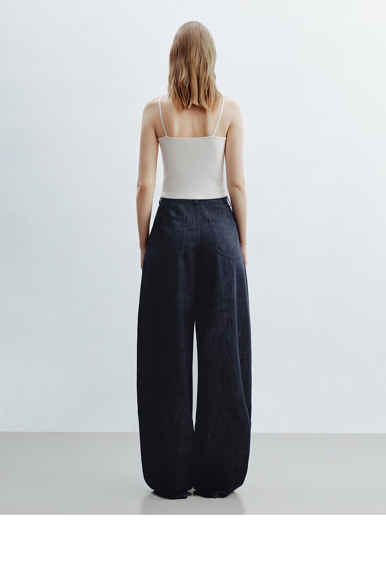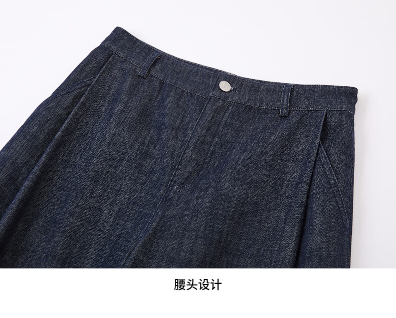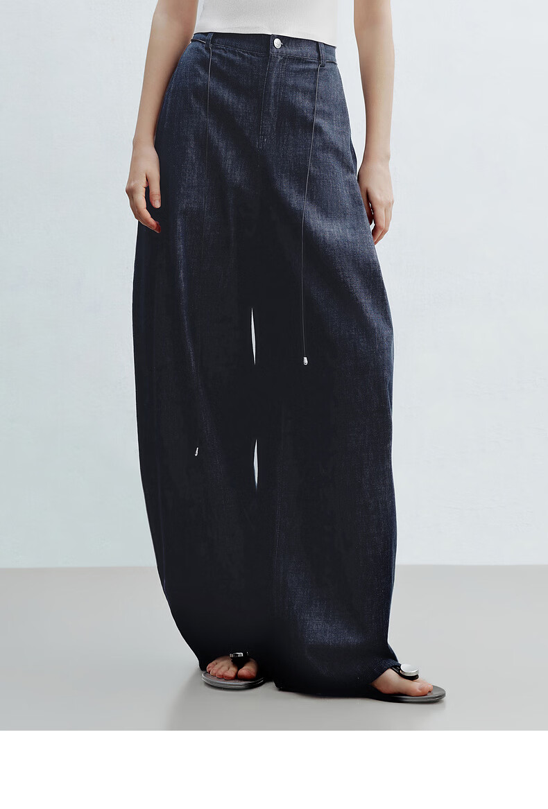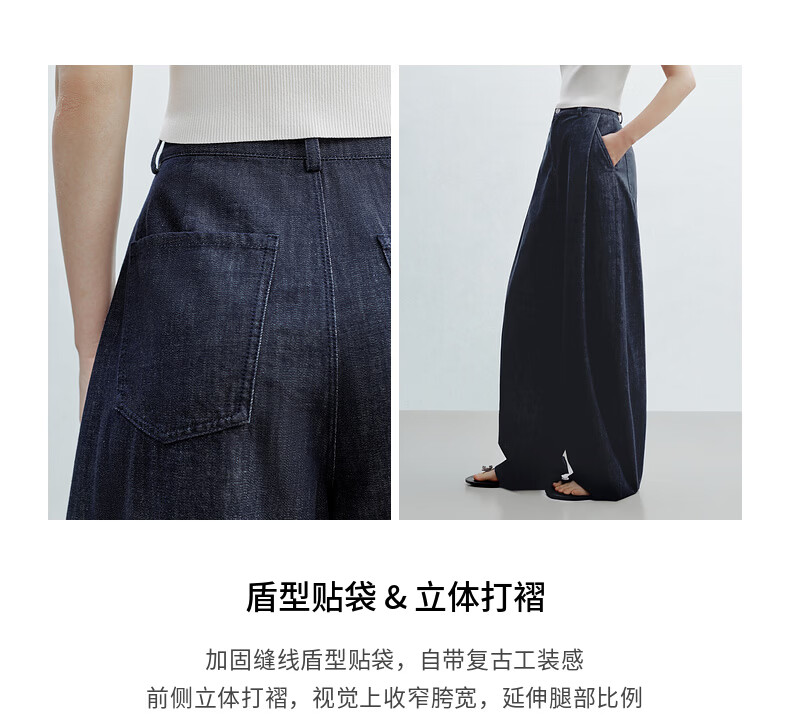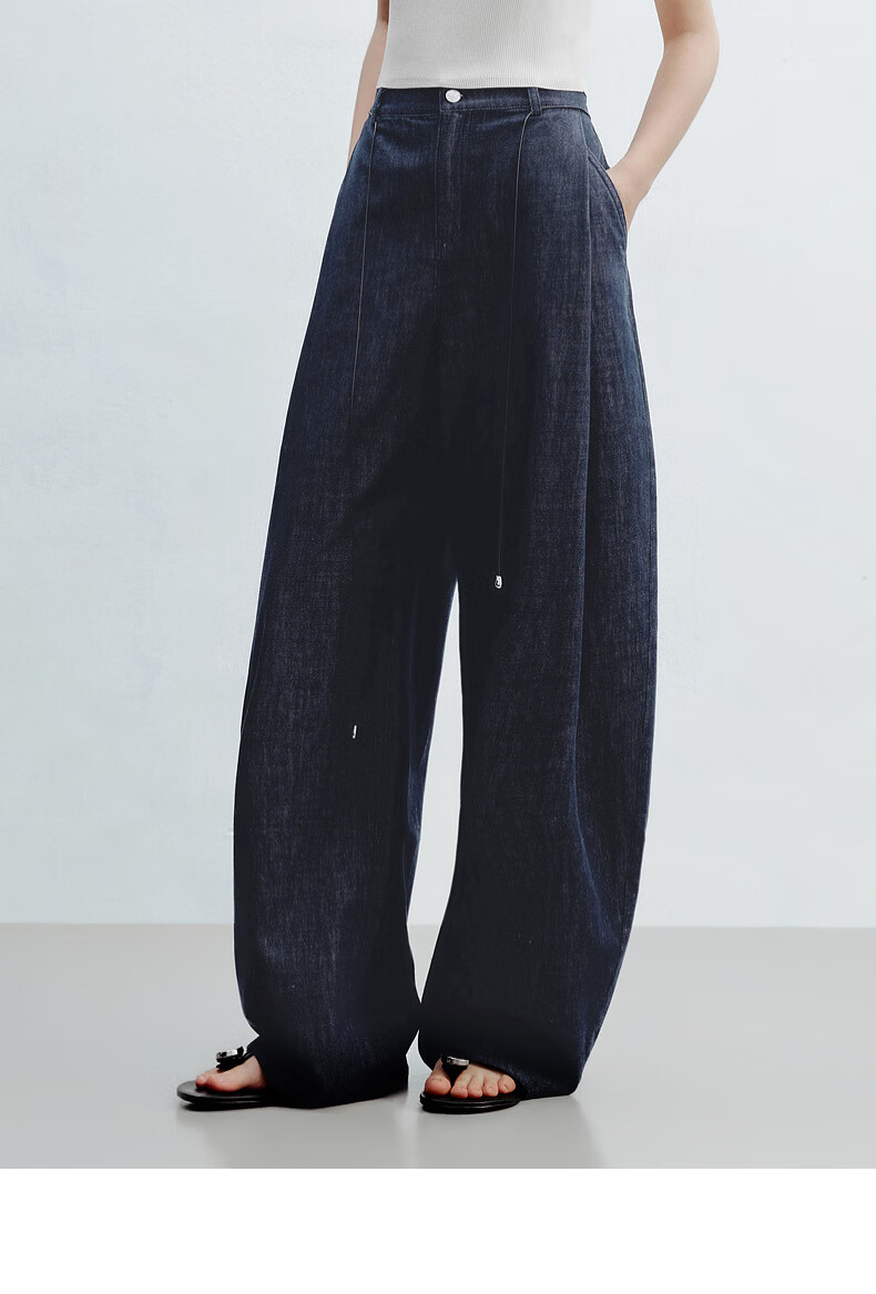 H's藏青弯刀裤女26夏季新款高级感全棉复古单宁廓形休闲阔腿裤子 深藏青牛仔 S