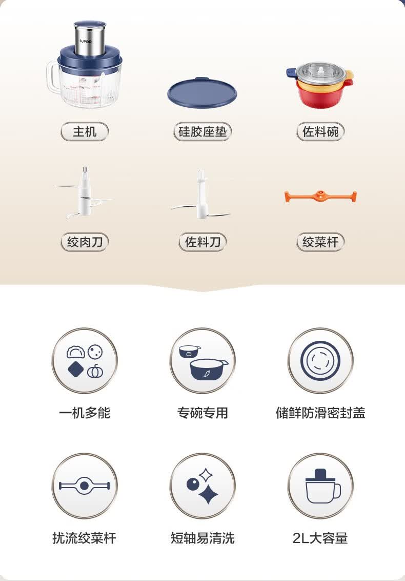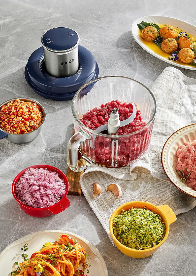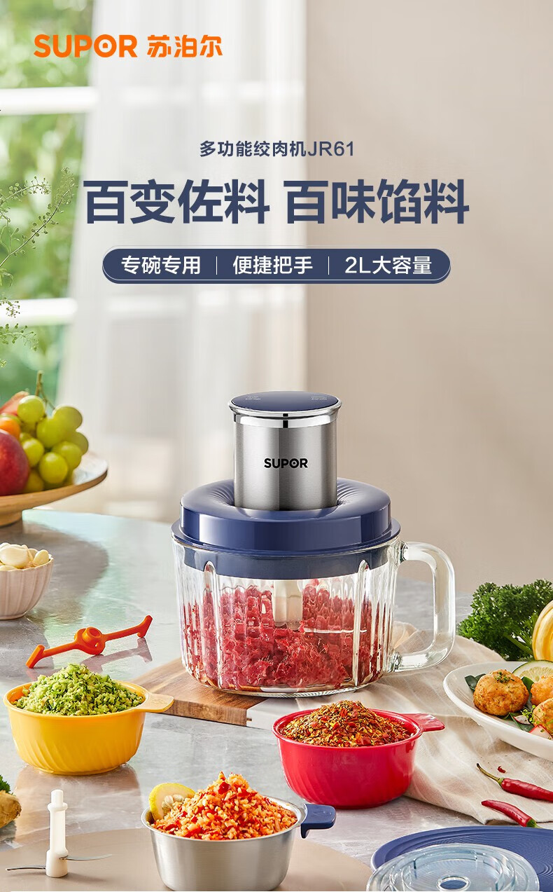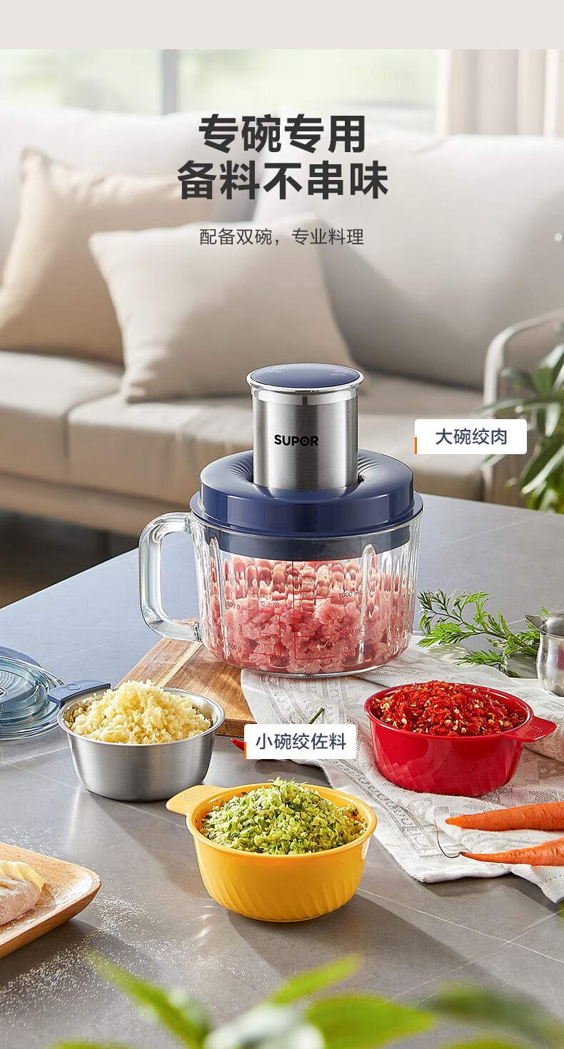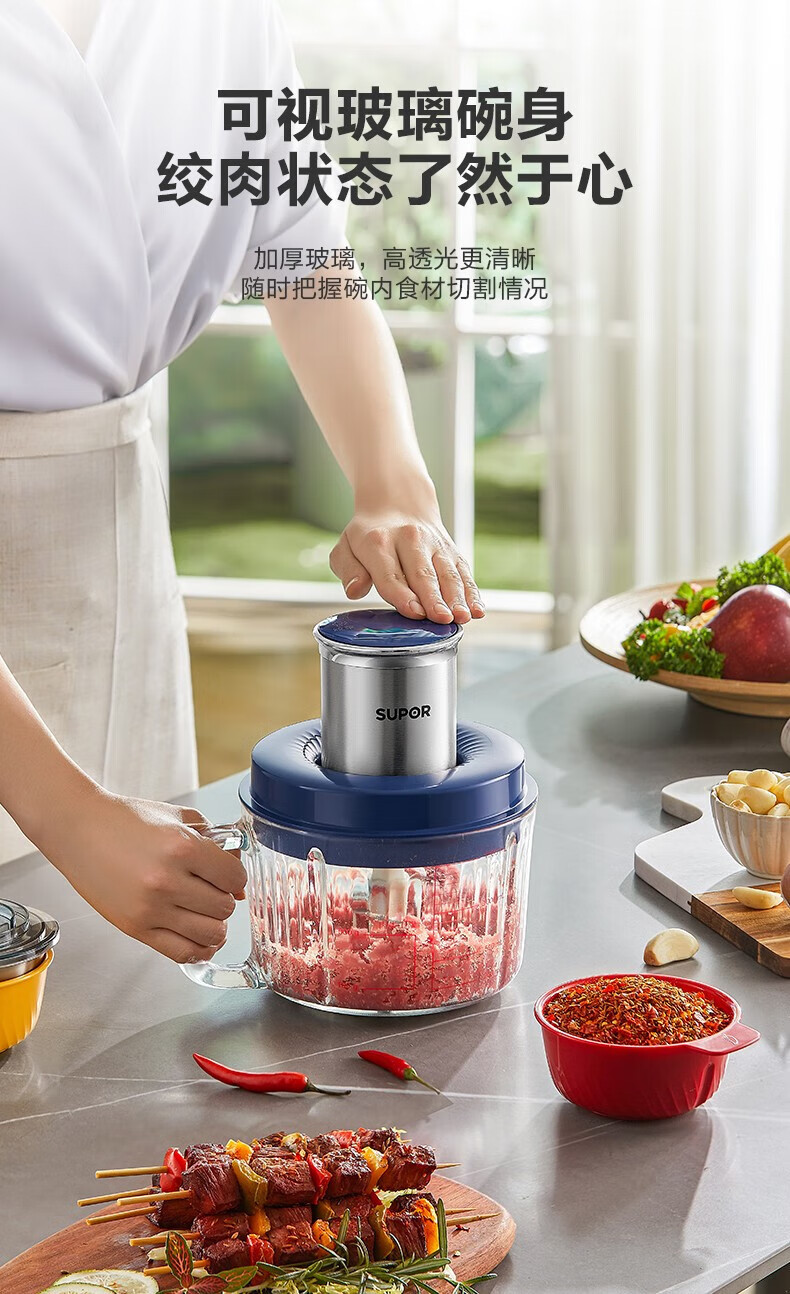 苏泊尔(SUPOR)绞肉机 搅拌机大容量料理机辅食机多功能绞馅机碎肉机家用打肉机蒜泥捣碎机2升带把手专碗专用 钴蓝色 2L