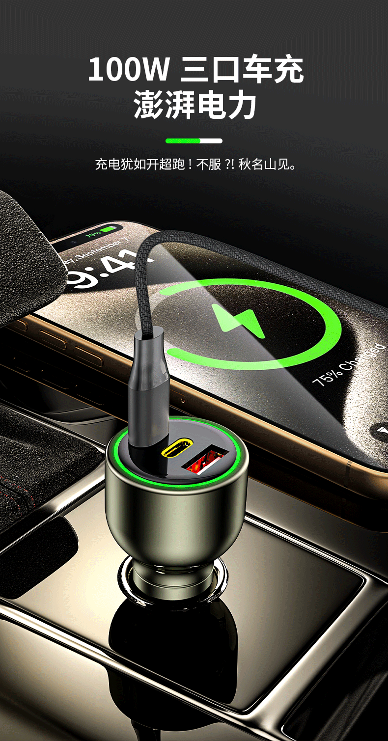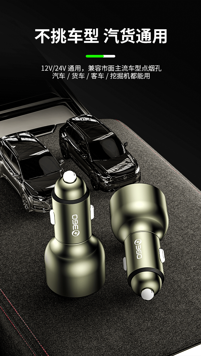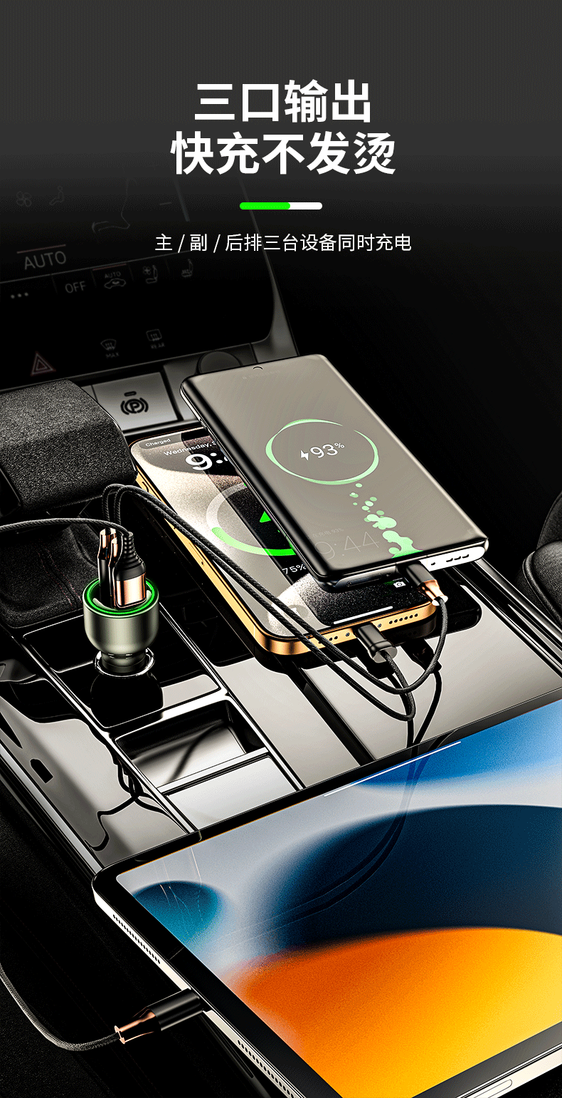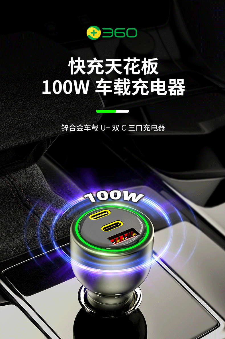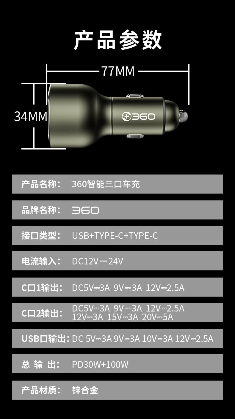360车载充电器数据线套装1A2C PD100W+30W双路超级快充HC-P67 点烟器充电头一拖三转换器适用苹果华为