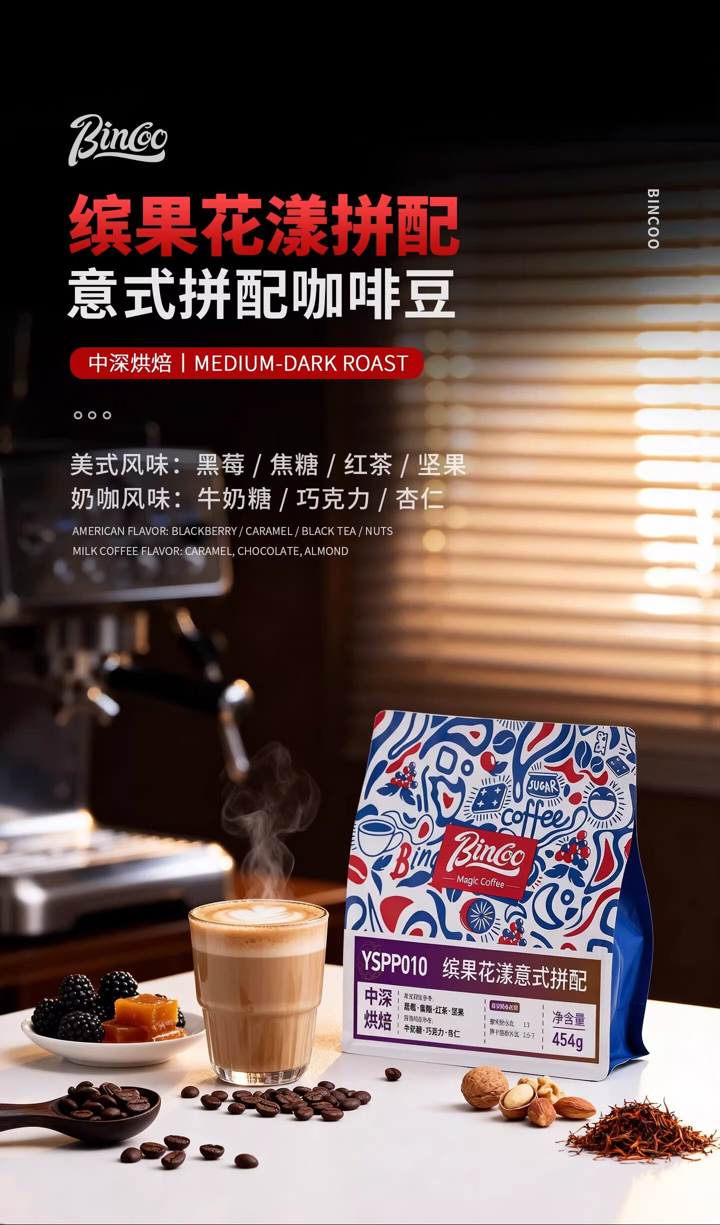 Bincoo蜜果甜醺拼配意式咖啡豆中深烘焙咖啡机摩卡壶萃取美式拿铁 227g袋装