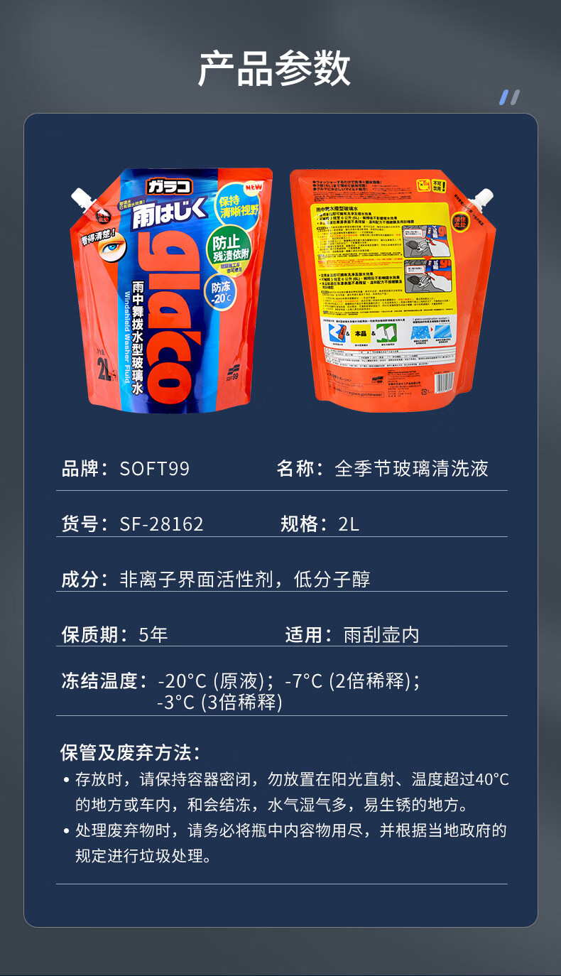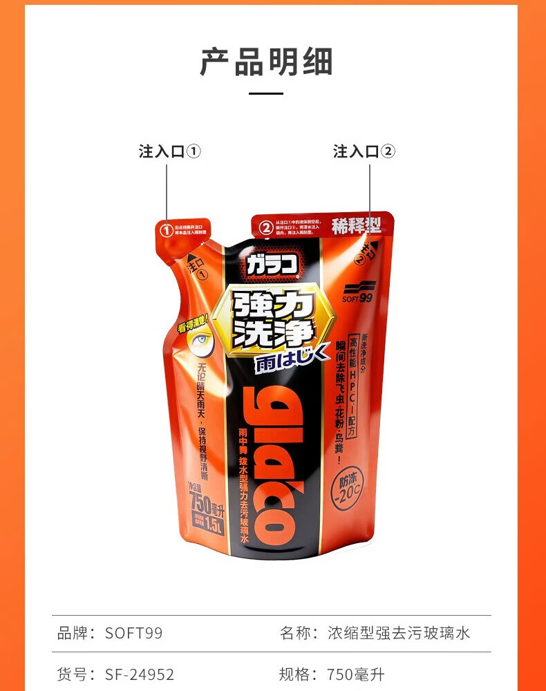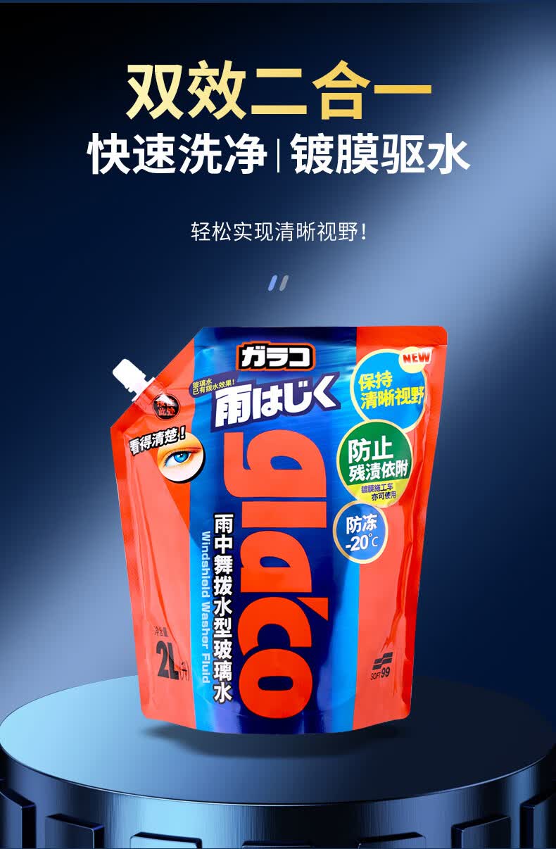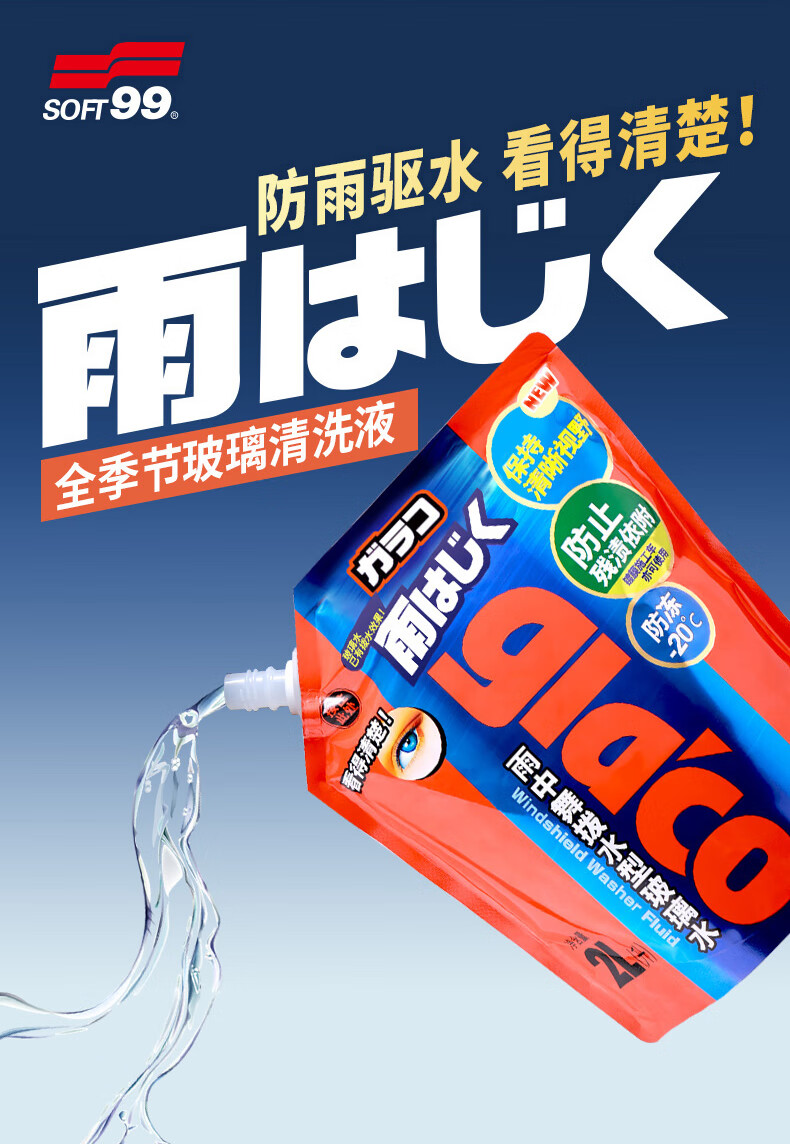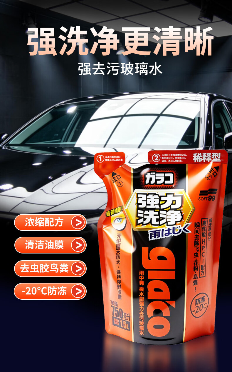 SOFT99镀膜型汽车玻璃水四季通用 冬季雨刮水强力去污去油膜防冻玻璃水 750ml*6袋 强力浓缩1:1稀释 -20度