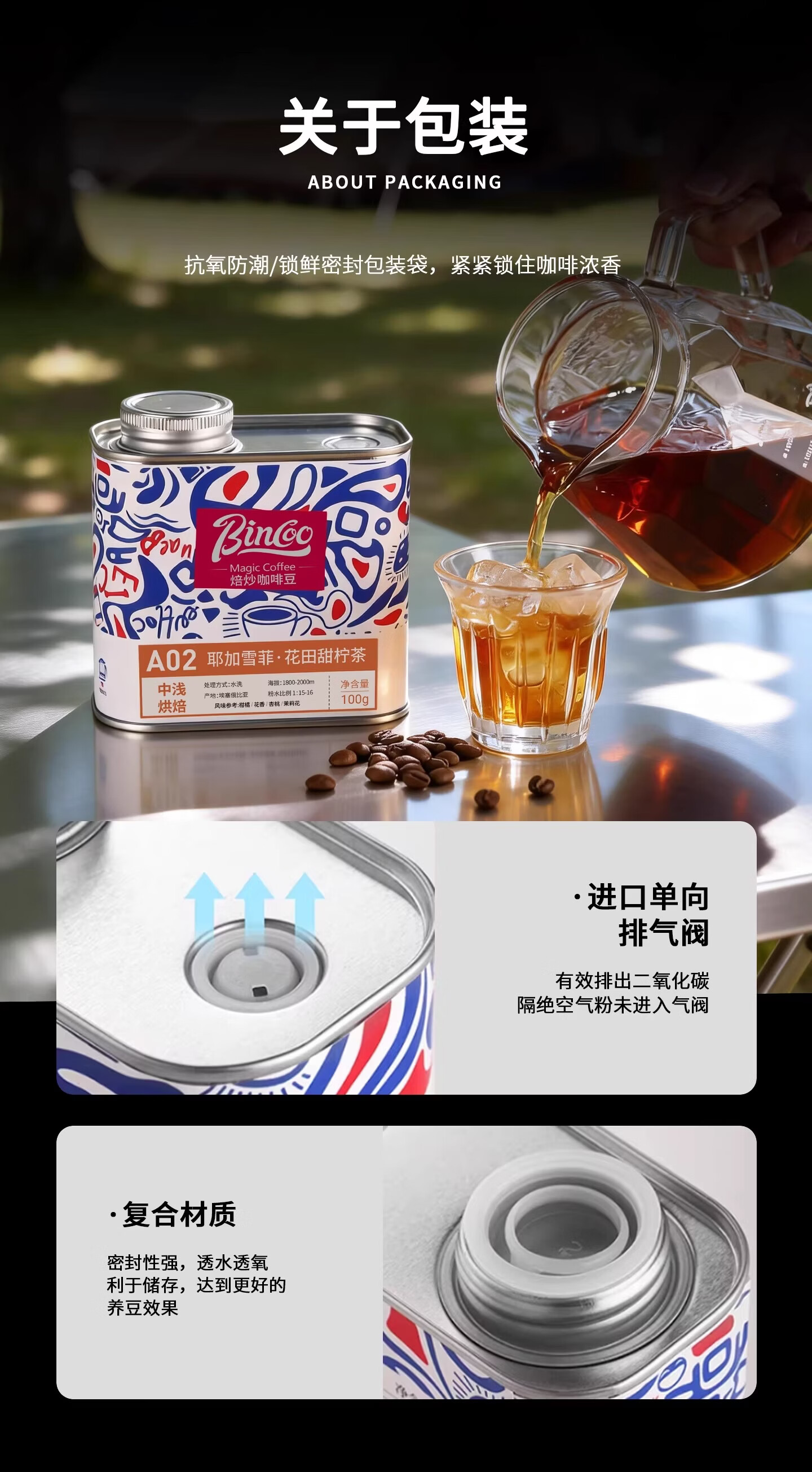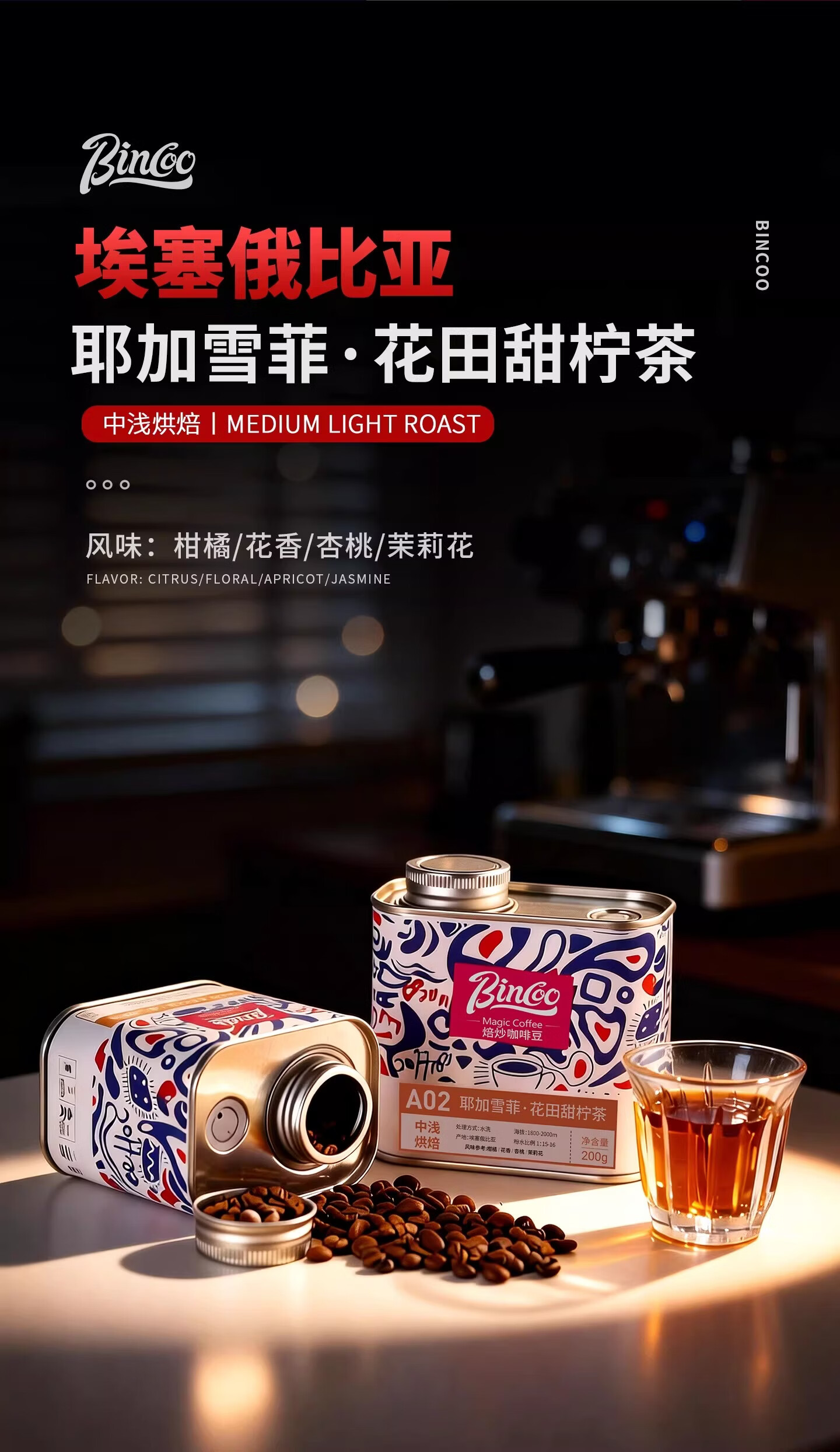 Bincoo耶加雪菲·花田甜柠茶A02手冲咖啡豆滴滤咖啡中浅烘焙水洗 100g罐装