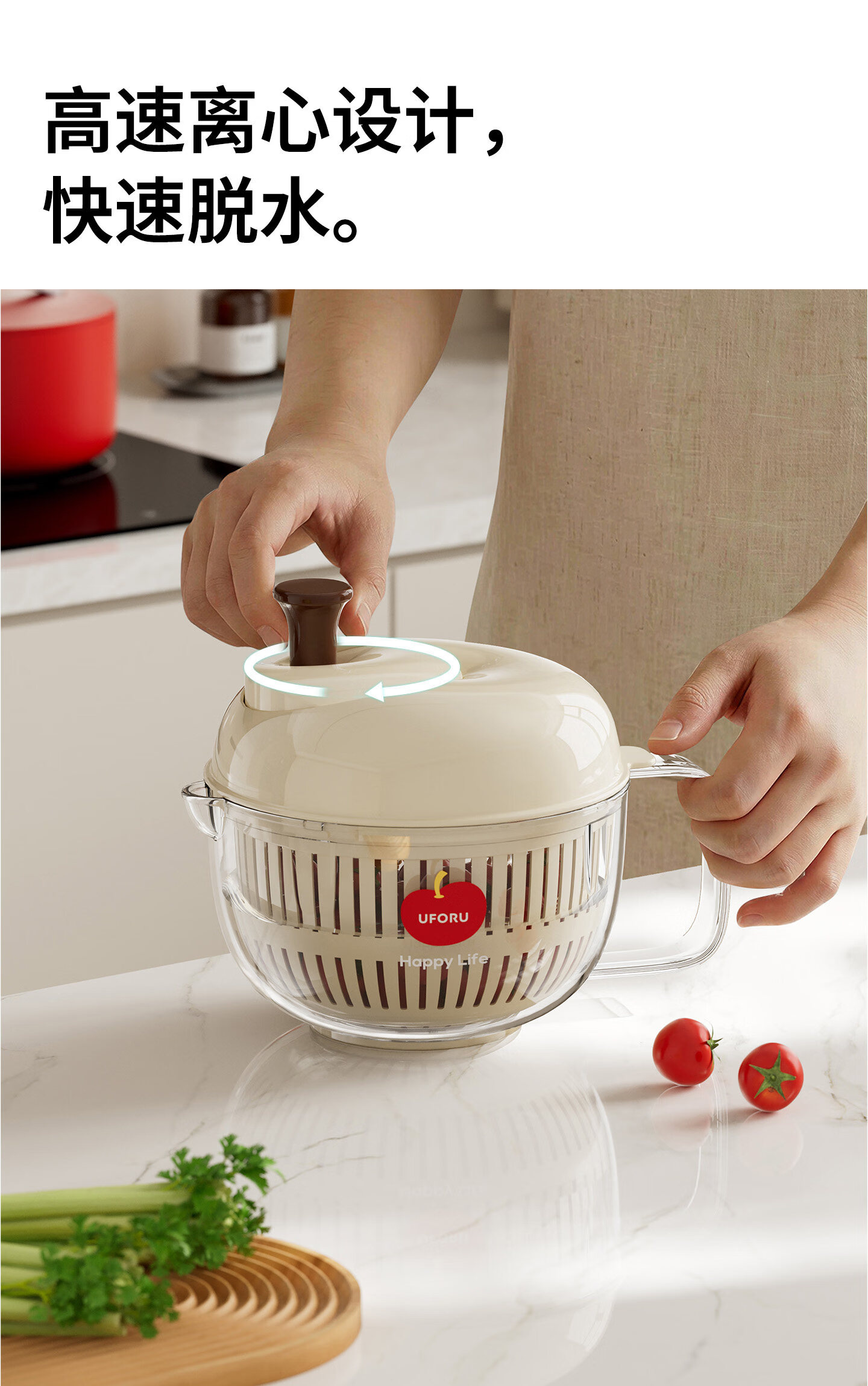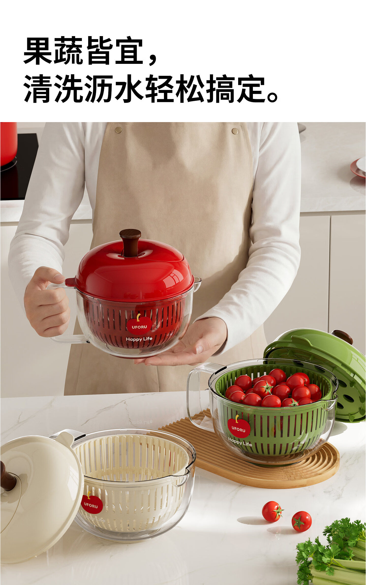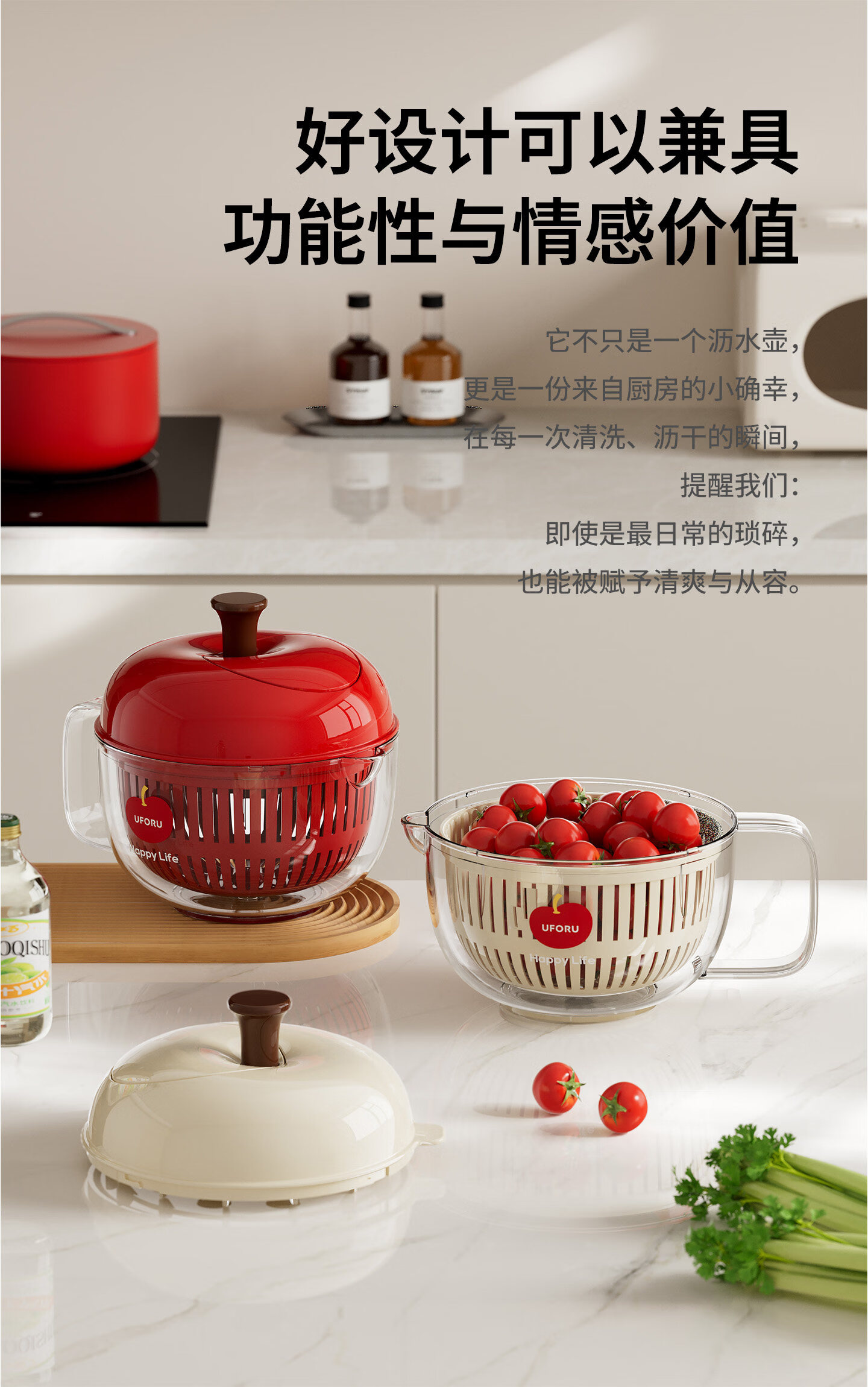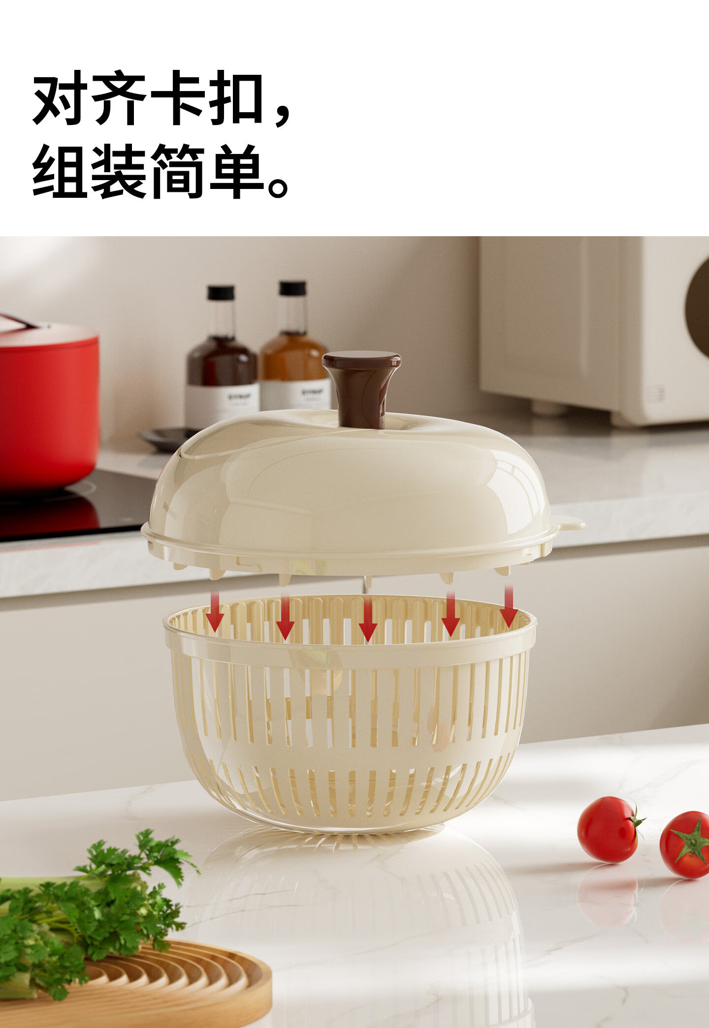 艾仕可(ASCOR)创意趣味苹果沥水篮大容量手摇旋转厨房果蔬清洗器加厚收纳篮 苹果沥水篮-奶油白