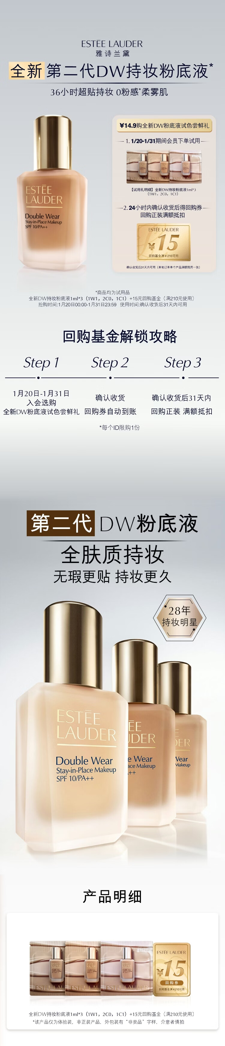 雅诗兰黛【返15元券】全新DW粉底液尝鲜礼(1W1 1ml+2C0 1ml+1C1 1ml)