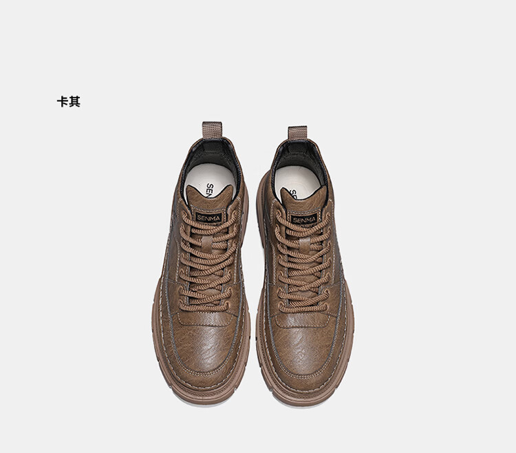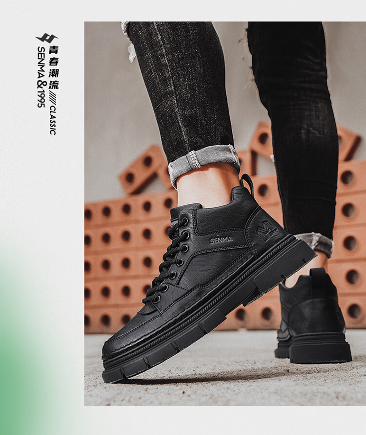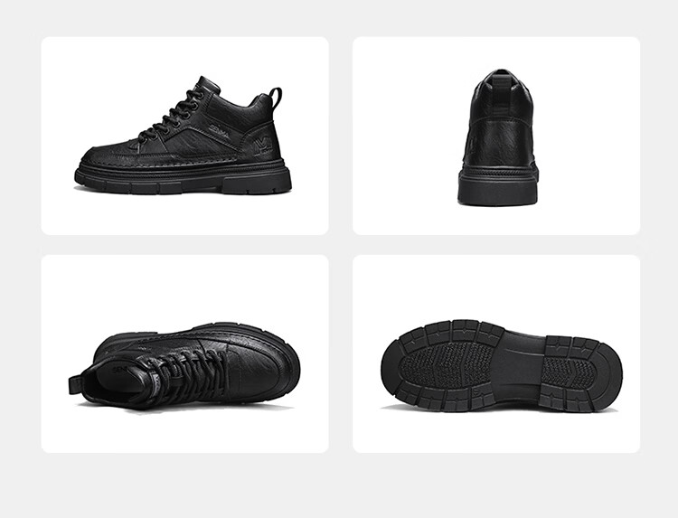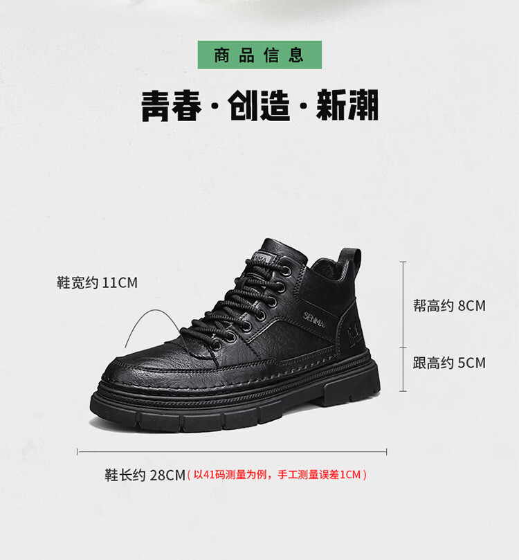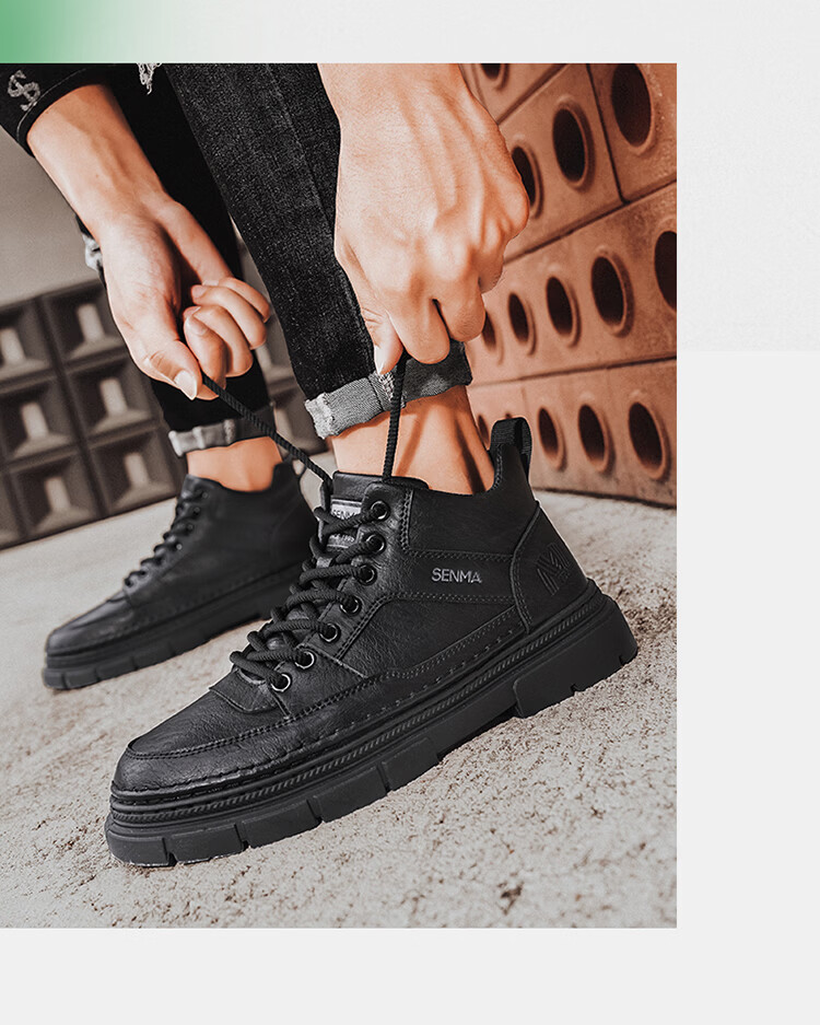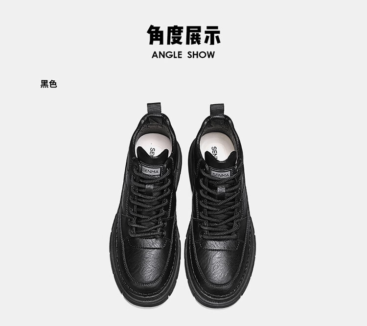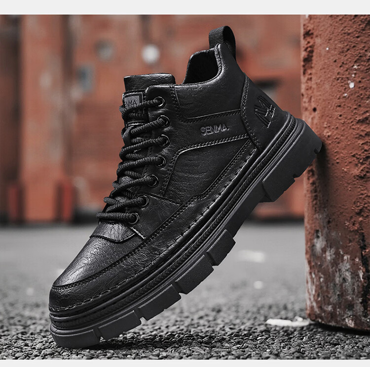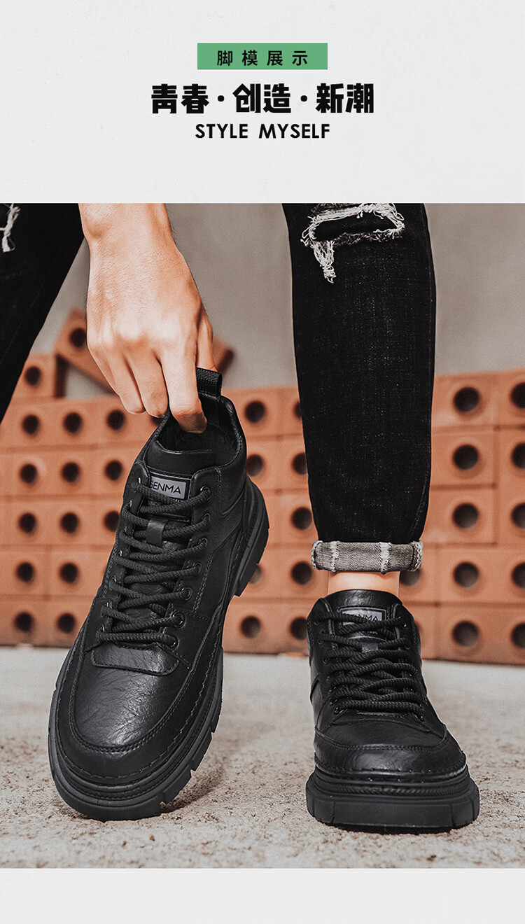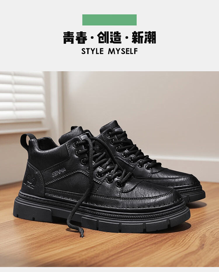 森馬男鞋2026春季高帮英伦风马丁靴男士防水软底真皮皮鞋增高工装潮鞋 黑色【基础款】 39 标准码数/现货秒发