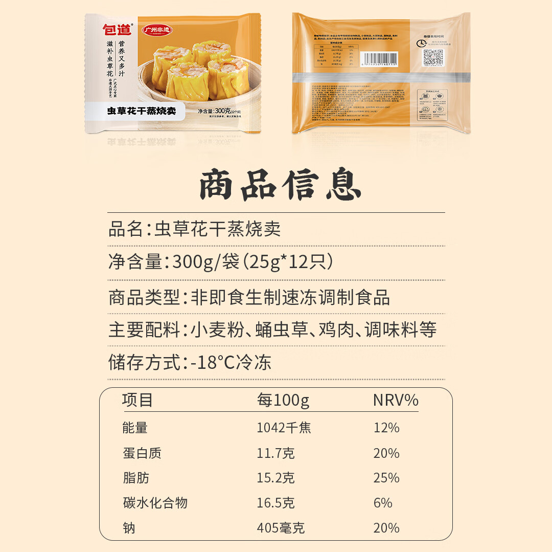 包道【任选5件更划算】鲜肉小笼包奶黄包冷冻速食包点早餐半成品面点 虫草花干蒸300g12个装*1包