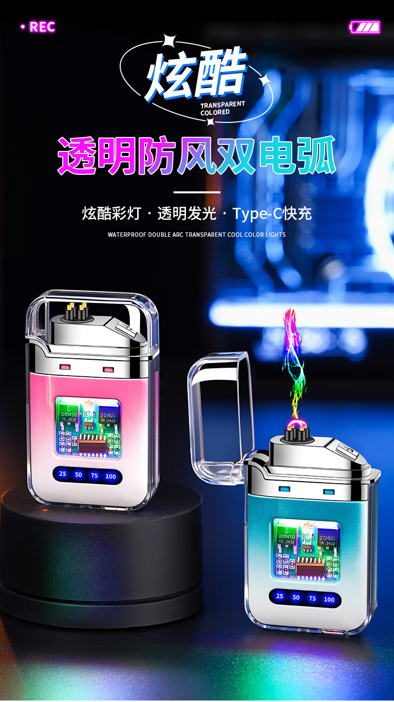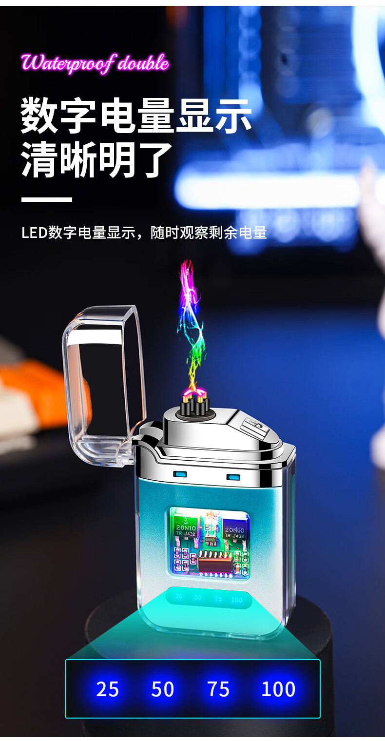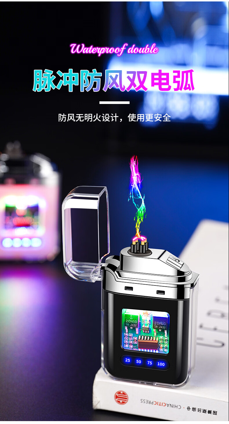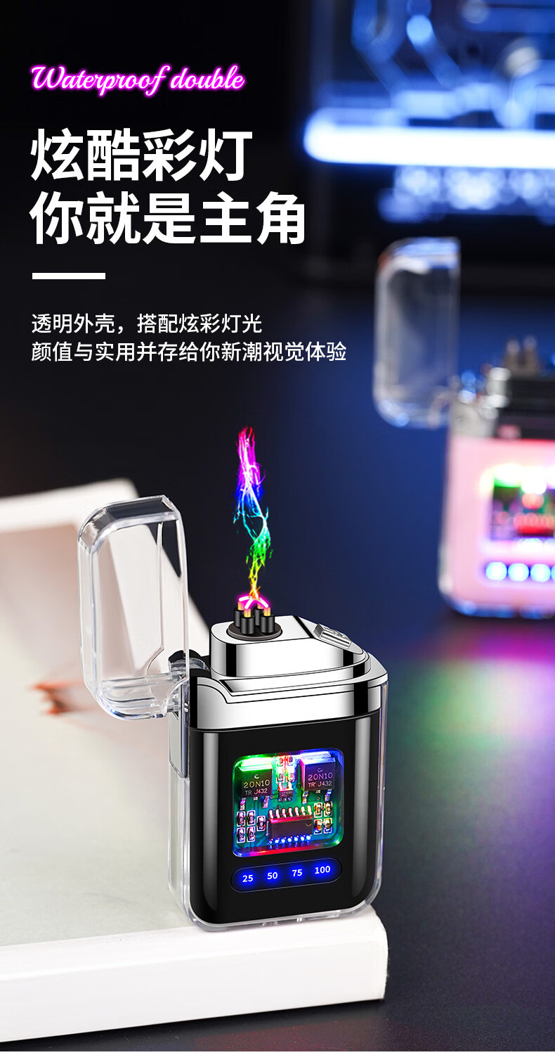DL胖东来同款创意打火机脉冲电弧充电防风炫酷透明壳渐变色防水电 炫灯黑