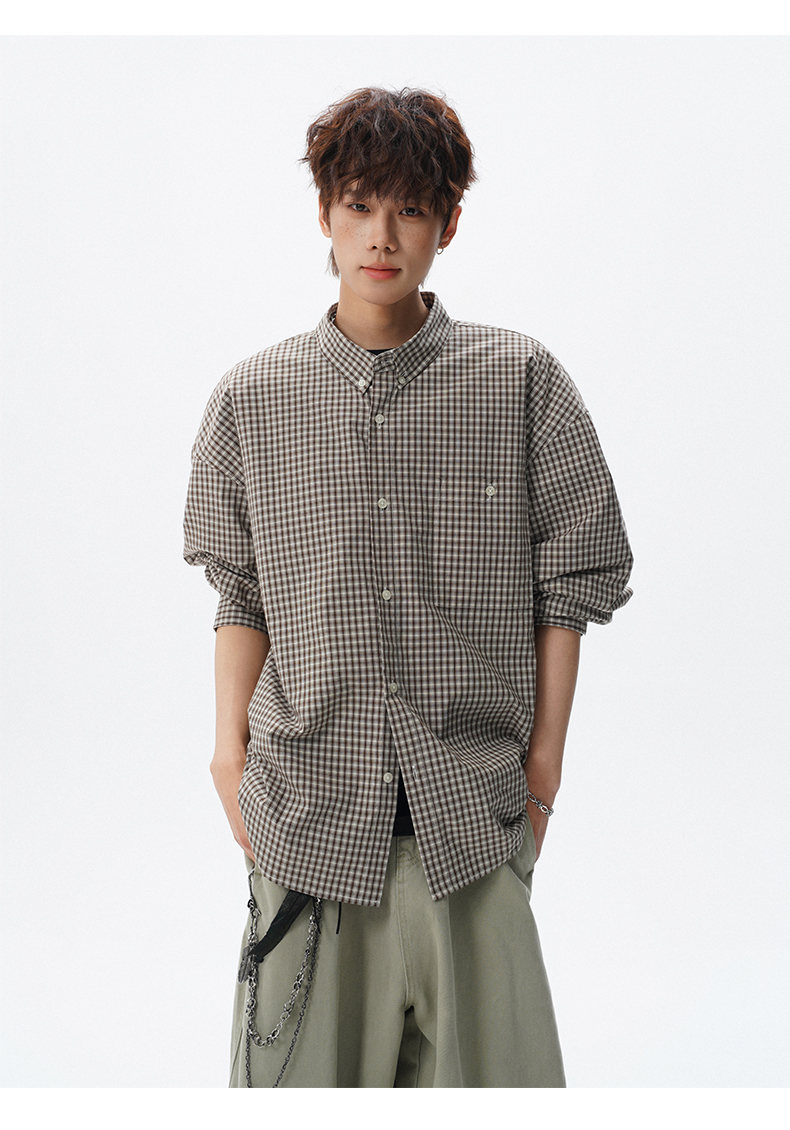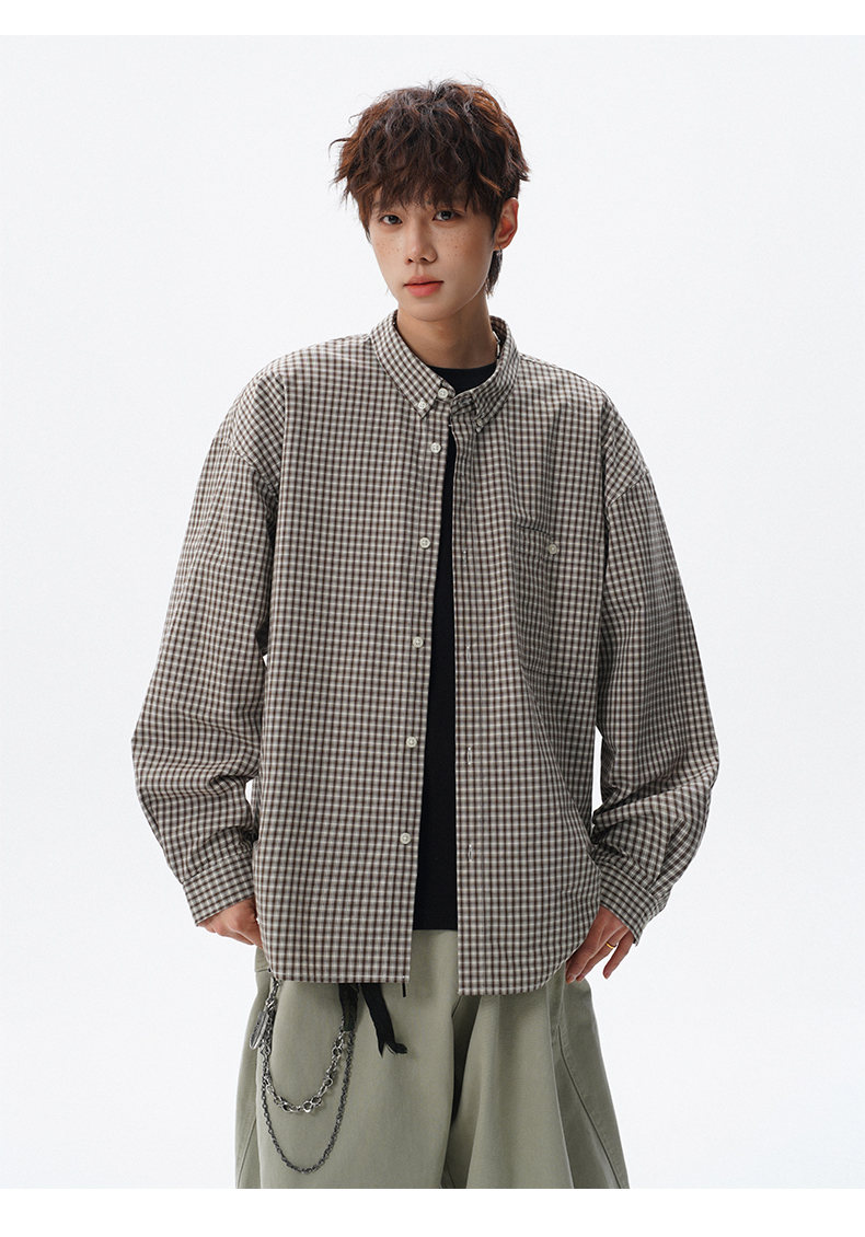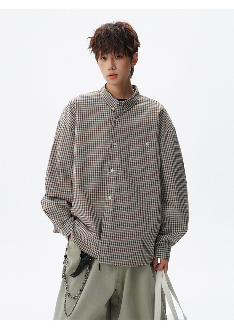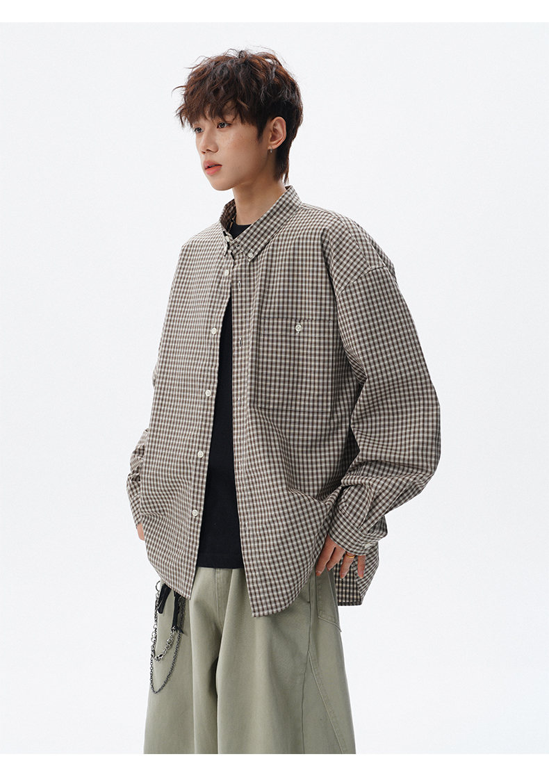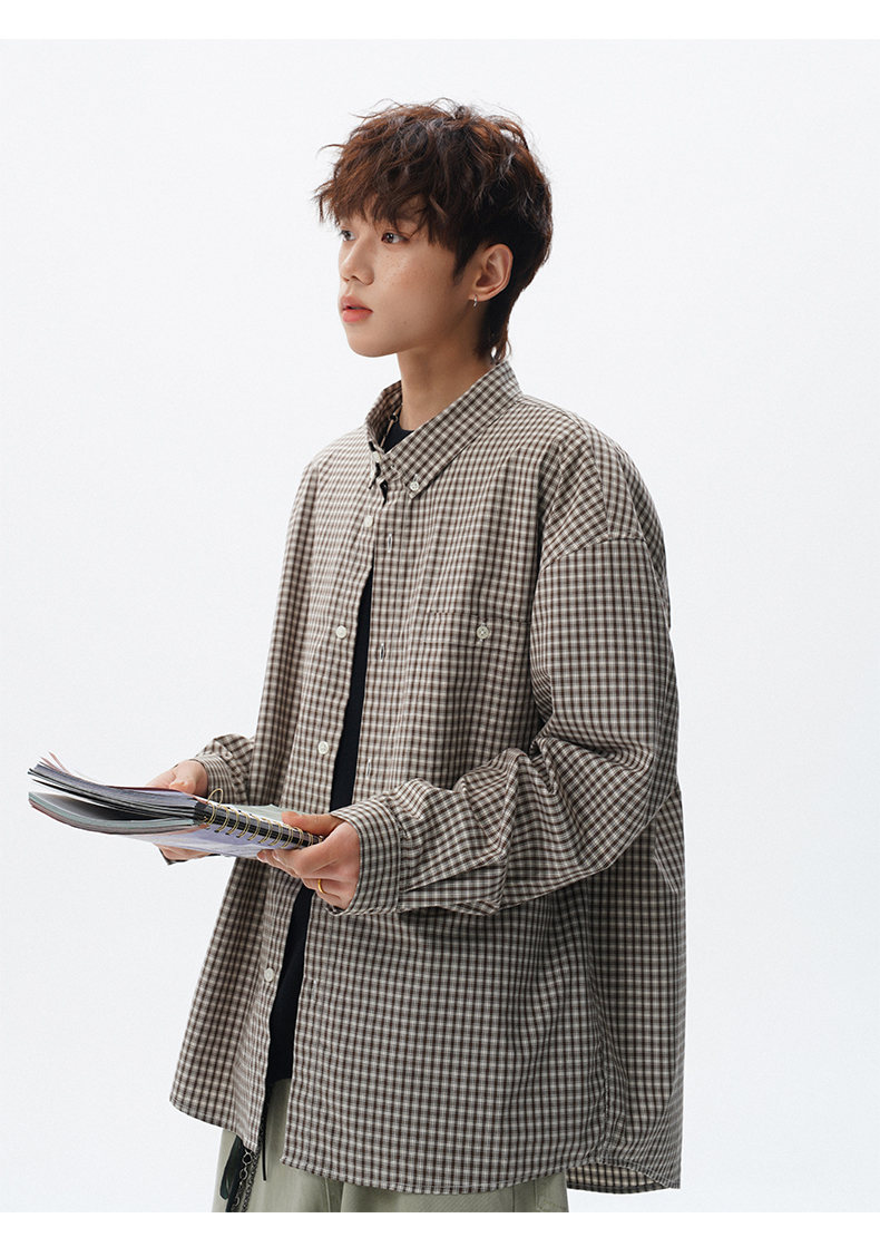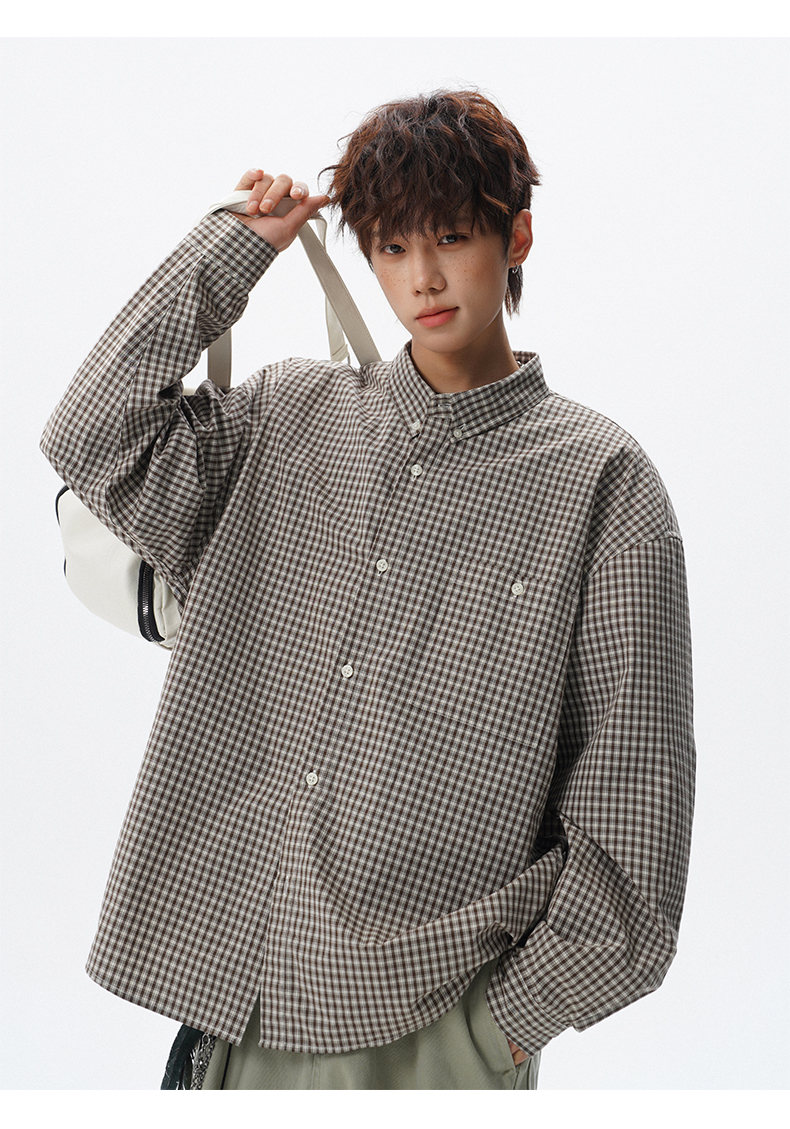 NEW OR MODE重磅格纹翻领衬衫男春季潮牌学院风情侣长袖衬衣复古宽松百搭外套 棕白色【高品质】 M 【建议90-110斤】