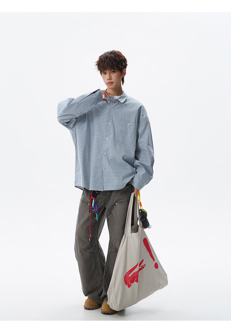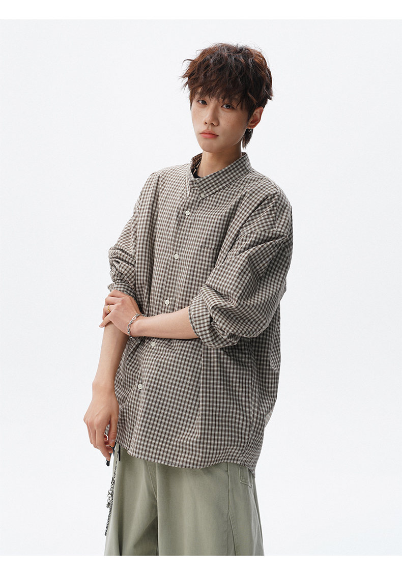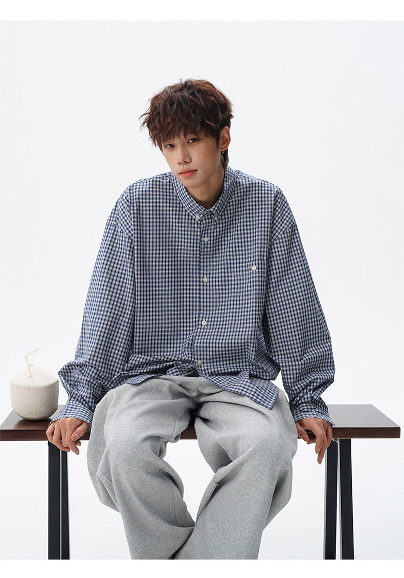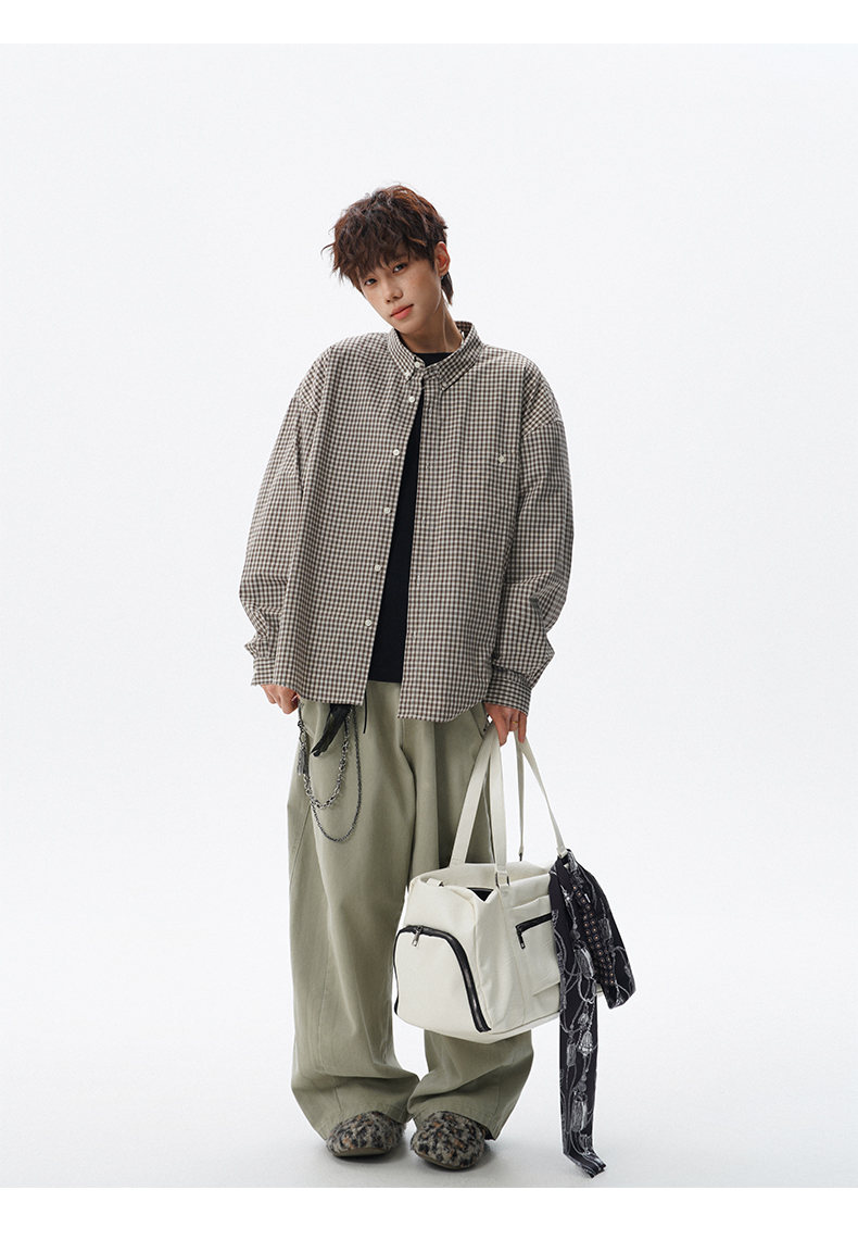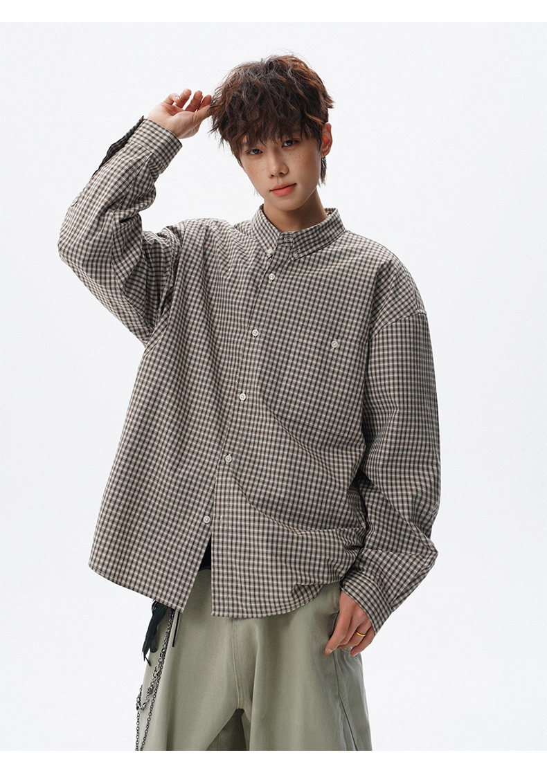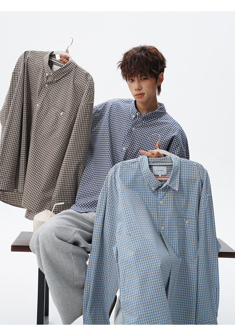 NEW OR MODE重磅格纹翻领衬衫男春季潮牌学院风情侣长袖衬衣复古宽松百搭外套 棕白色【高品质】 M 【建议90-110斤】