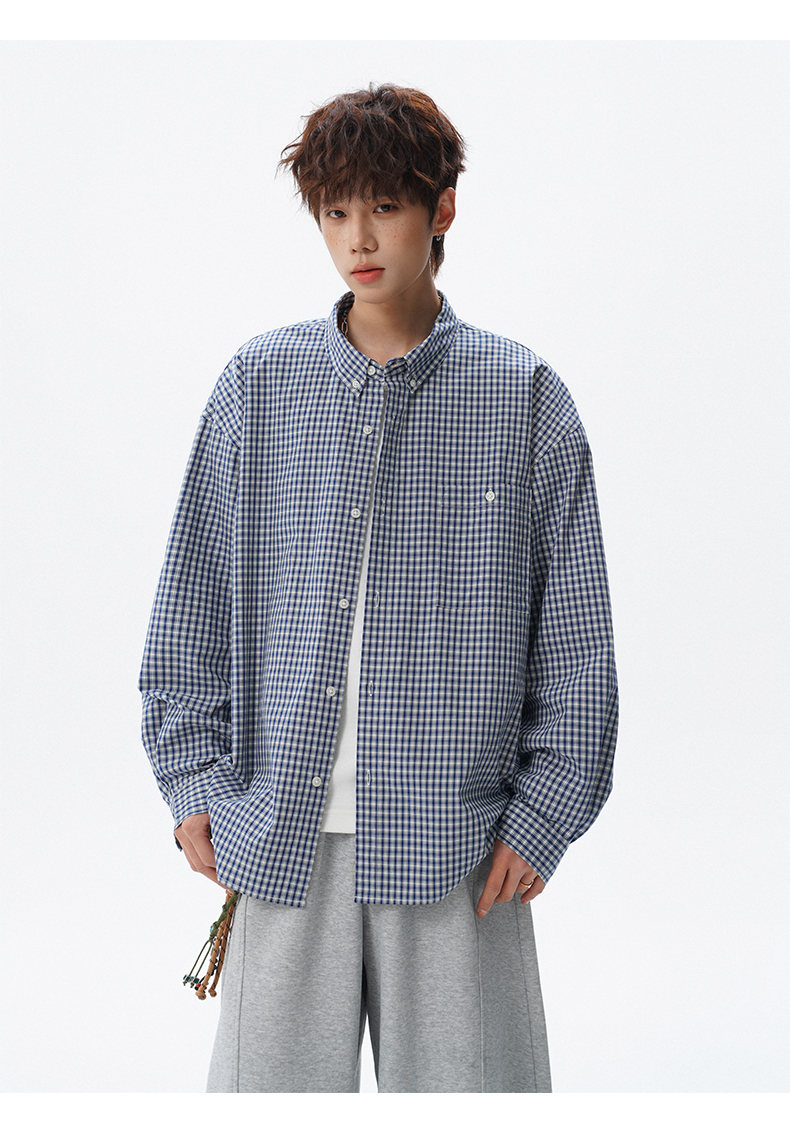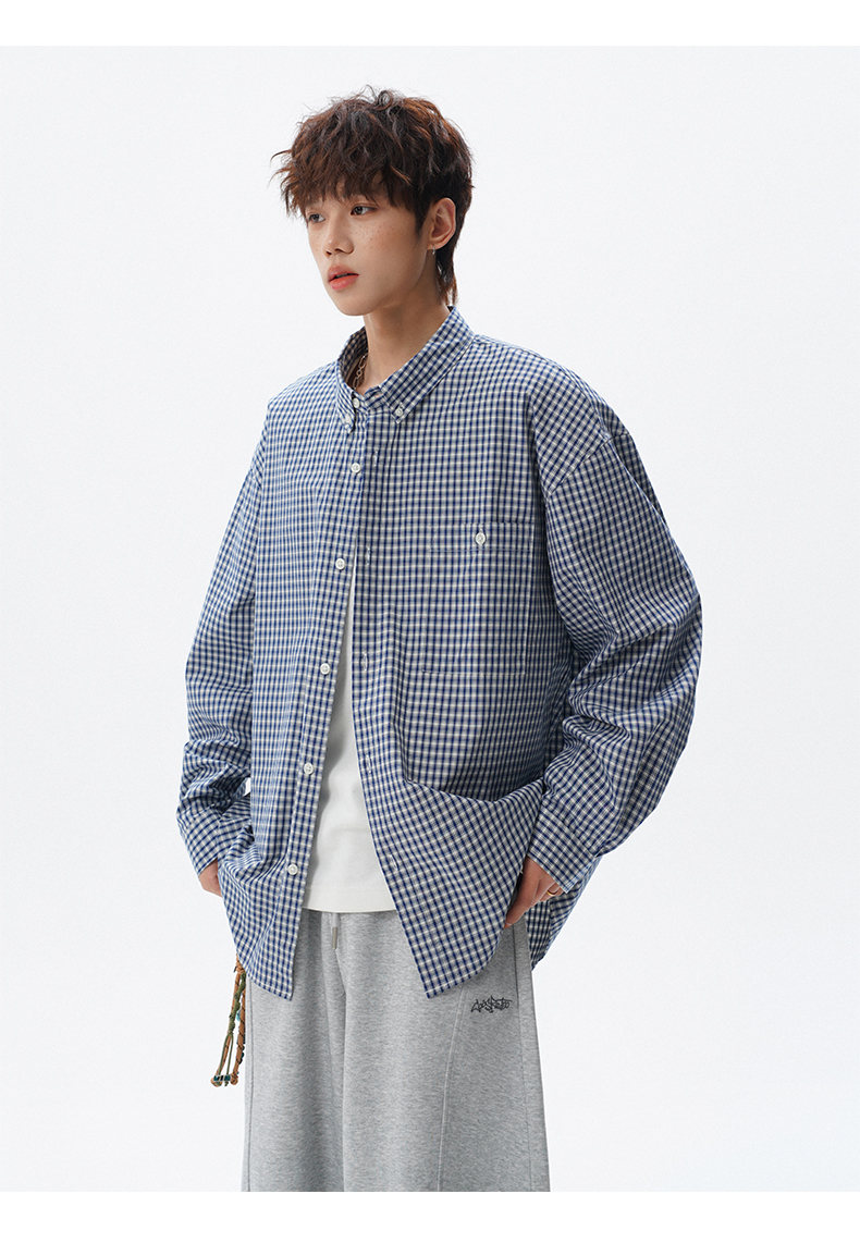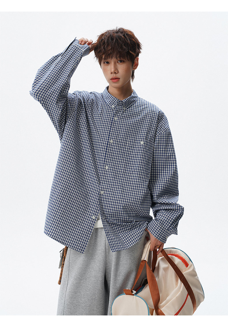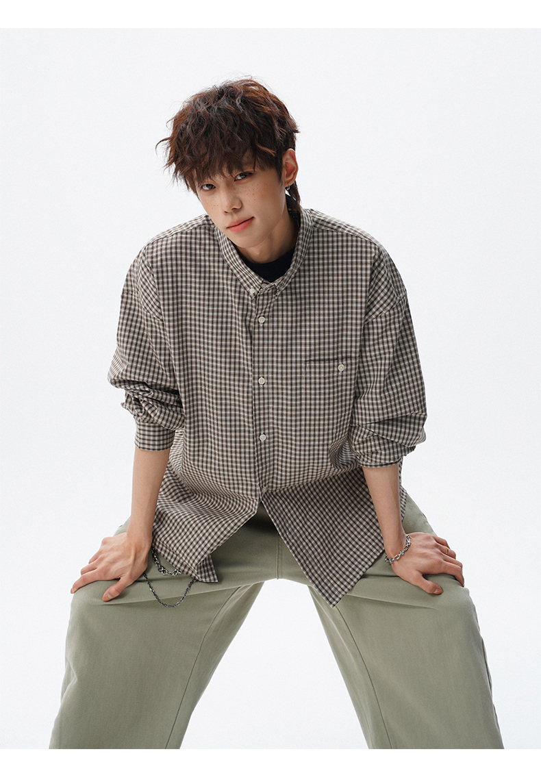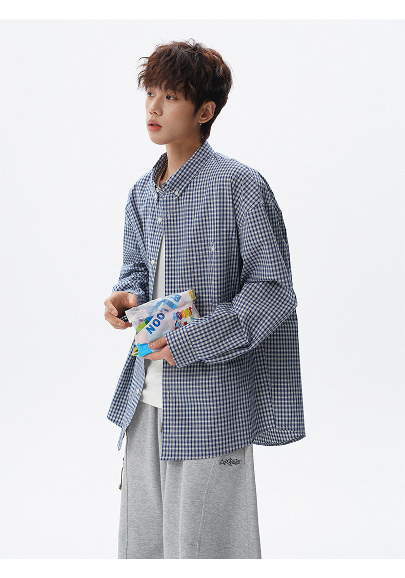 NEW OR MODE重磅格纹翻领衬衫男春季潮牌学院风情侣长袖衬衣复古宽松百搭外套 棕白色【高品质】 M 【建议90-110斤】