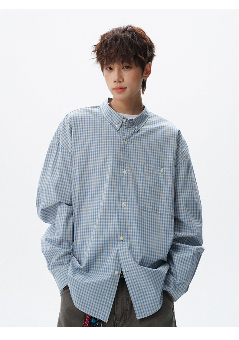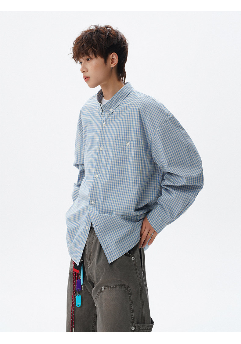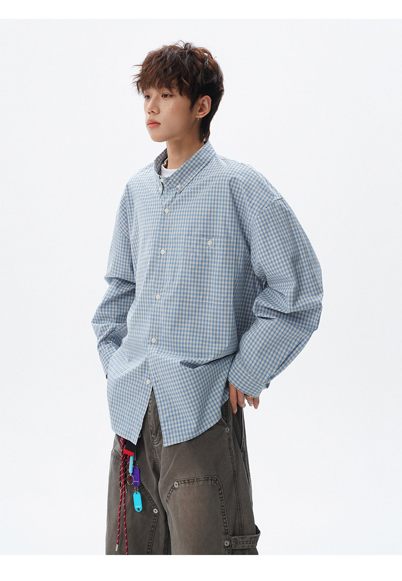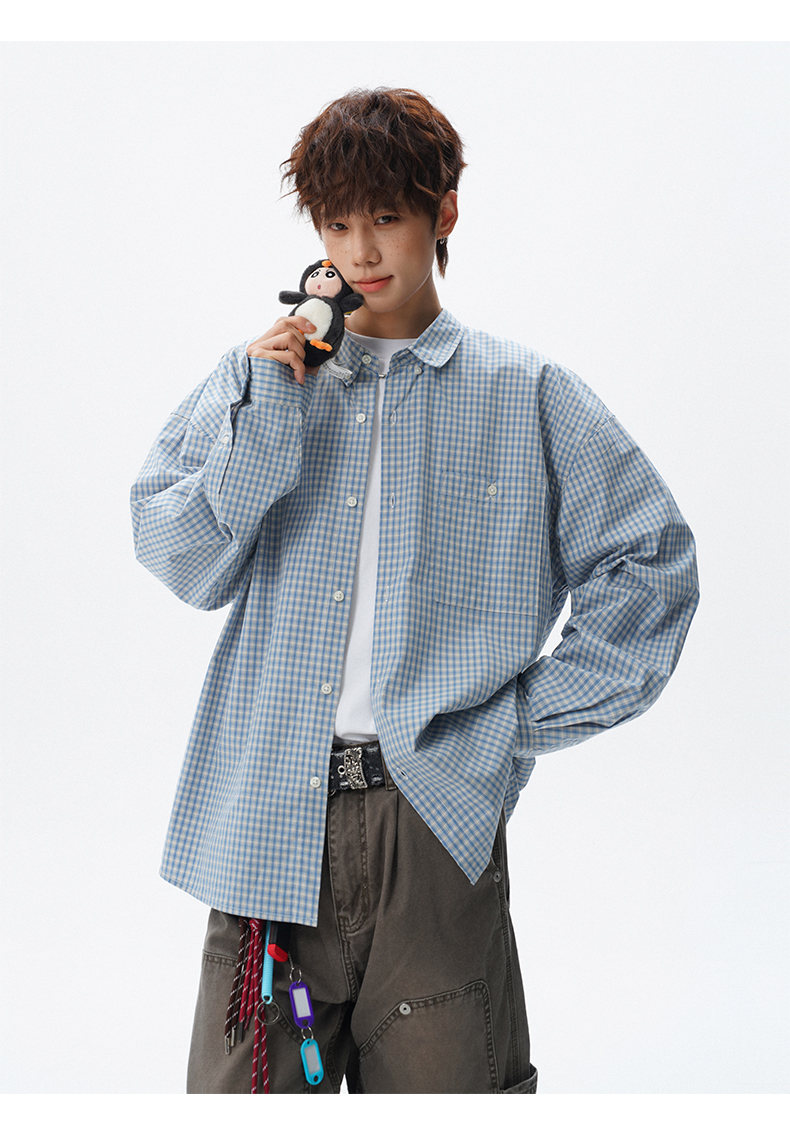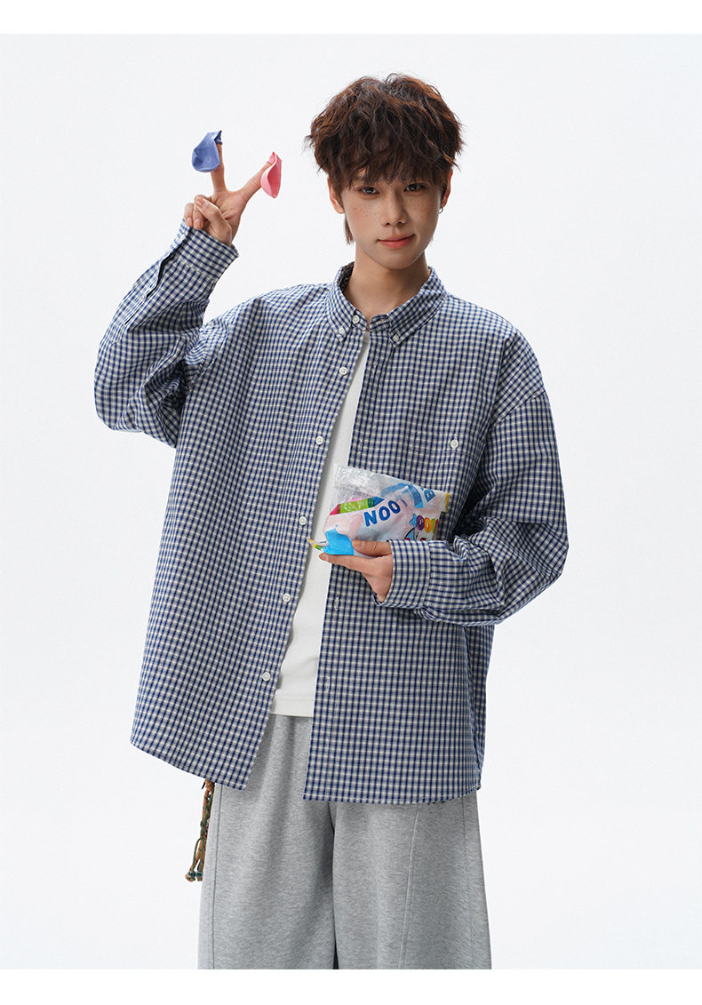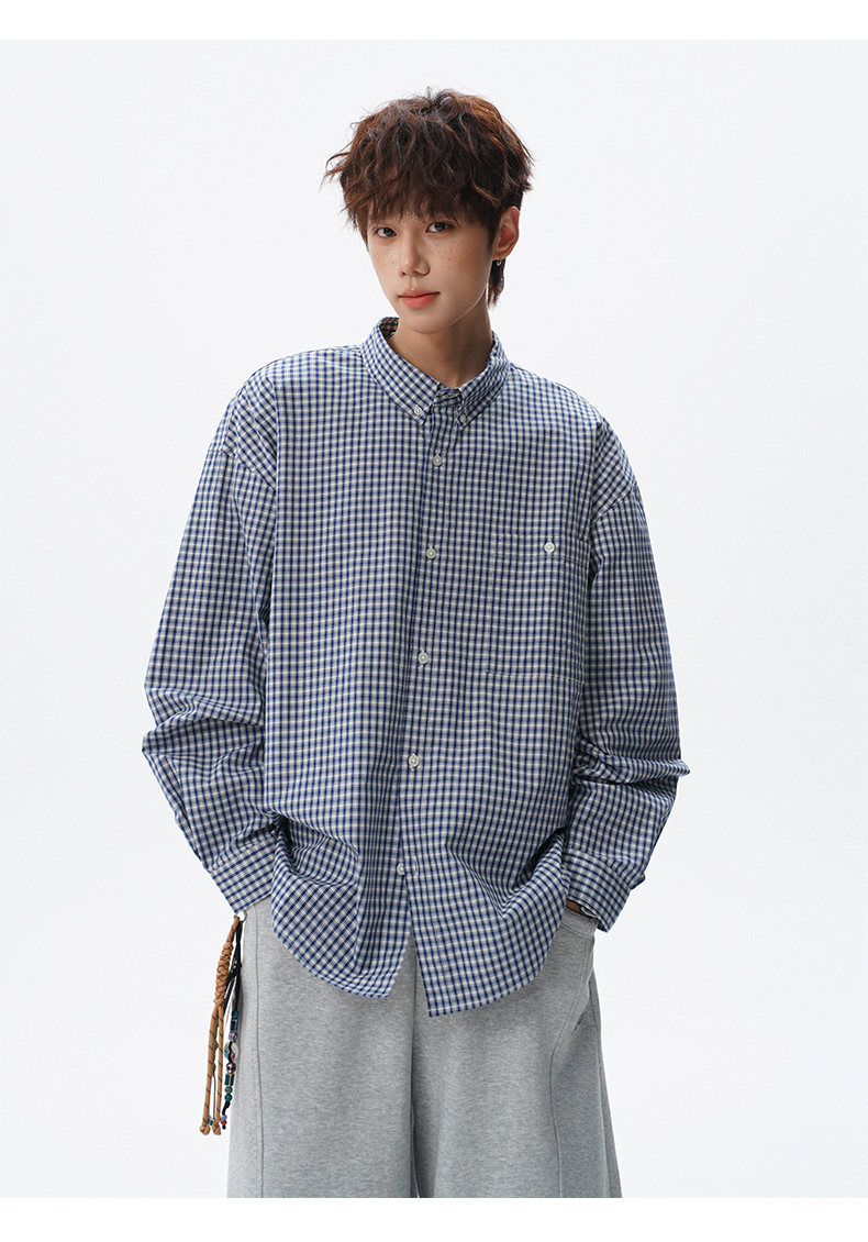 NEW OR MODE重磅格纹翻领衬衫男春季潮牌学院风情侣长袖衬衣复古宽松百搭外套 棕白色【高品质】 M 【建议90-110斤】