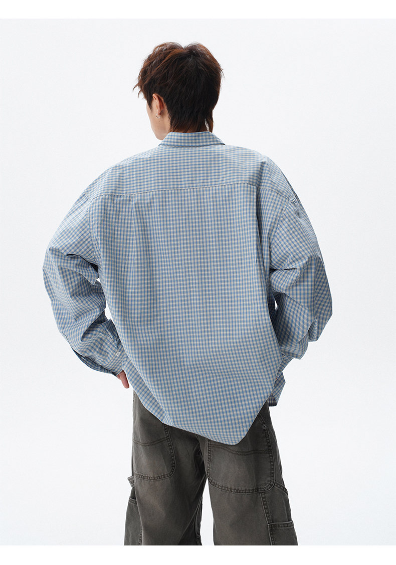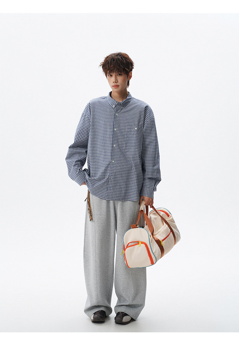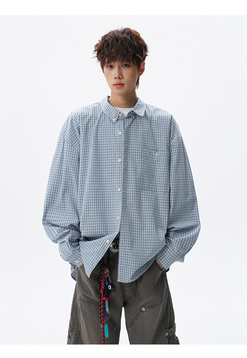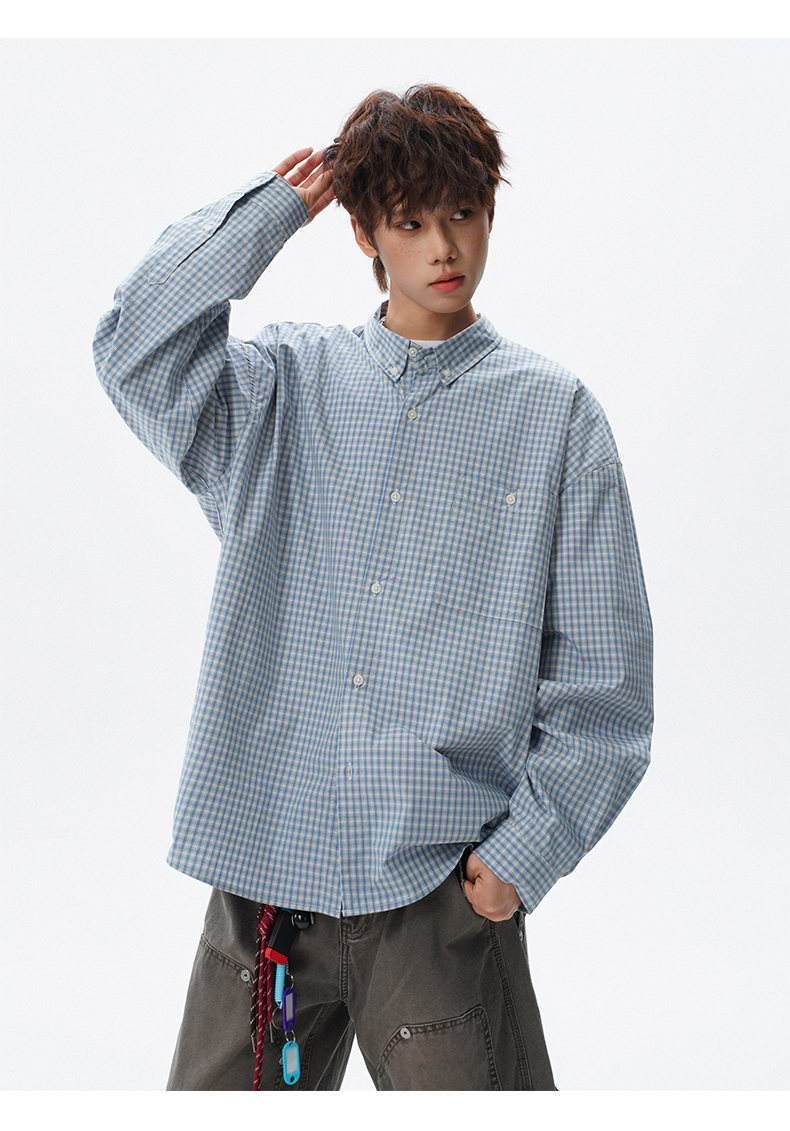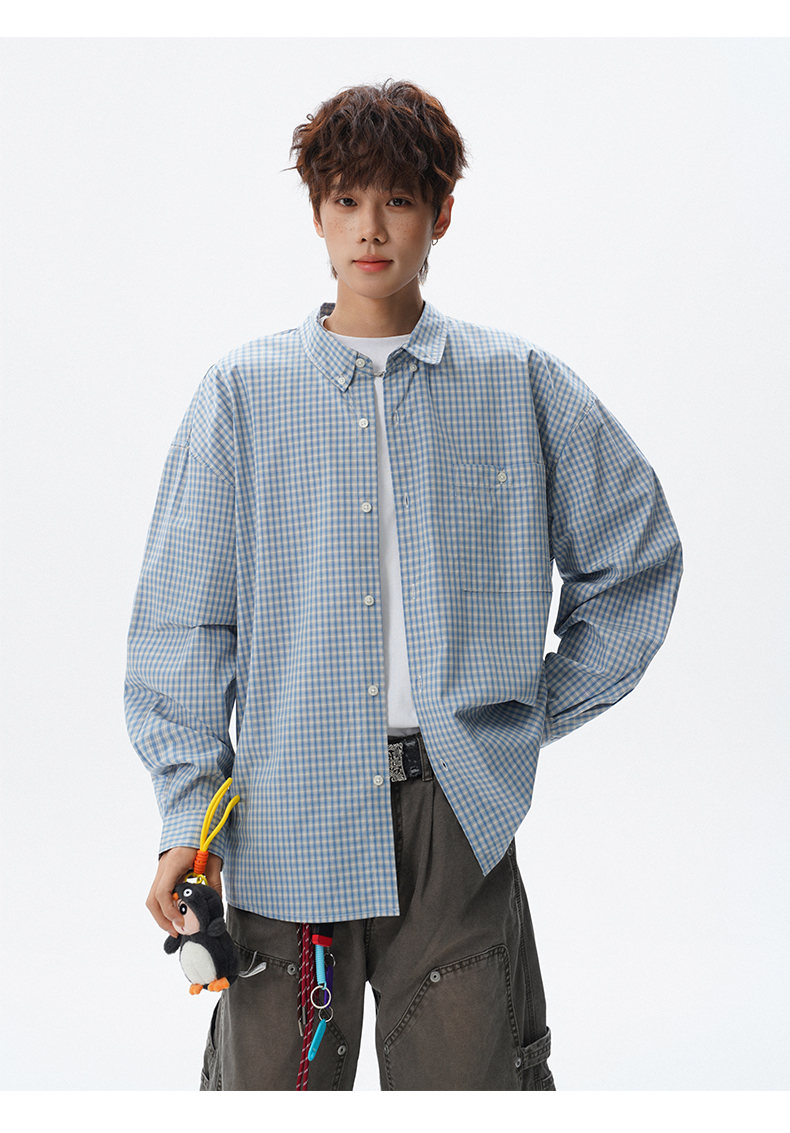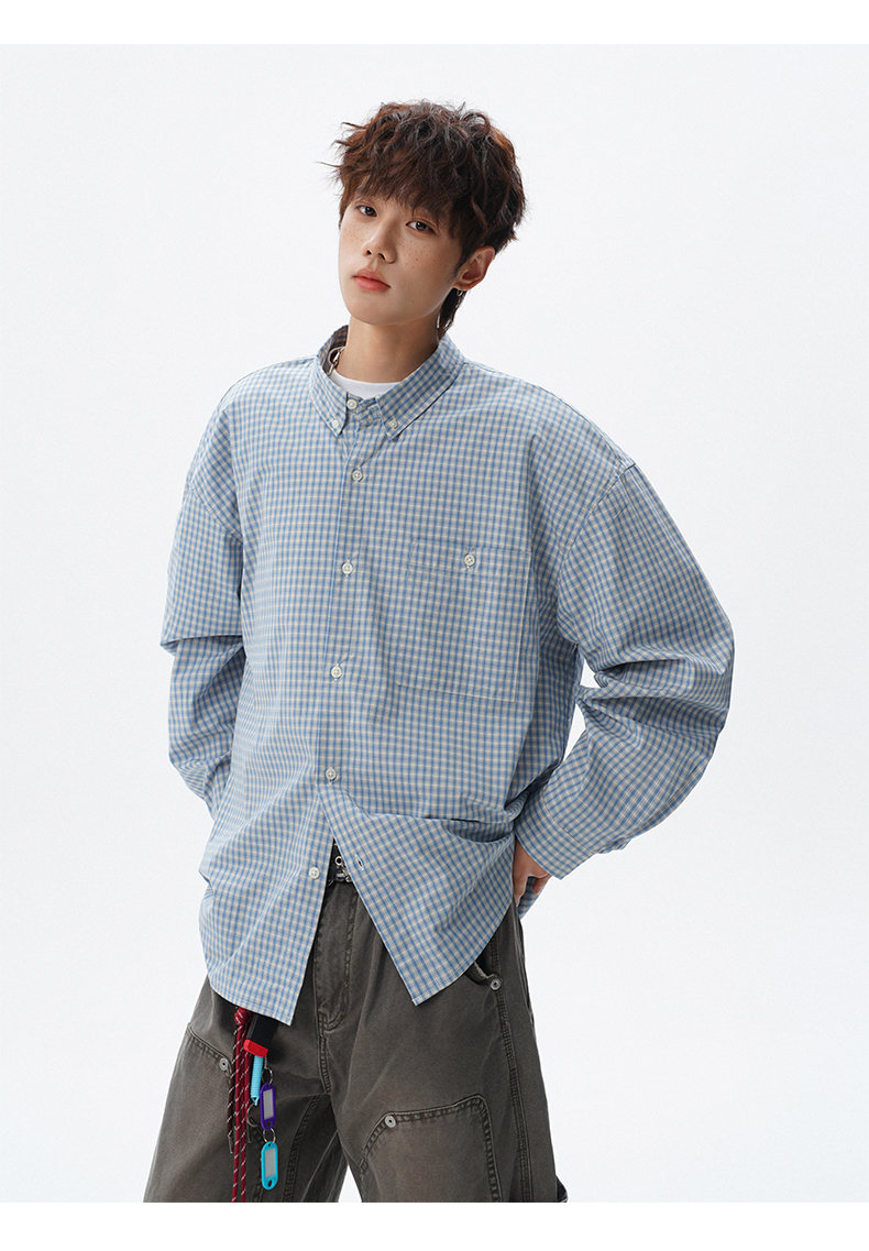 NEW OR MODE重磅格纹翻领衬衫男春季潮牌学院风情侣长袖衬衣复古宽松百搭外套 棕白色【高品质】 M 【建议90-110斤】