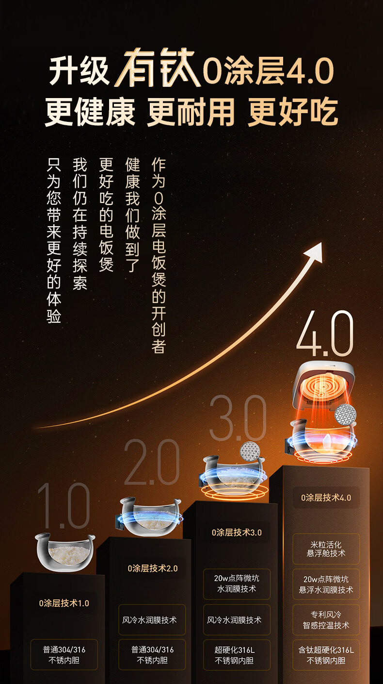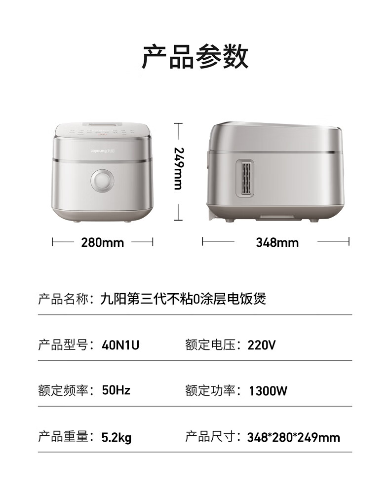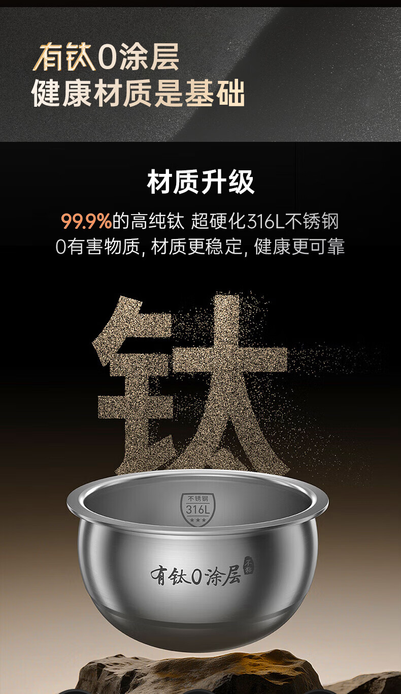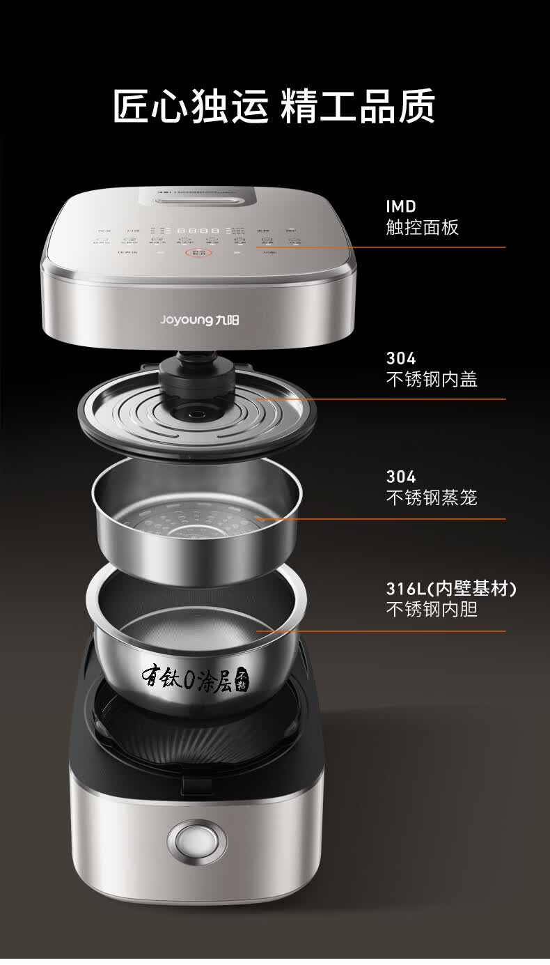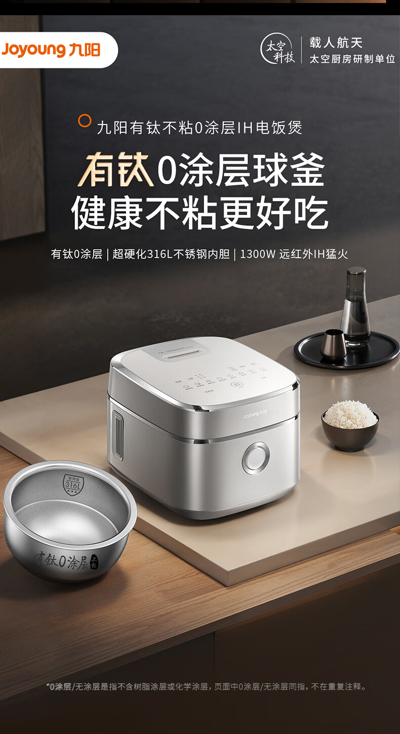 九阳(Joyoung)纯钛0涂层电饭煲防粘316L不锈钢内胆上蒸下煮4升3-4人1300W远红外IH电饭锅24h智能预约多口感40N1U