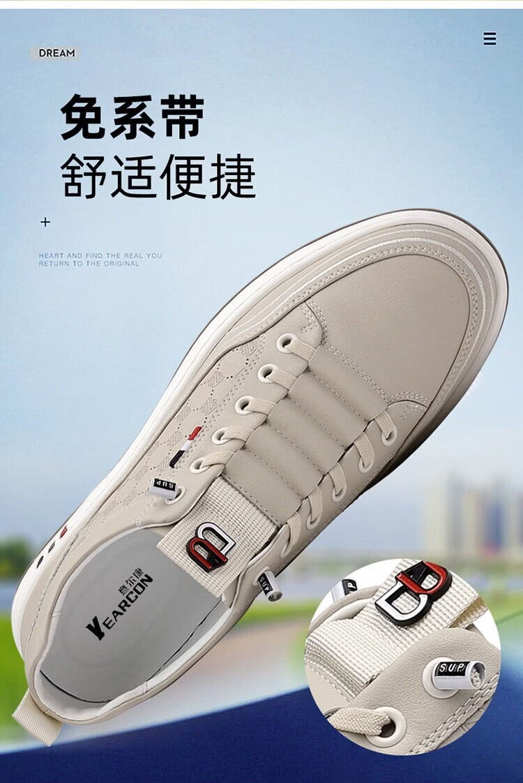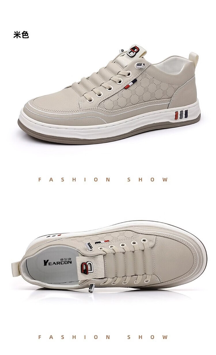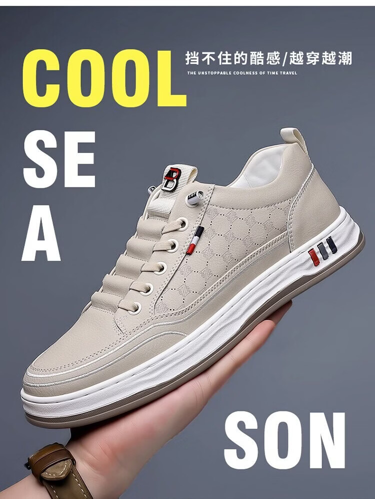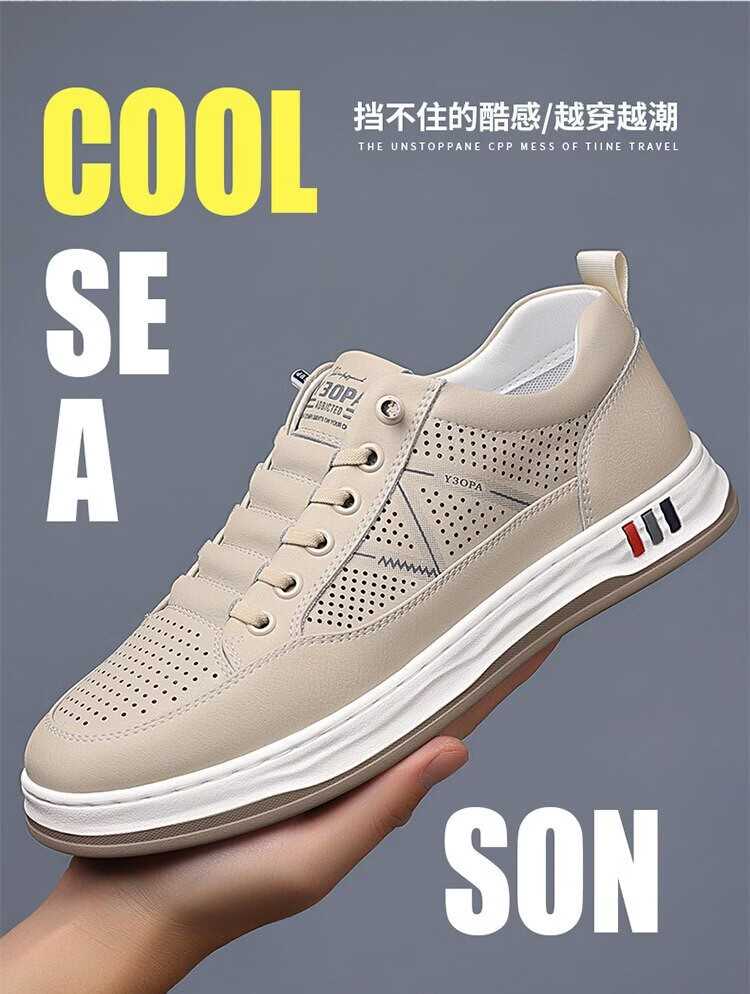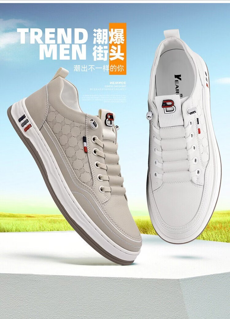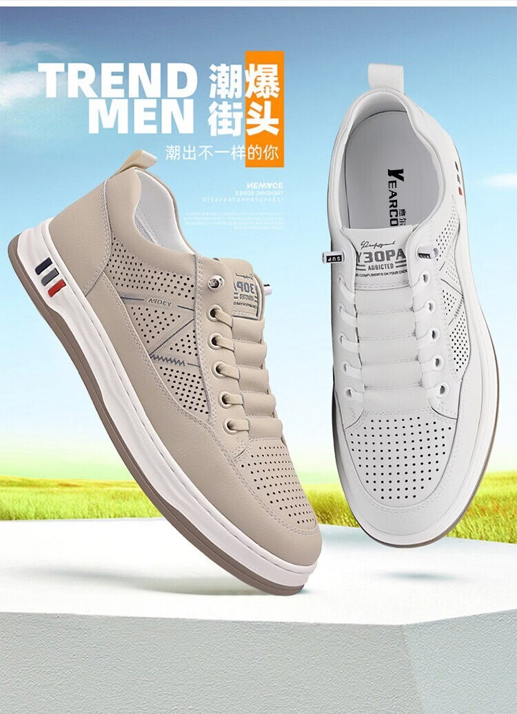 意尔康王子男鞋2026夏季新款真皮透气休闲板鞋男士百搭镂空潮流软底小白鞋男 米色 单层 真皮 40