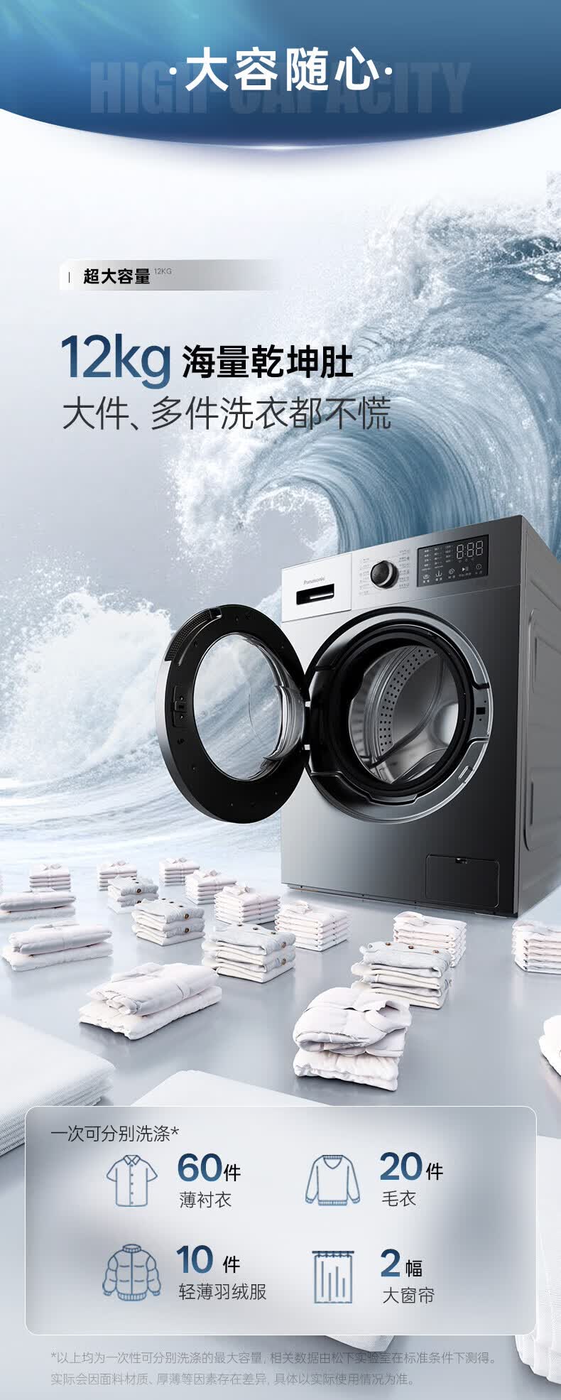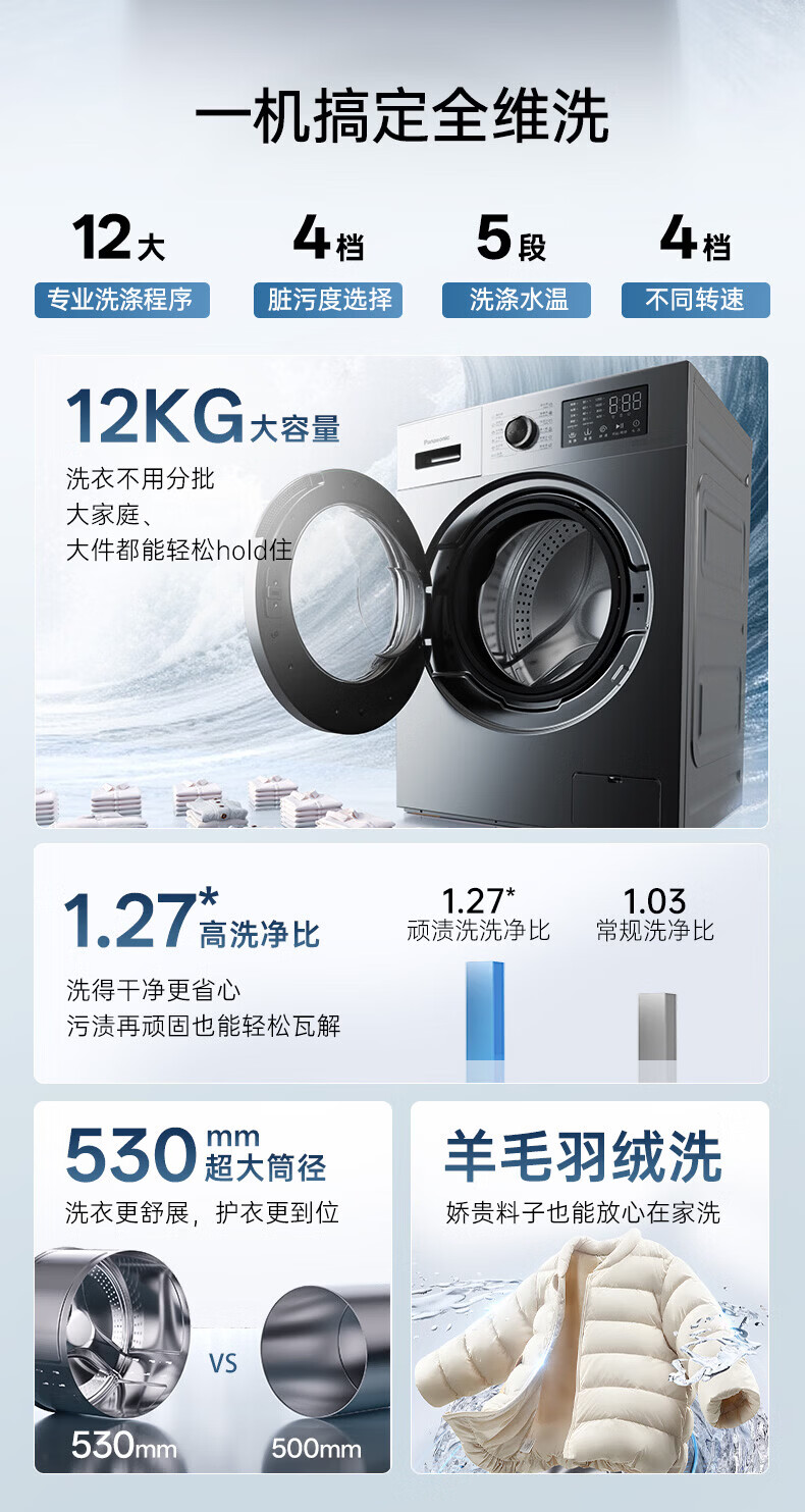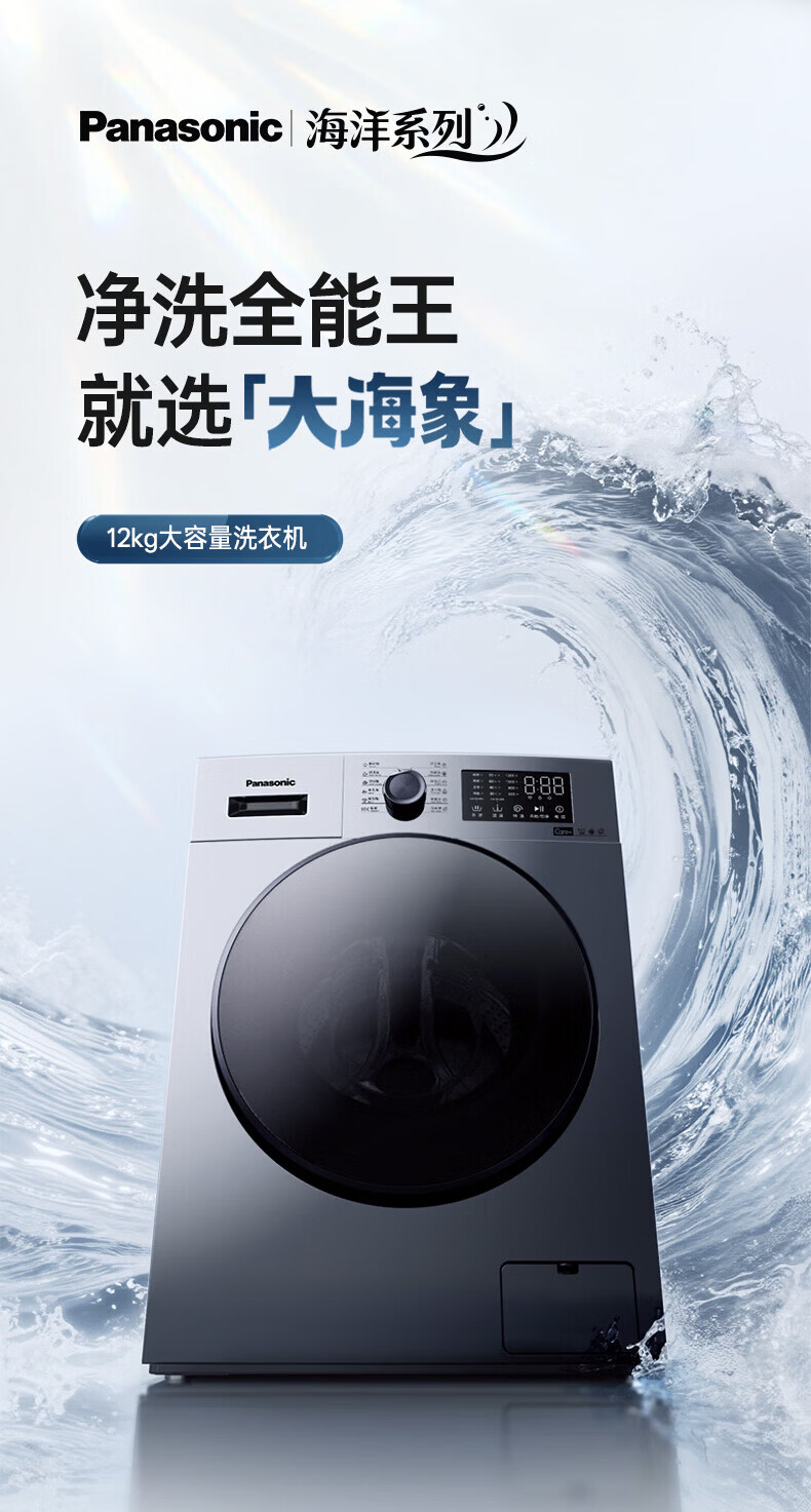 松下(Panasonic)滚筒洗衣机12公斤一级能效大海象家用大容量高温除菌除螨洗自清洁DD直驱变频1.27高洗净比大筒径 XQG120-J2M1 滚筒单洗 12kg