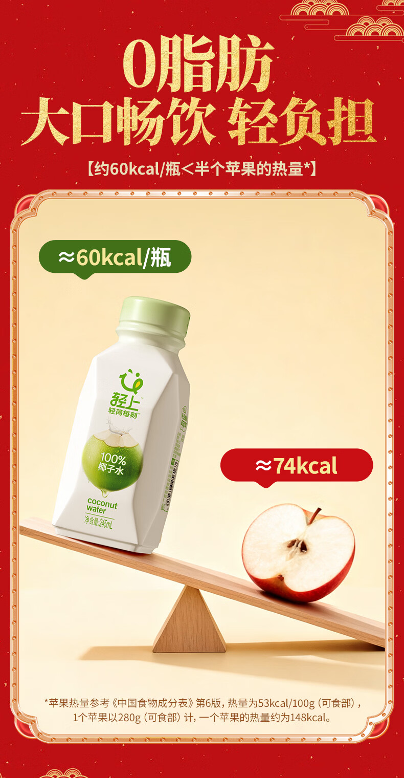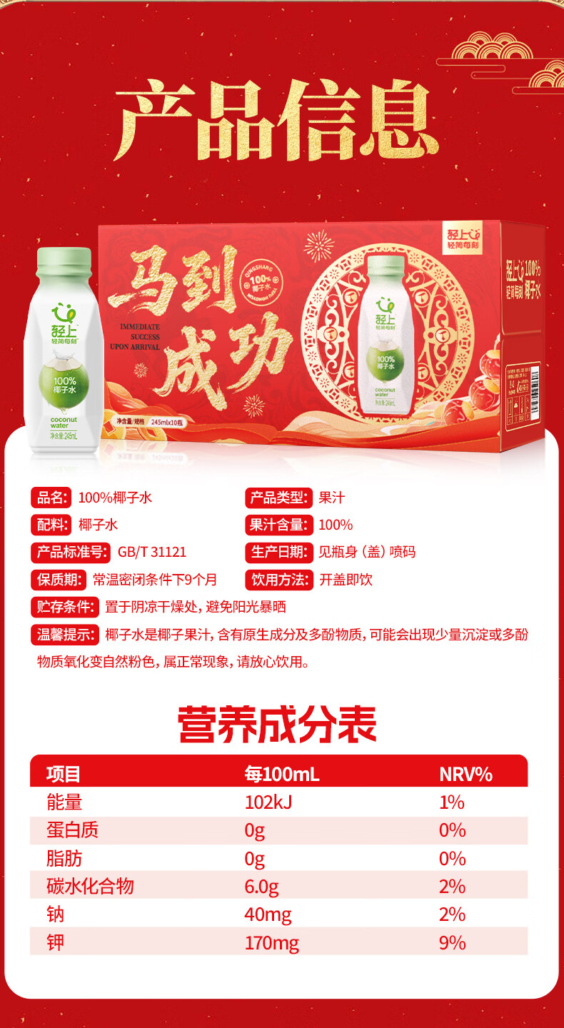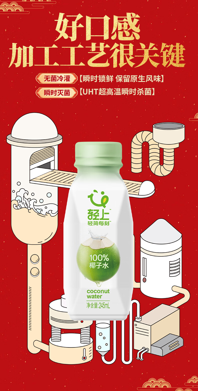 轻上100%椰汁水儿童孕妇果汁无添加剂天然电解质水新鲜椰青水年货饮料 100%椰汁水礼盒装245ml*10瓶