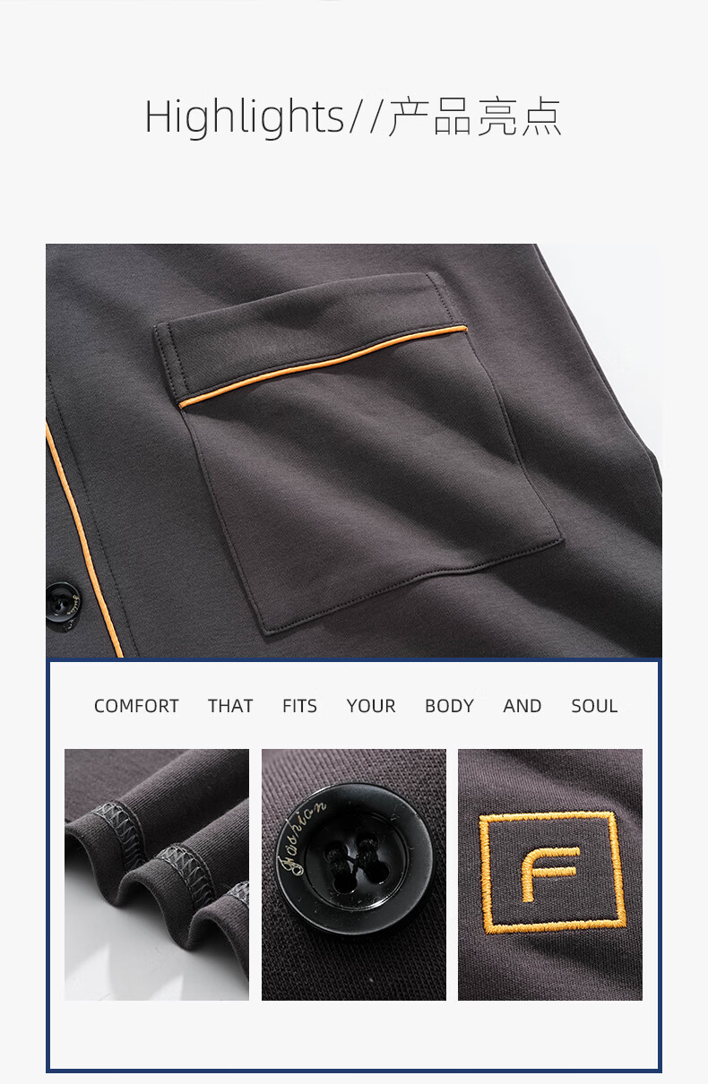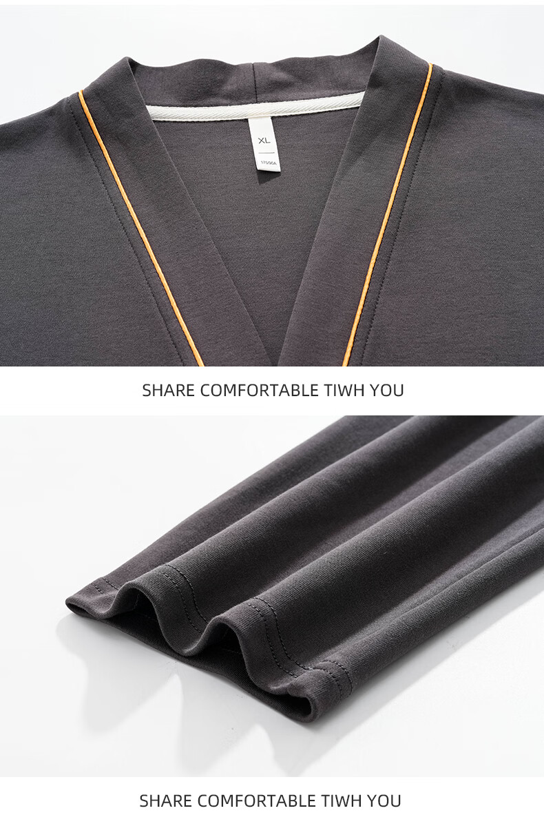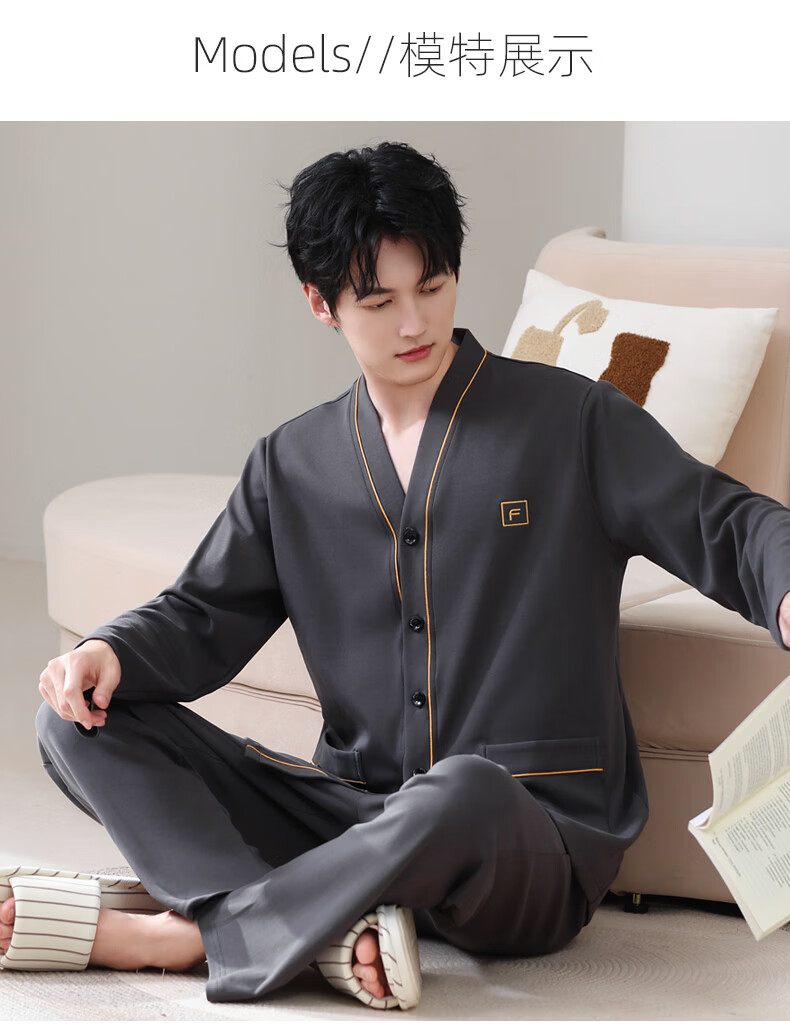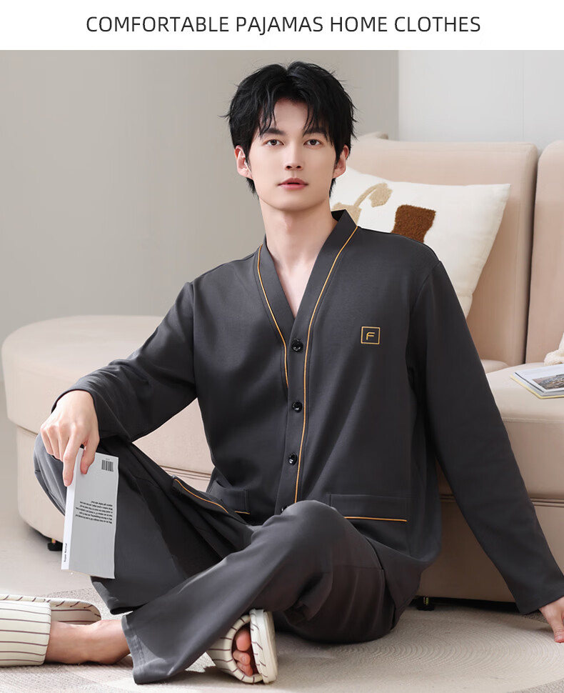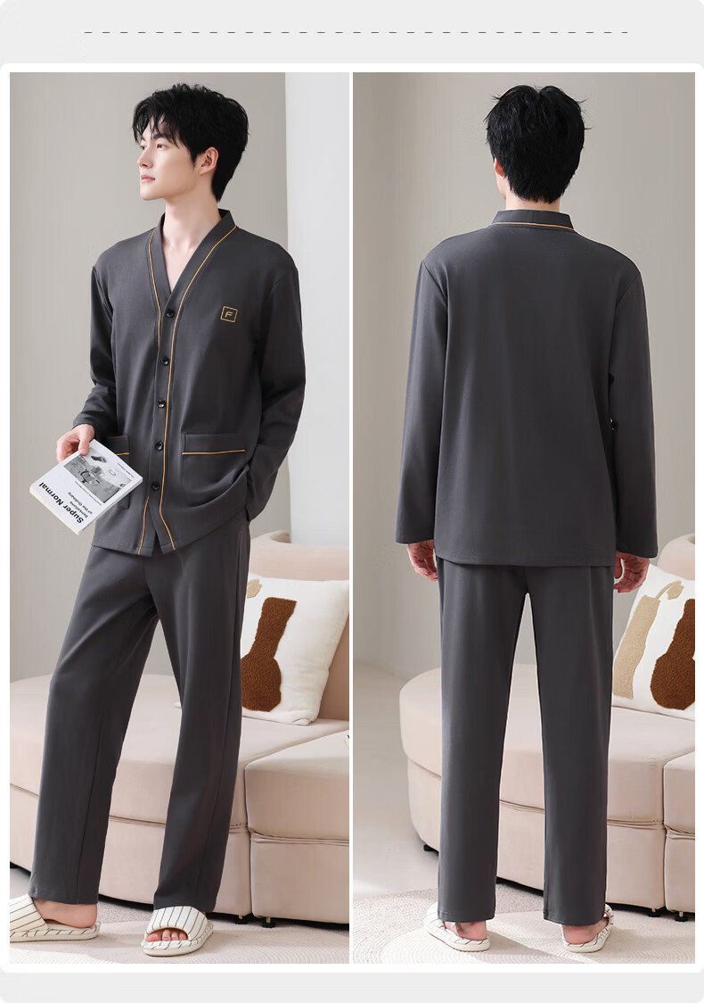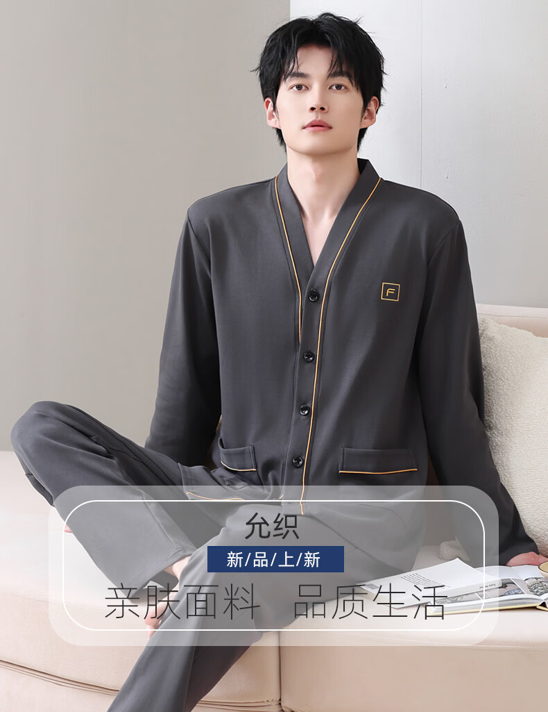 允织莱卡棉睡衣男士秋季纯棉长袖长裤开衫大码家居服春秋薄款翻领套装 8502-灰棕 L (170) :建议100-135斤穿着