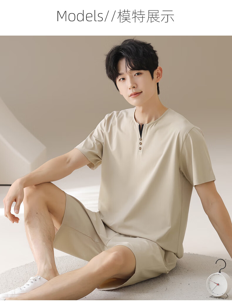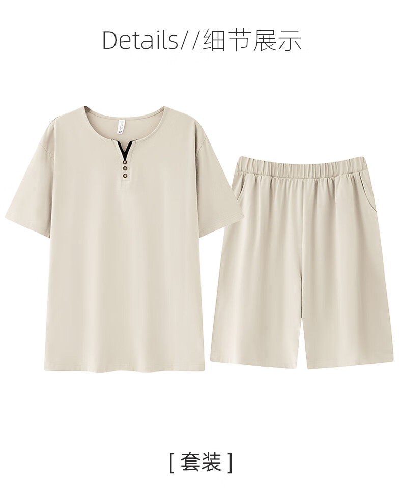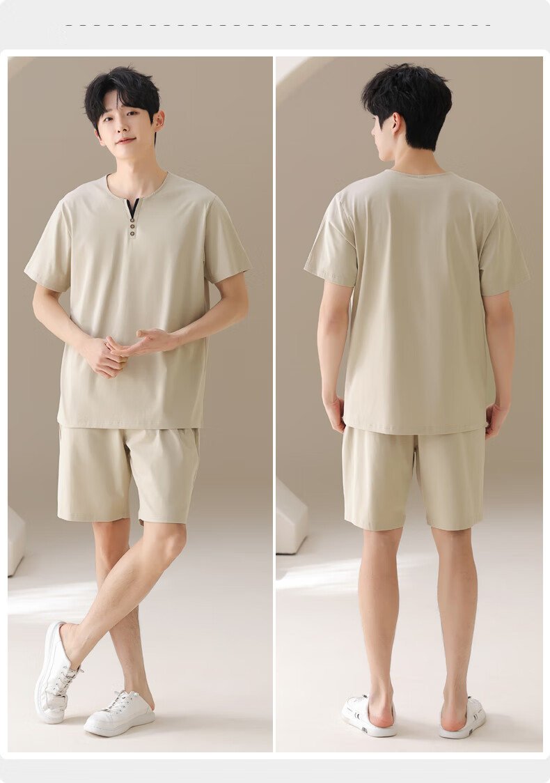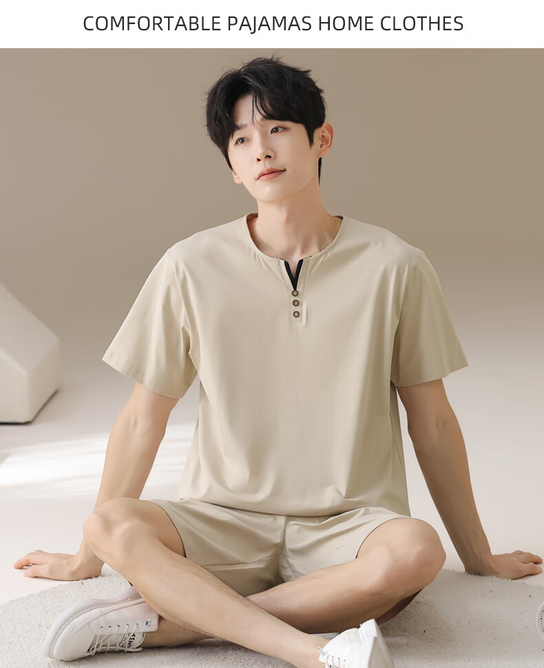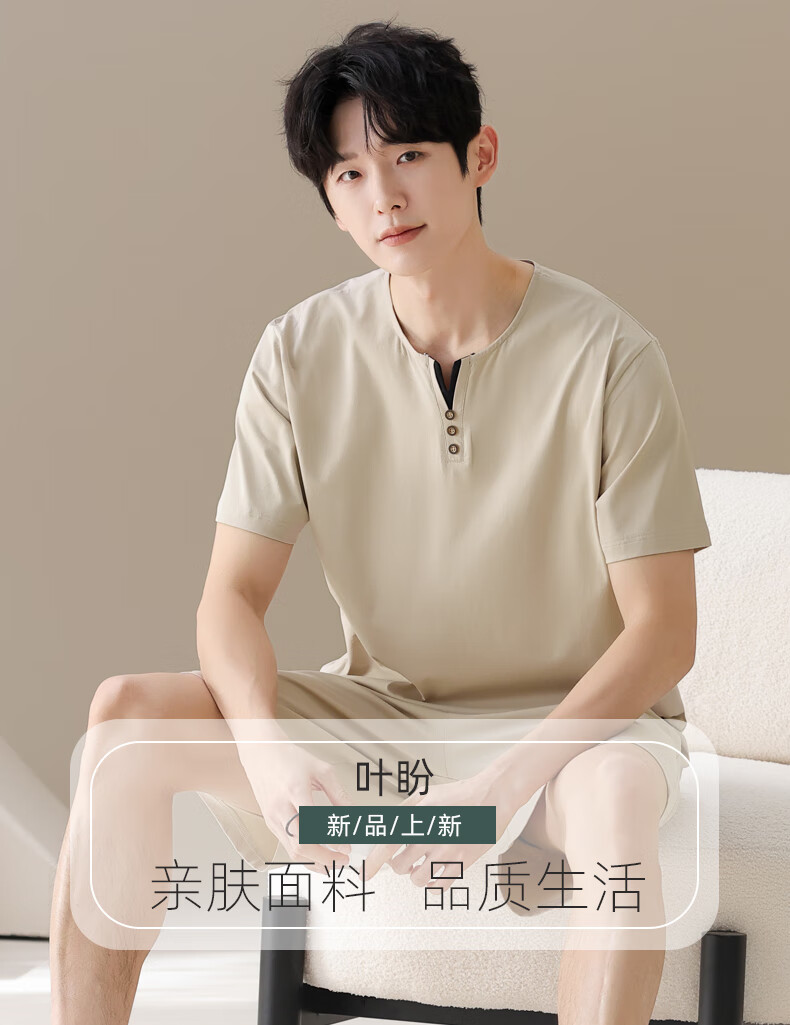 叶盼(yepan)男士睡衣男青少年纯棉2026新款春夏季短袖短裤套头休闲家居服套装 72122-米灰 L (170) :建议100-120斤穿着