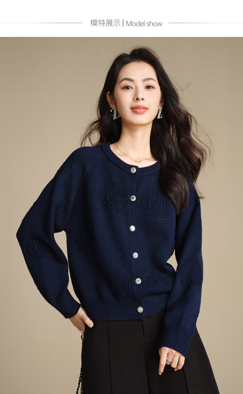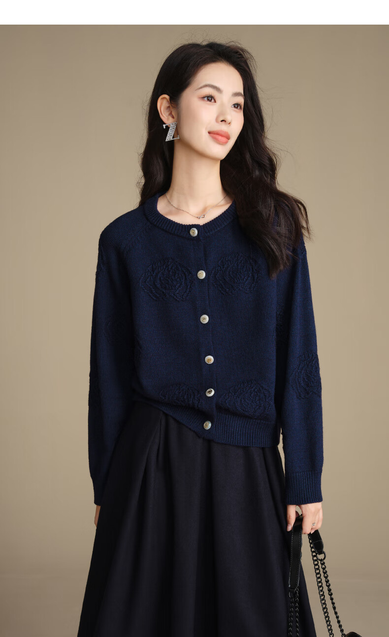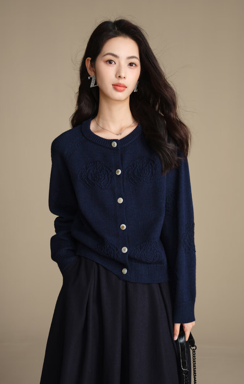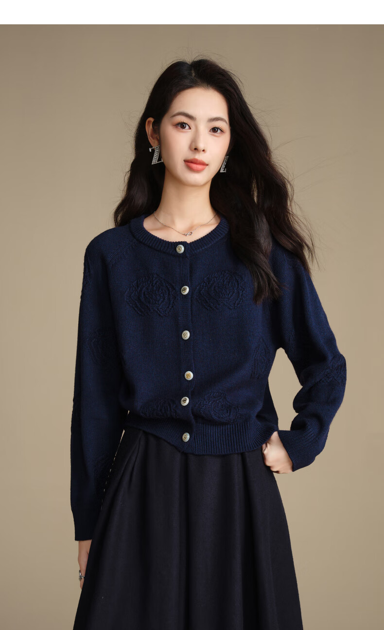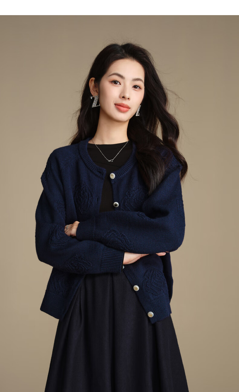 晚白【新品】2026春款含羊毛圆领纯色上衣宽松大码气质短针织开衫女 深蓝色 L