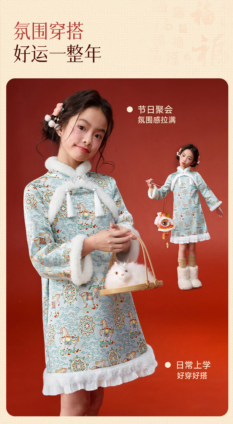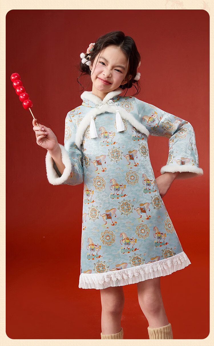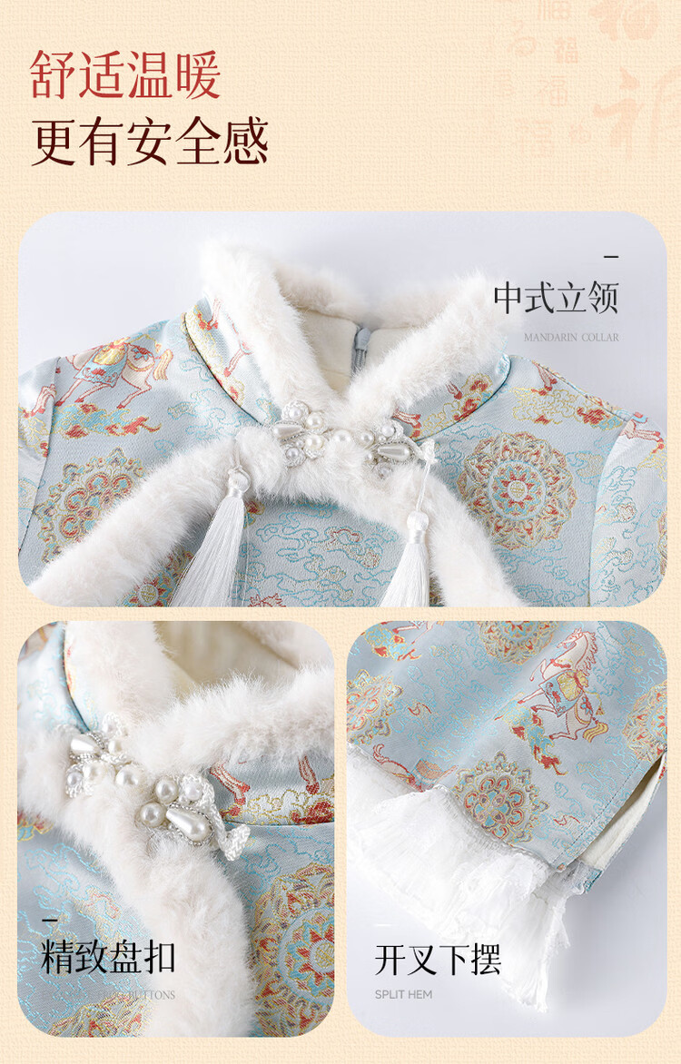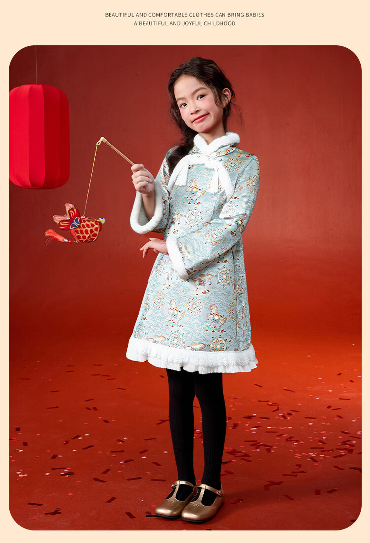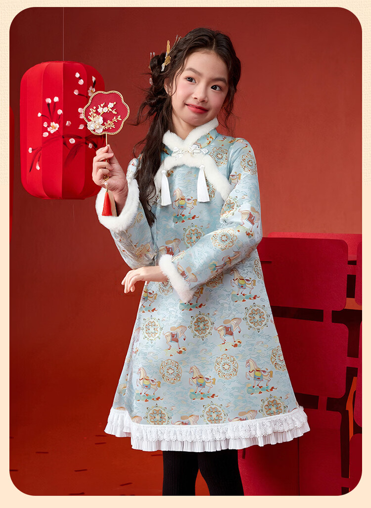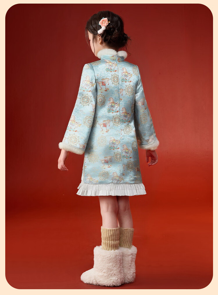 媛媛公主【马到成功】女童新中式加绒旗袍裙25冬新款儿童洋气保暖拜年服 薄荷绿 110