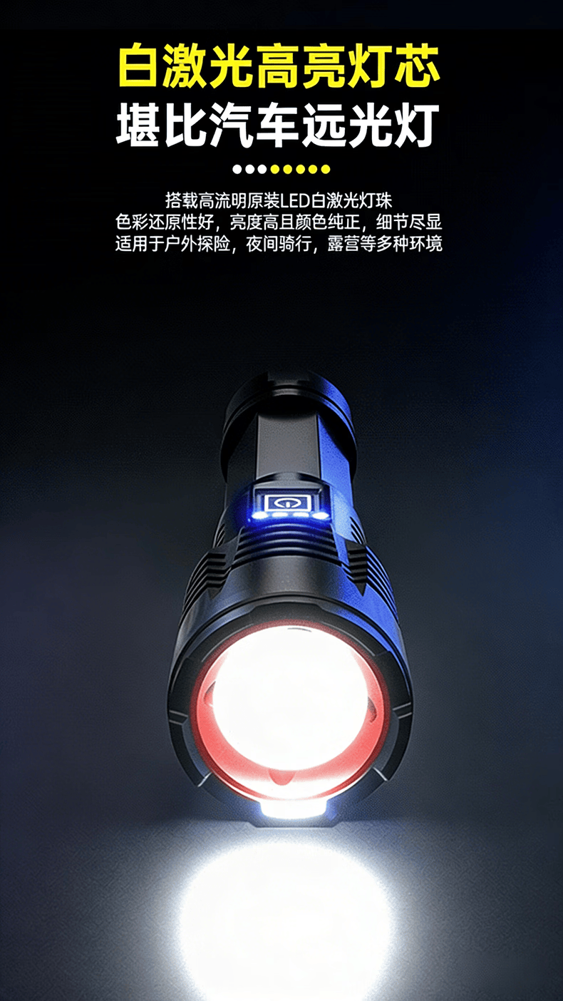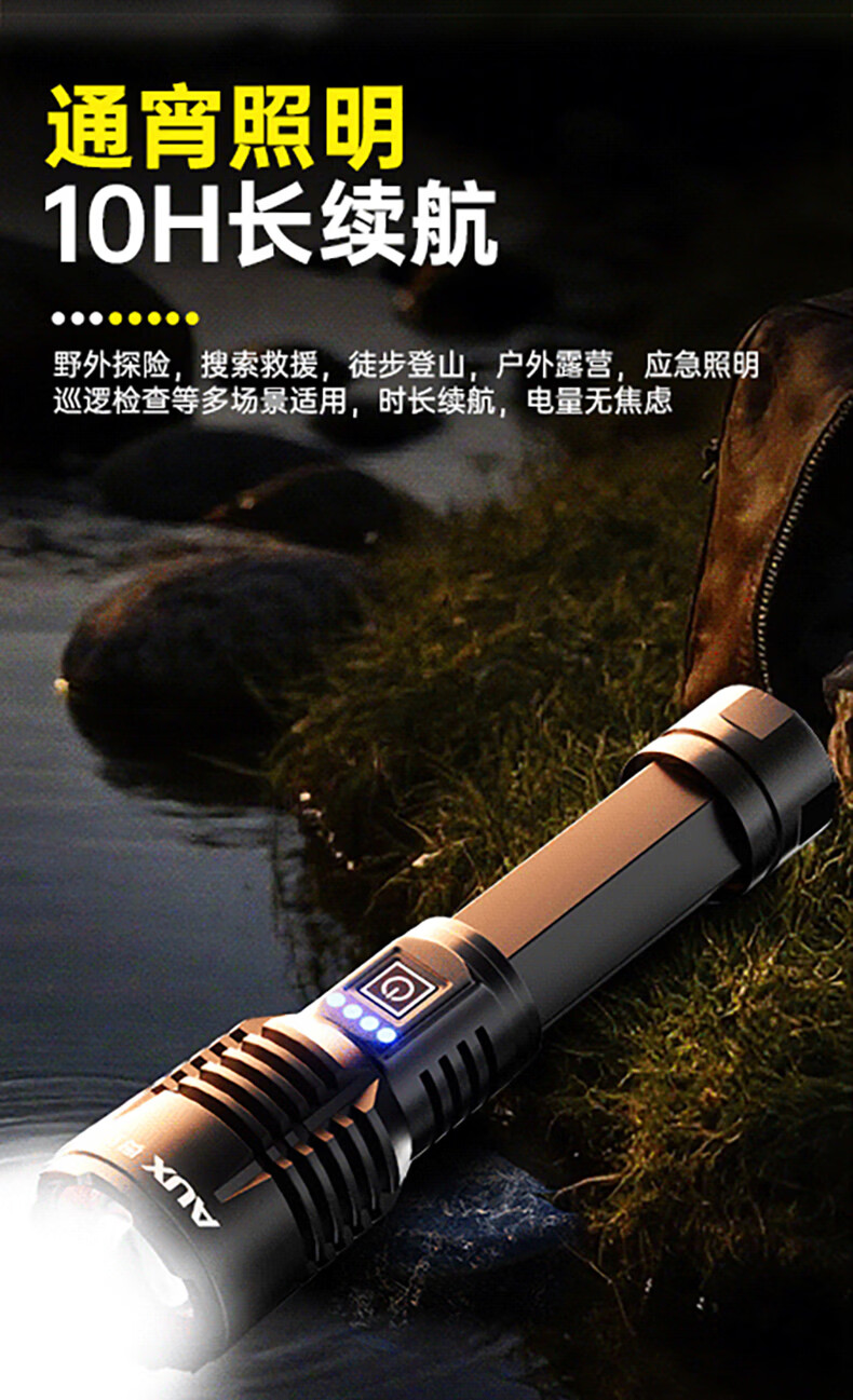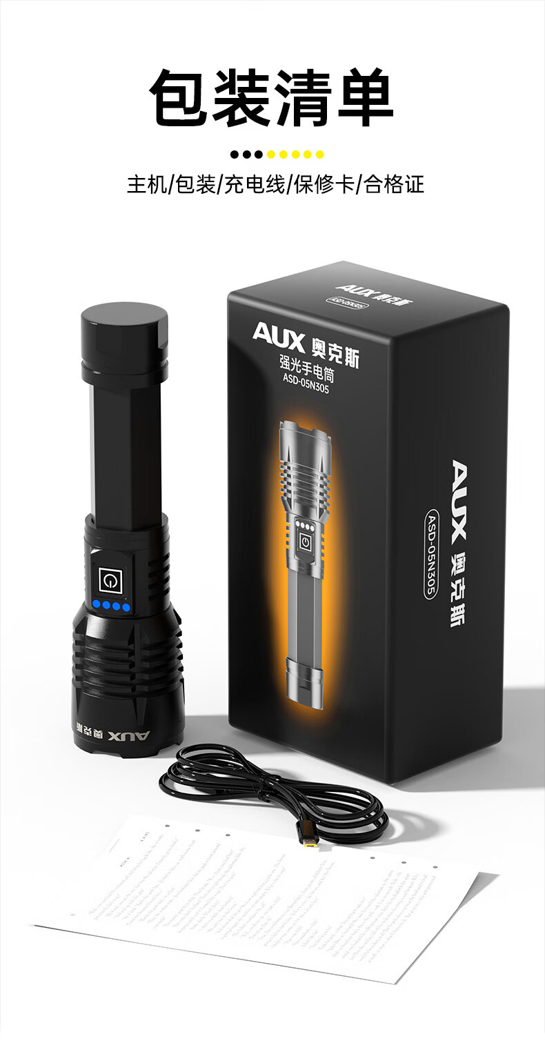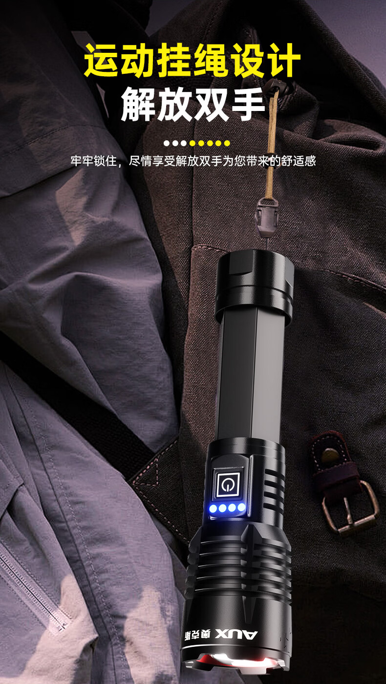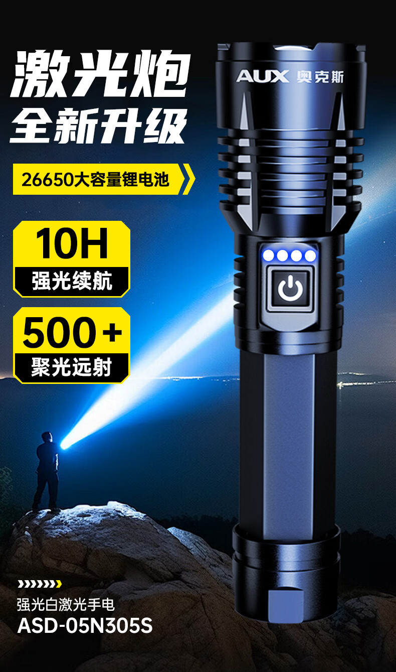 奥克斯强光手电筒超亮变焦远射长续航白激光便携军户外骑行家应急专用灯
