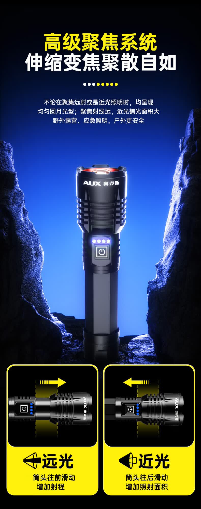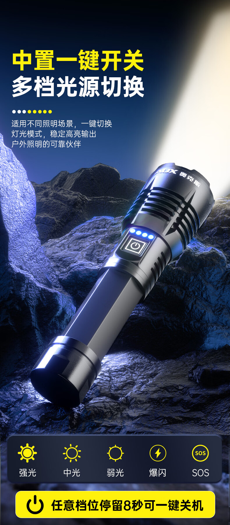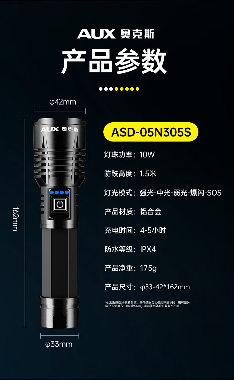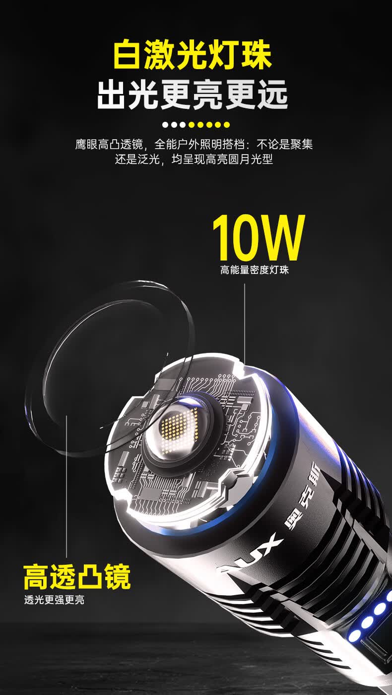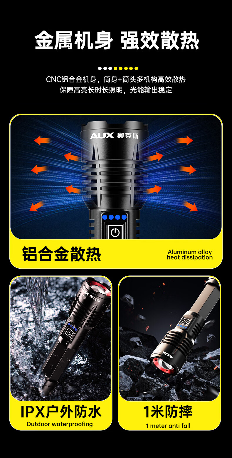 奥克斯强光手电筒超亮变焦远射长续航白激光便携军户外骑行家应急专用灯