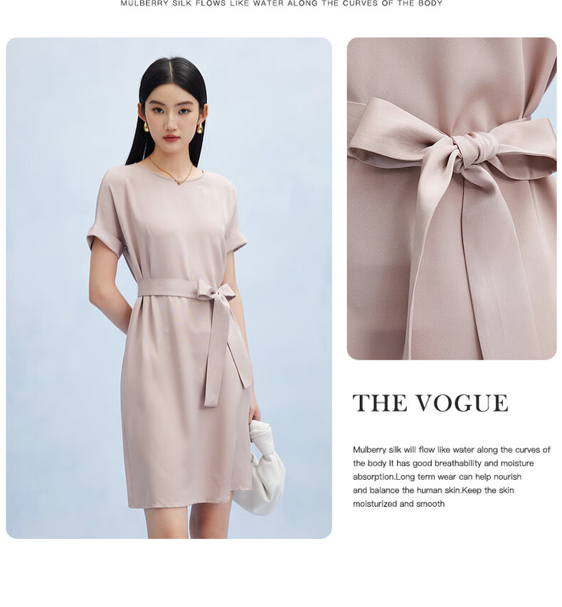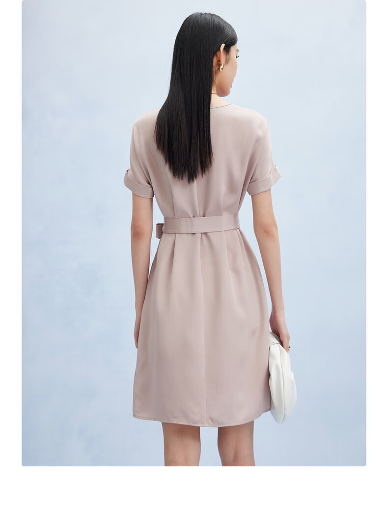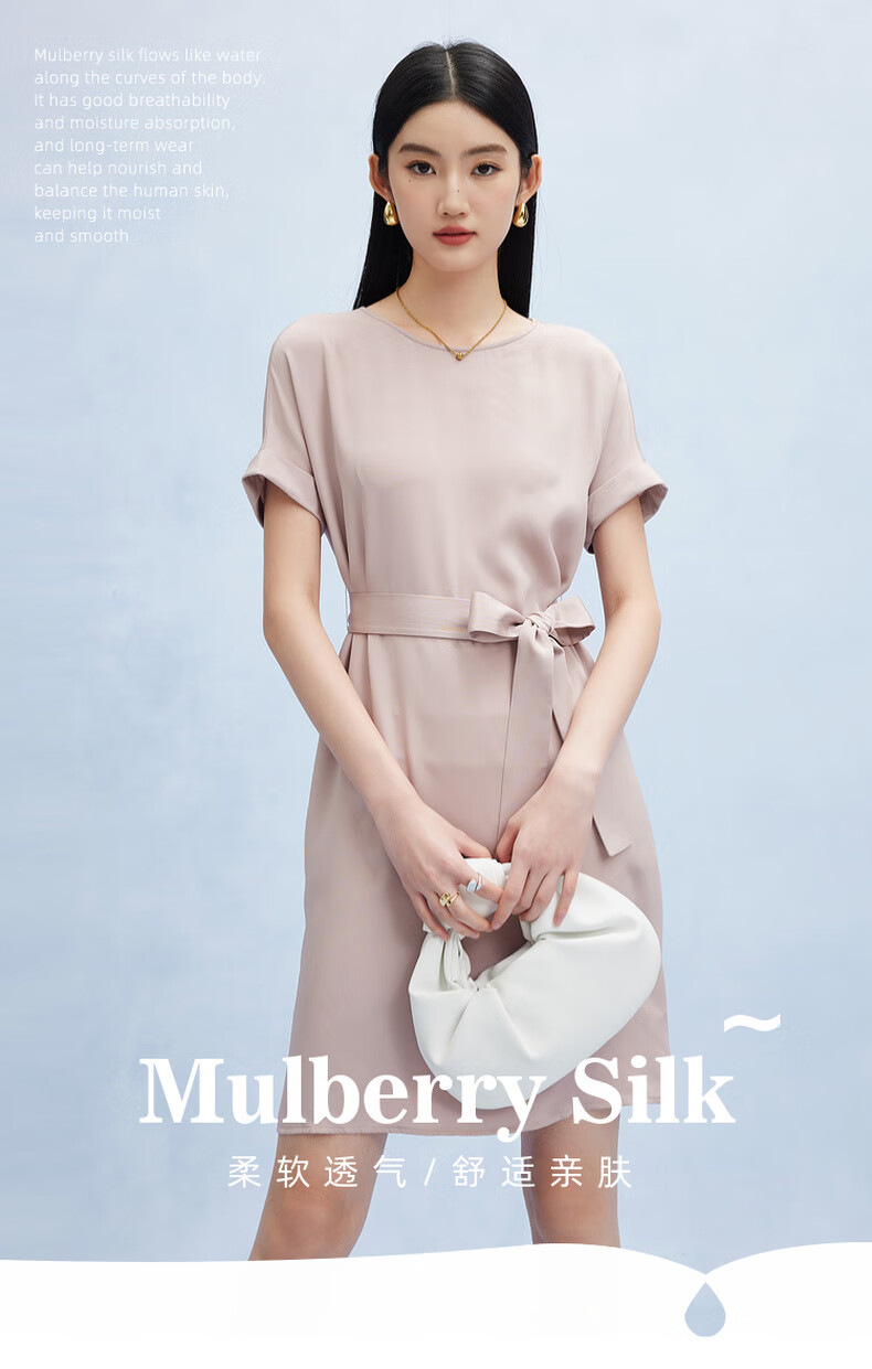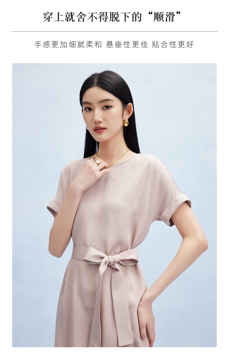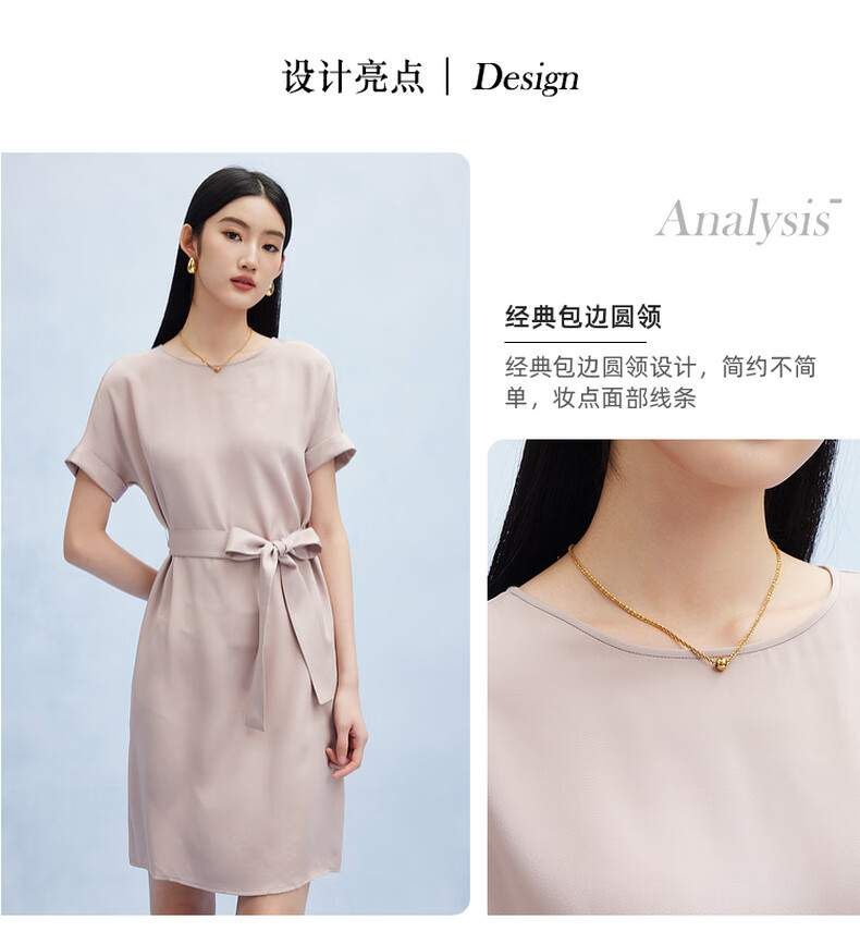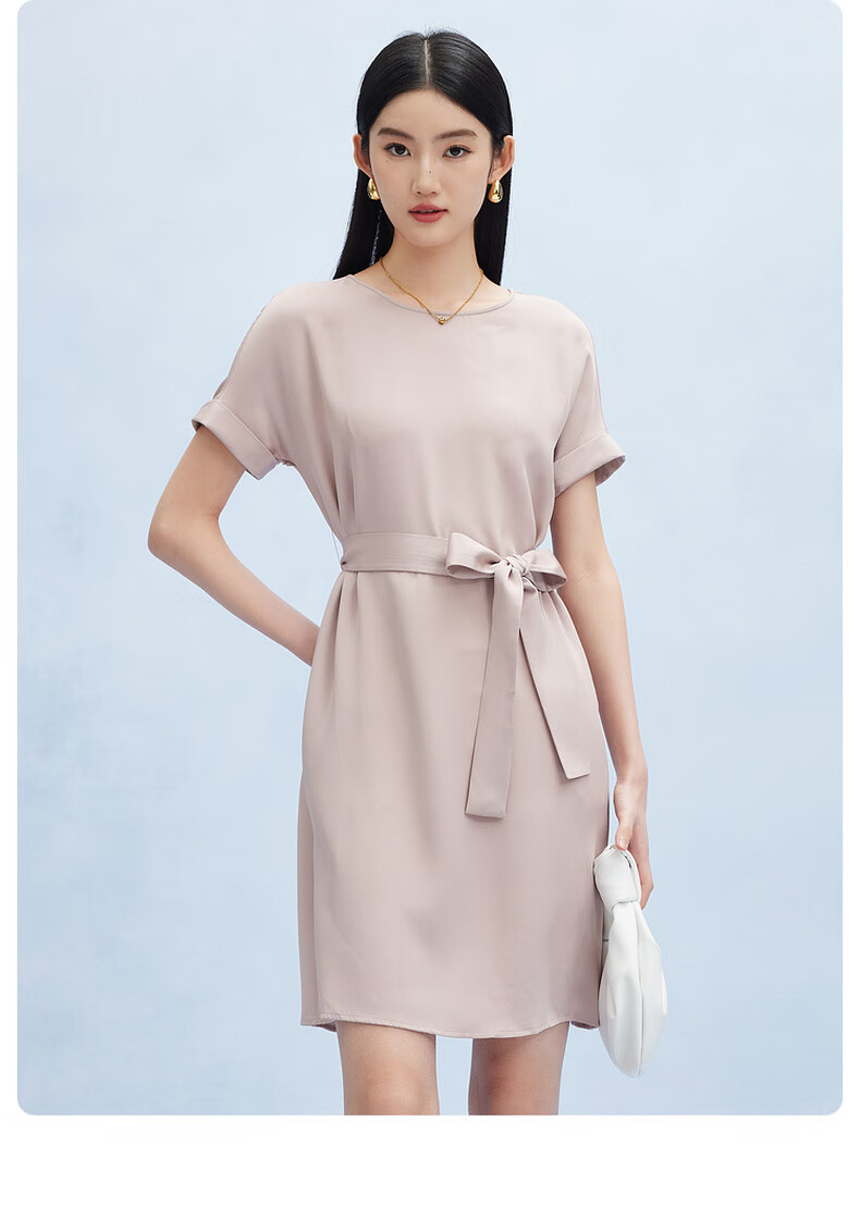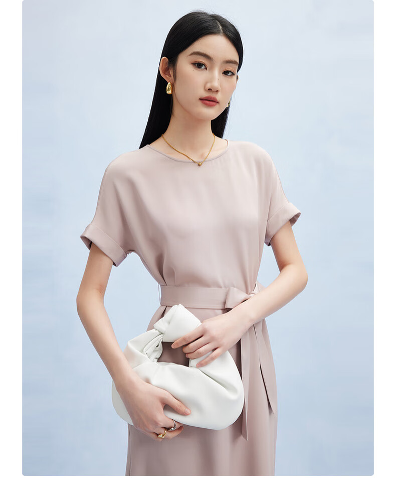 帕罗(PALUOPO)新款22姆米重绉圆领纯色短袖连衣裙重磅真丝高腰销售系带淑女裙子 粉紫 S (155/80A)