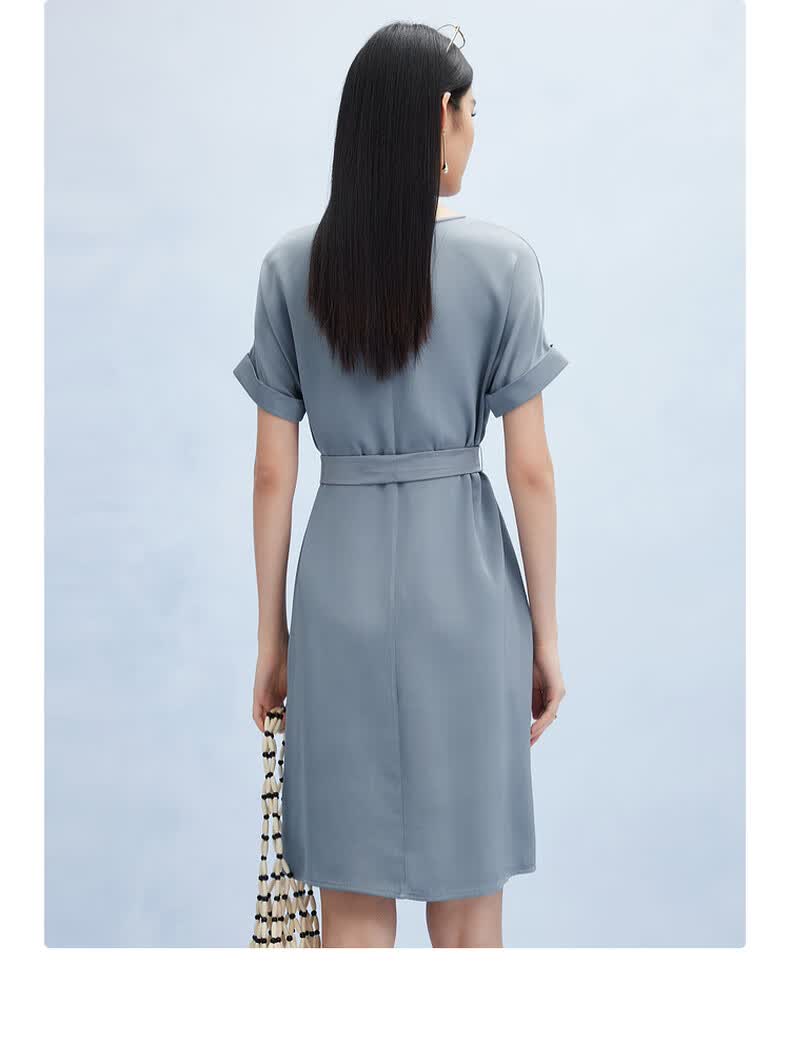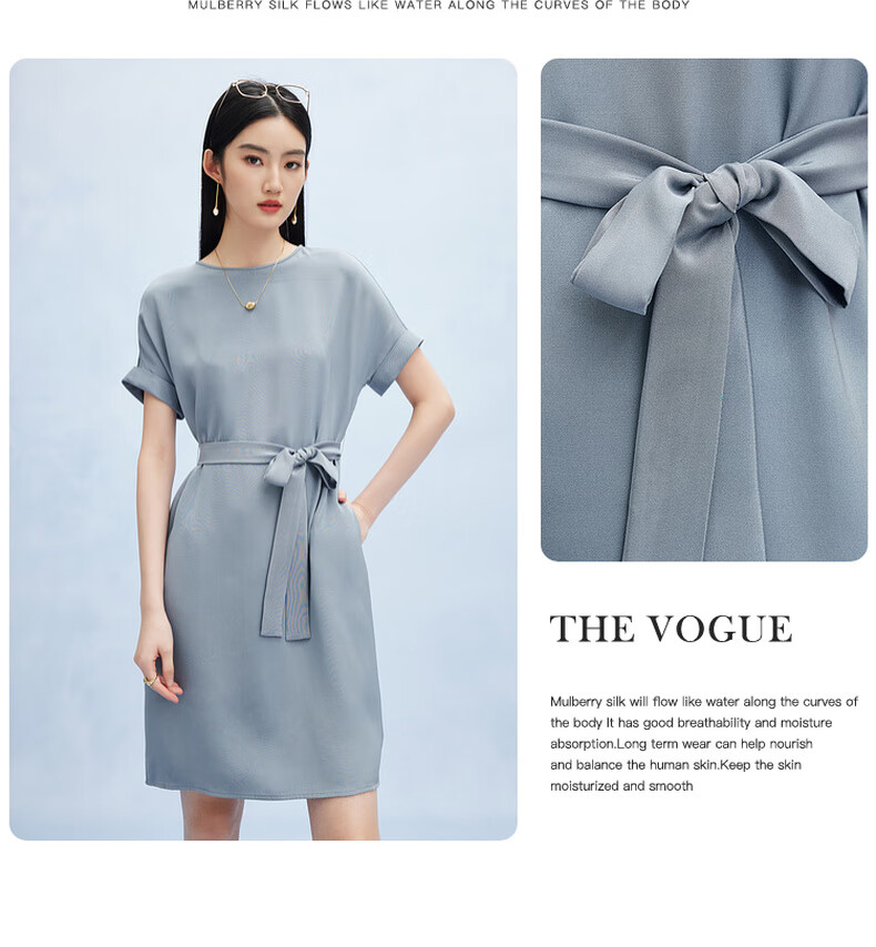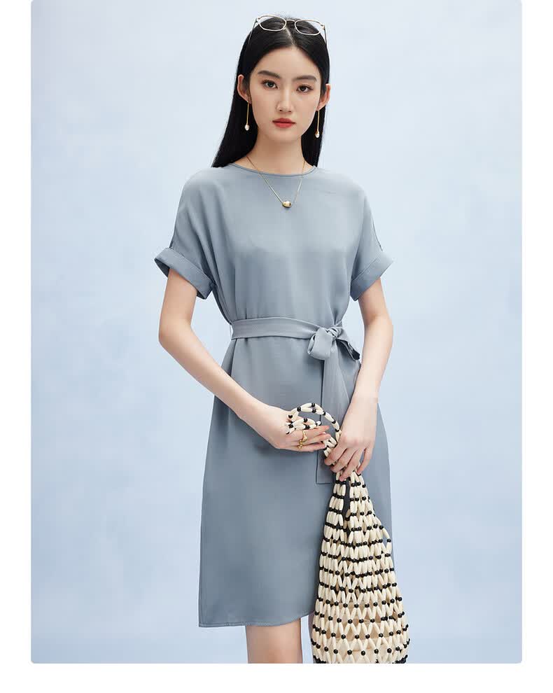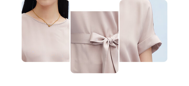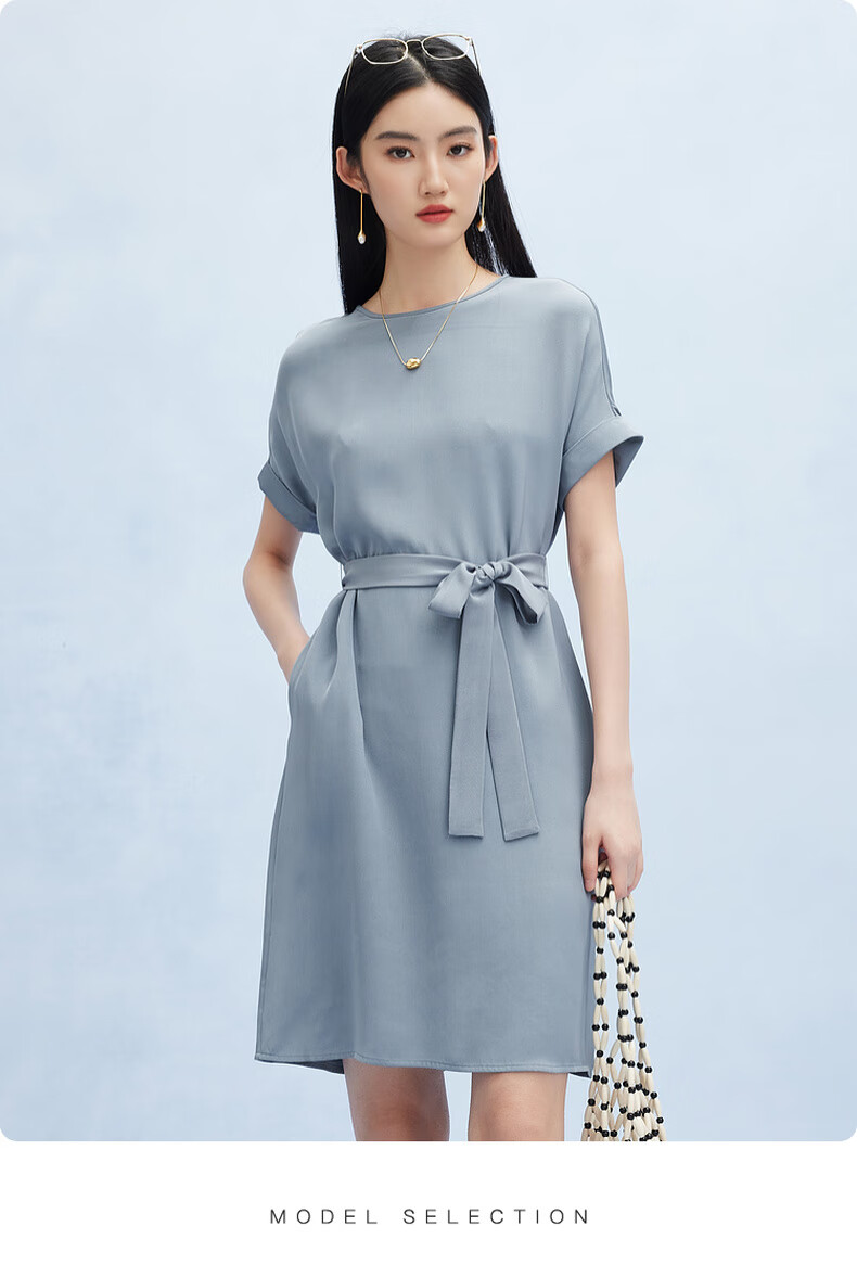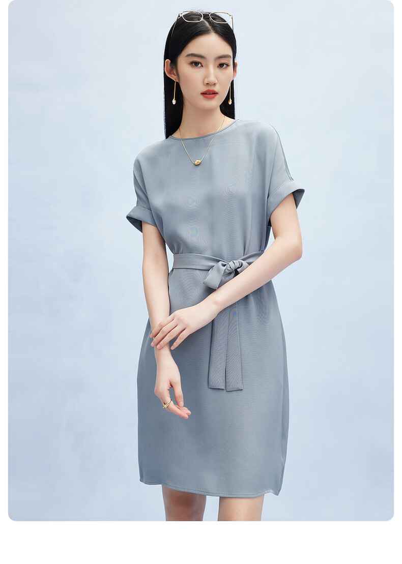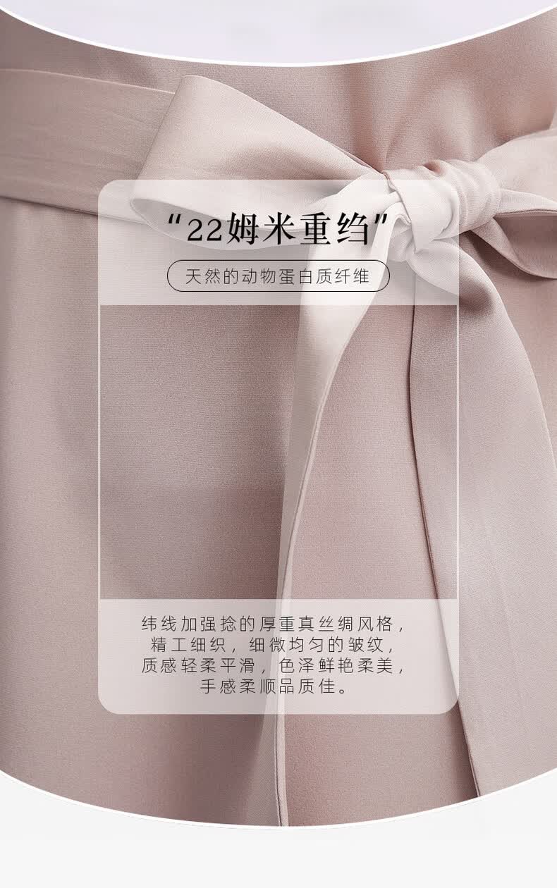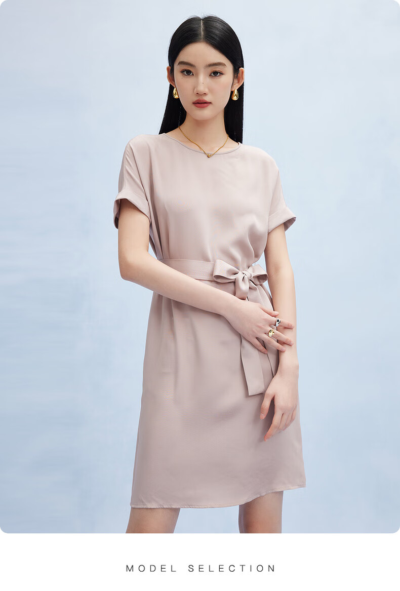 帕罗(PALUOPO)新款22姆米重绉圆领纯色短袖连衣裙重磅真丝高腰销售系带淑女裙子 粉紫 S (155/80A)