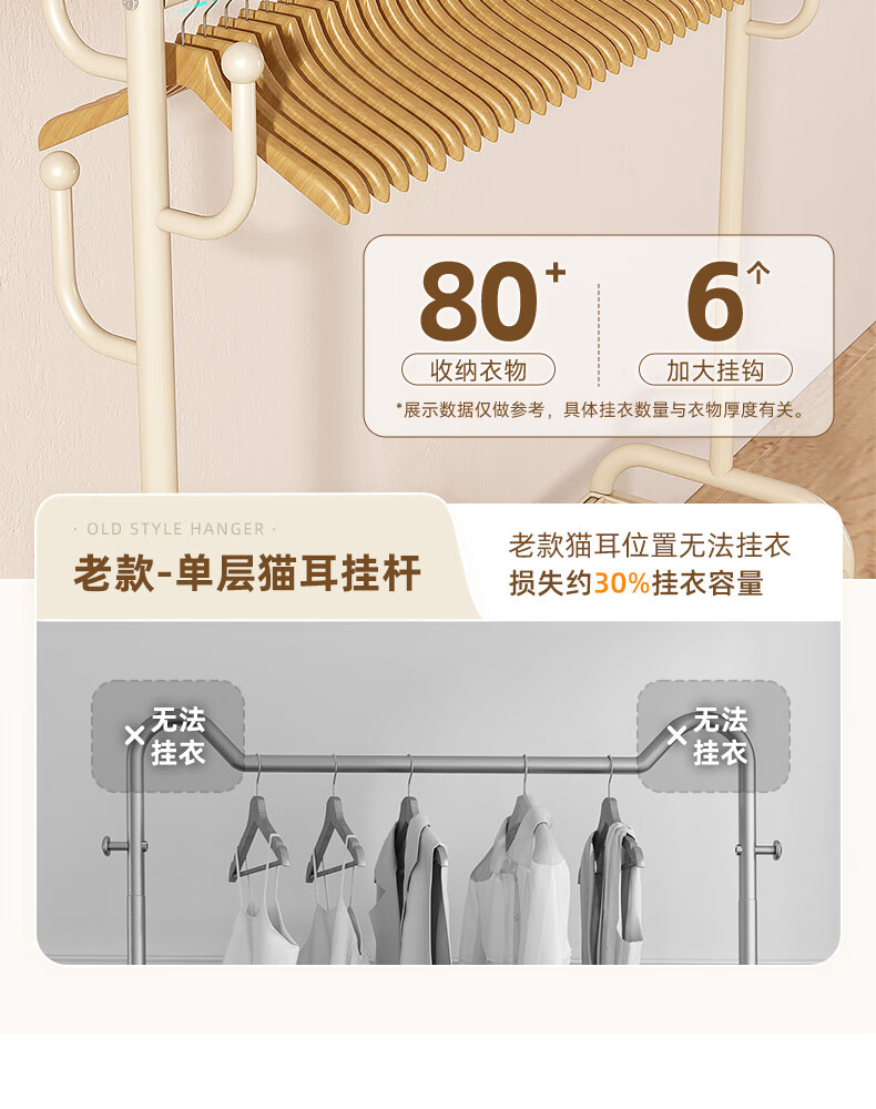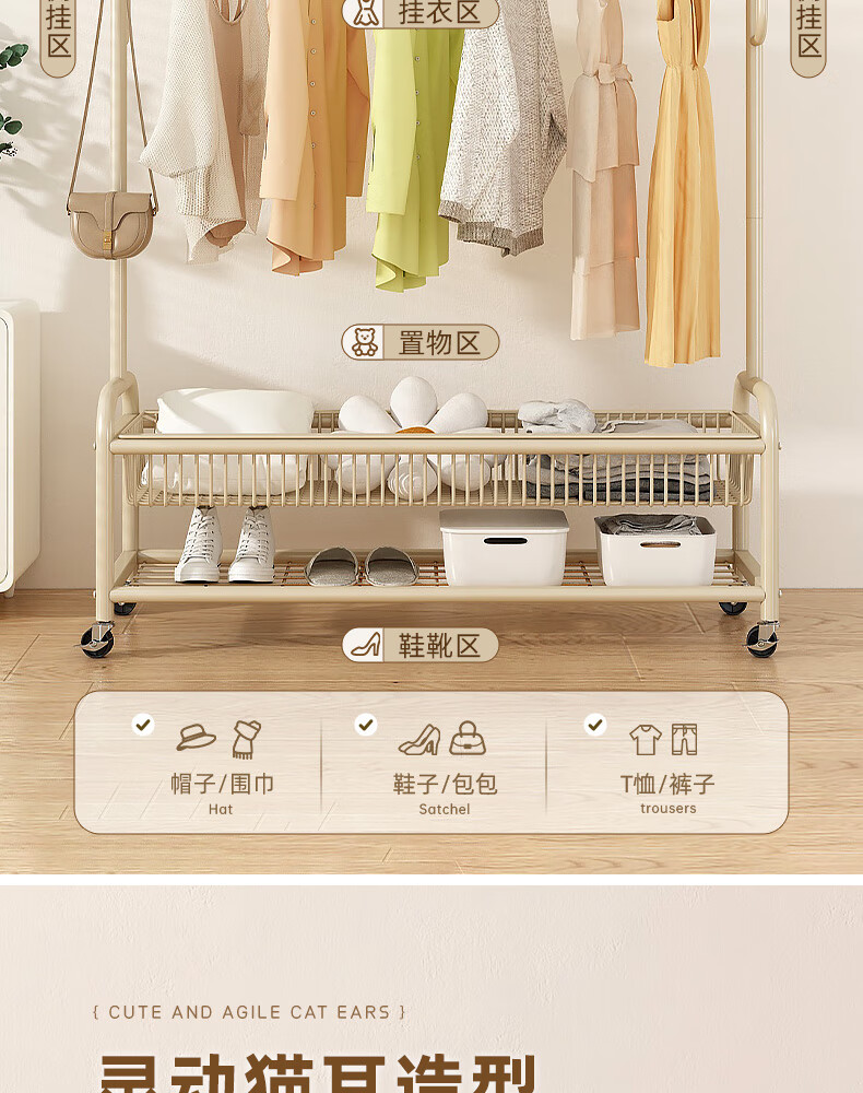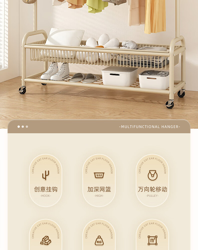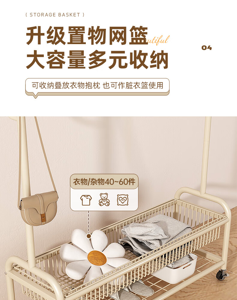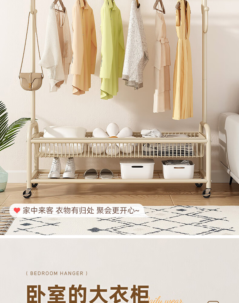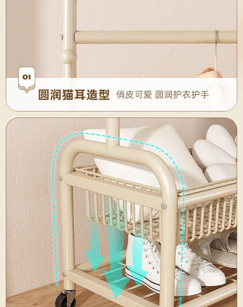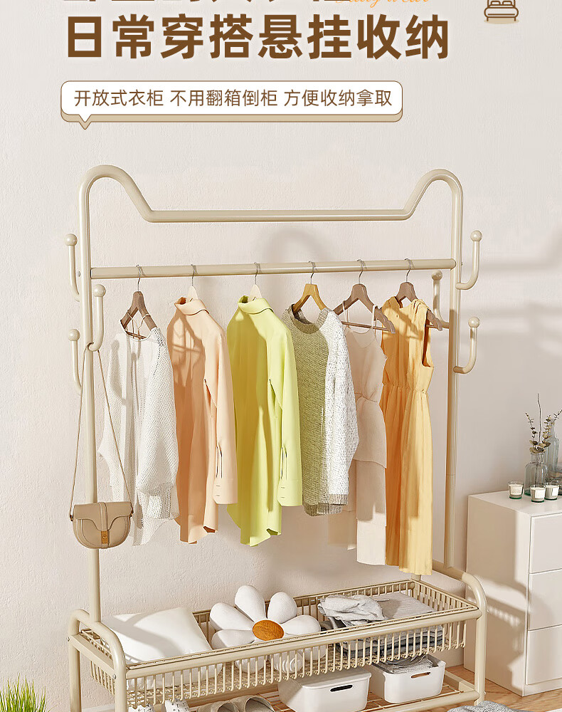 苏沐瞳挂衣架落地家用简易衣帽架奶油风单杆晾衣服架卧室收纳衣服架子 加粗-奶油白60cm【单层置物架】