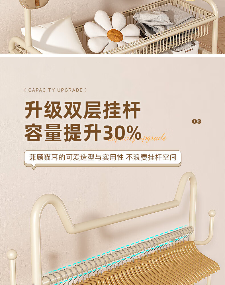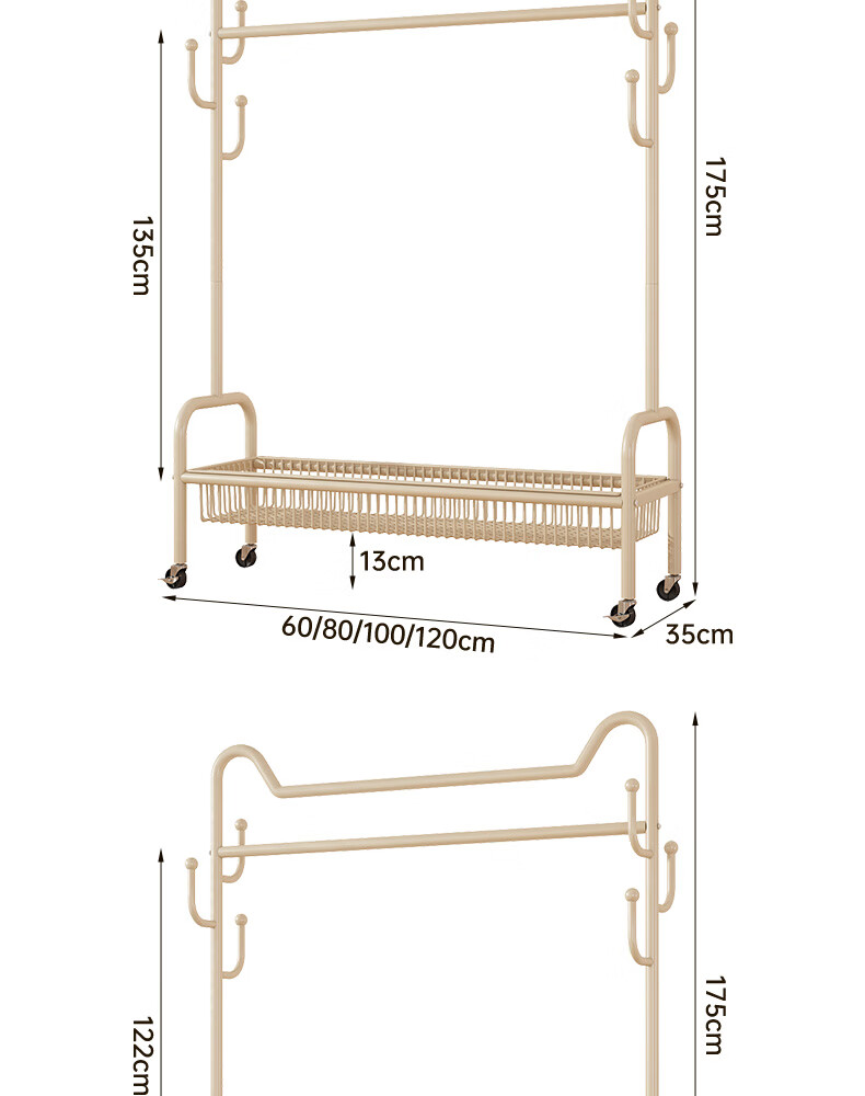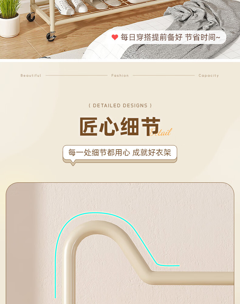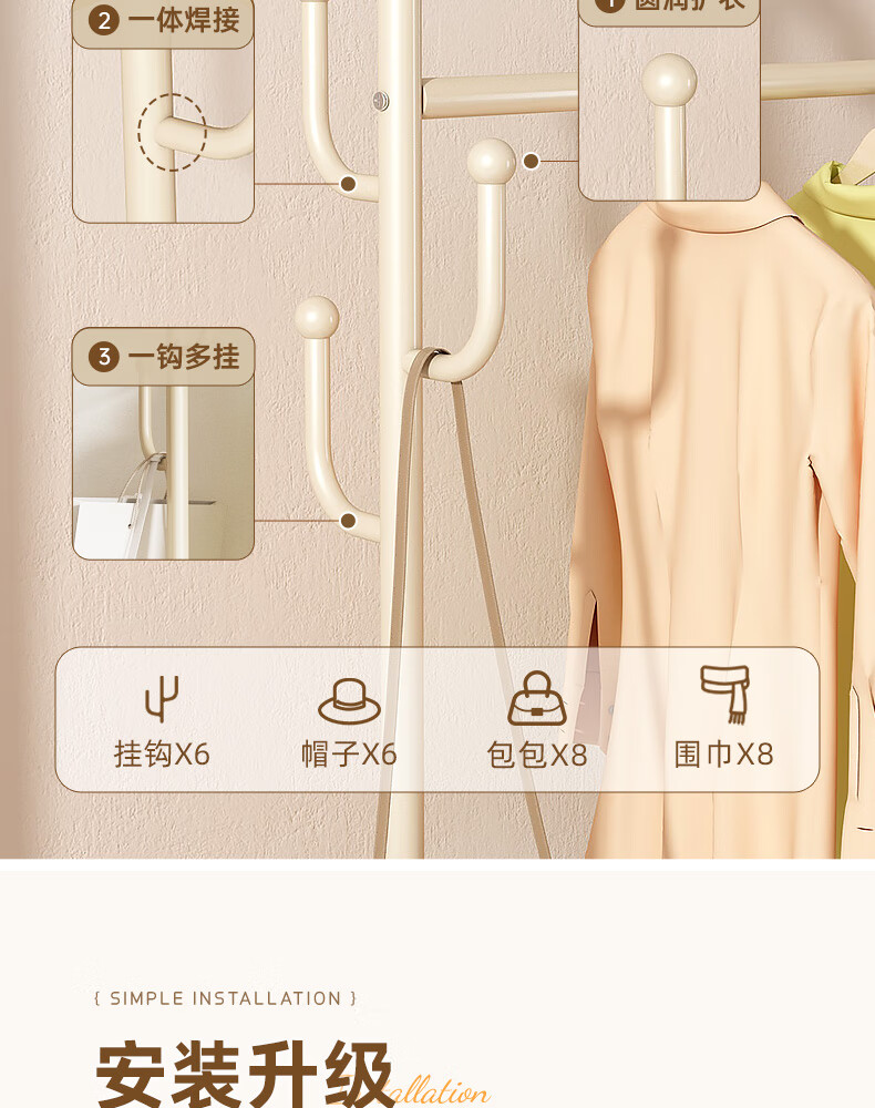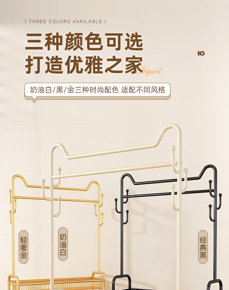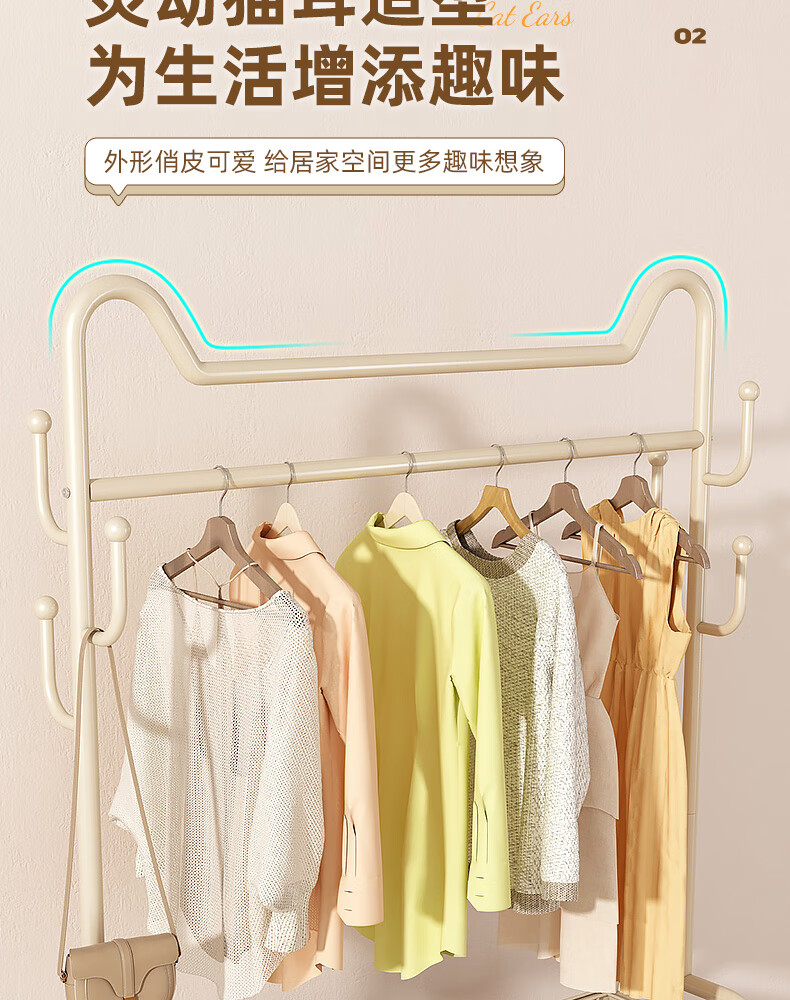 苏沐瞳挂衣架落地家用简易衣帽架奶油风单杆晾衣服架卧室收纳衣服架子 加粗-奶油白60cm【单层置物架】