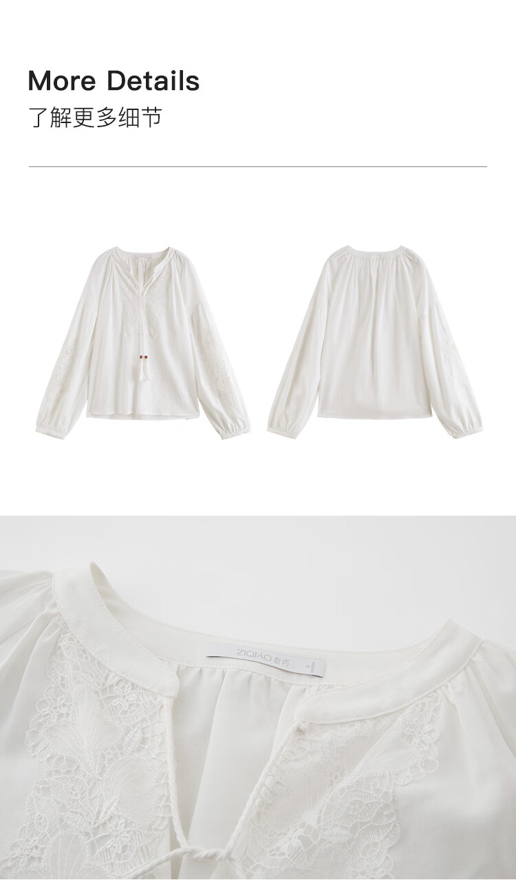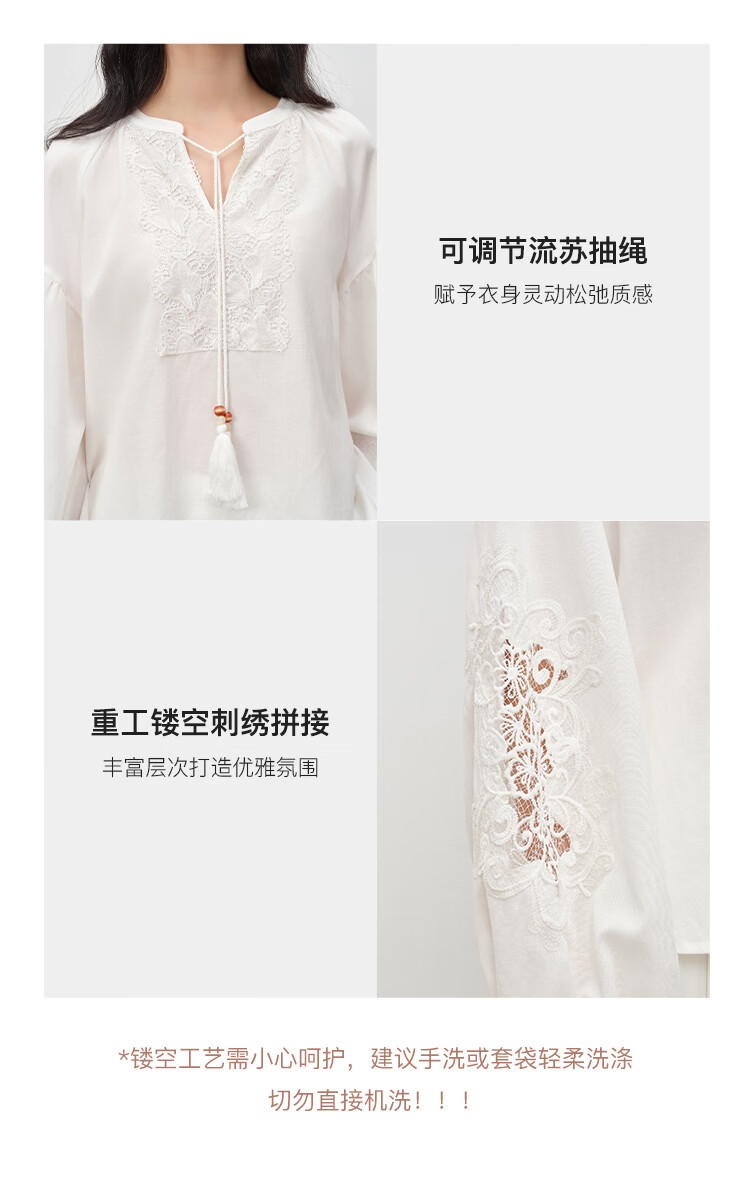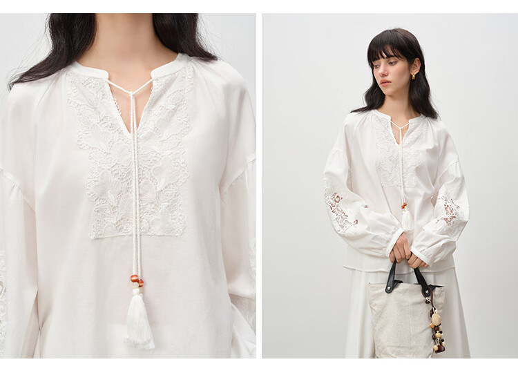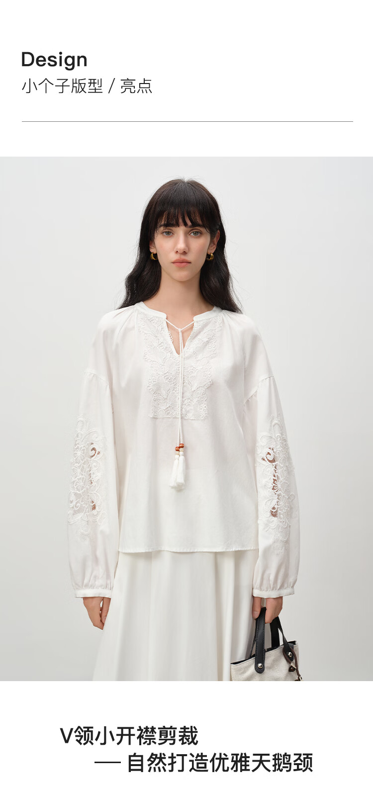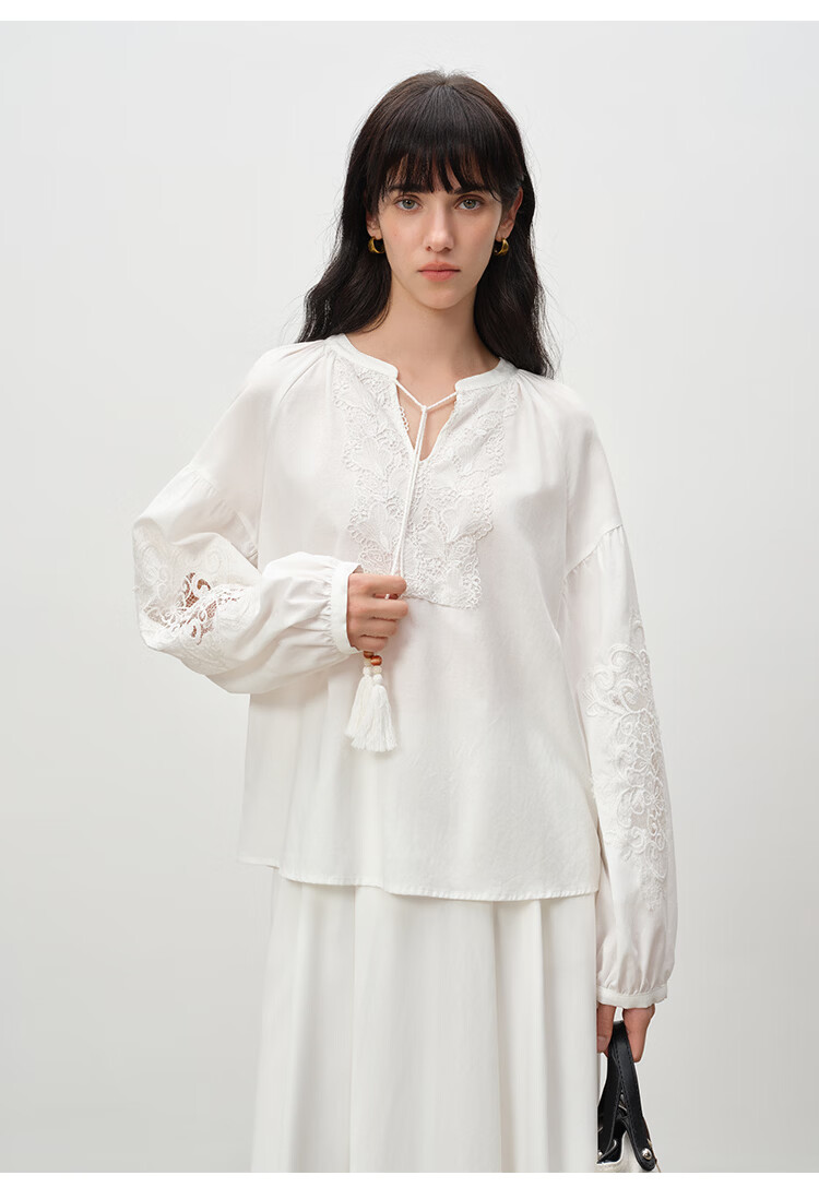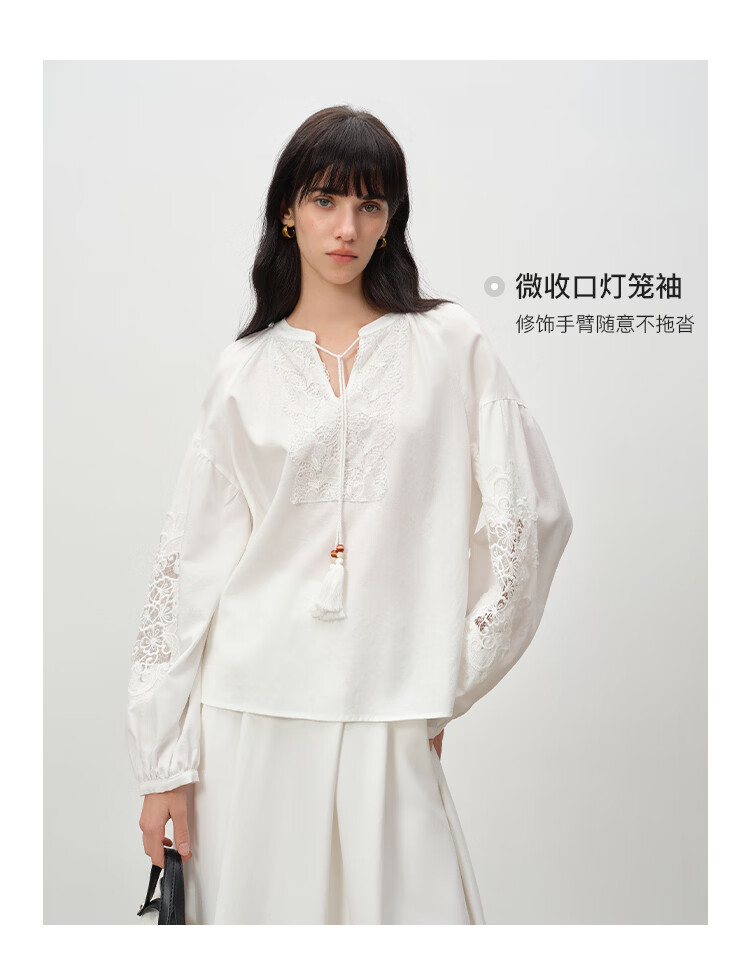 自巧小个子镂空刺绣拼接衬衫V领灯笼袖流苏抽绳上衣女2026春新品 雅白色 XXS (尺码:1)